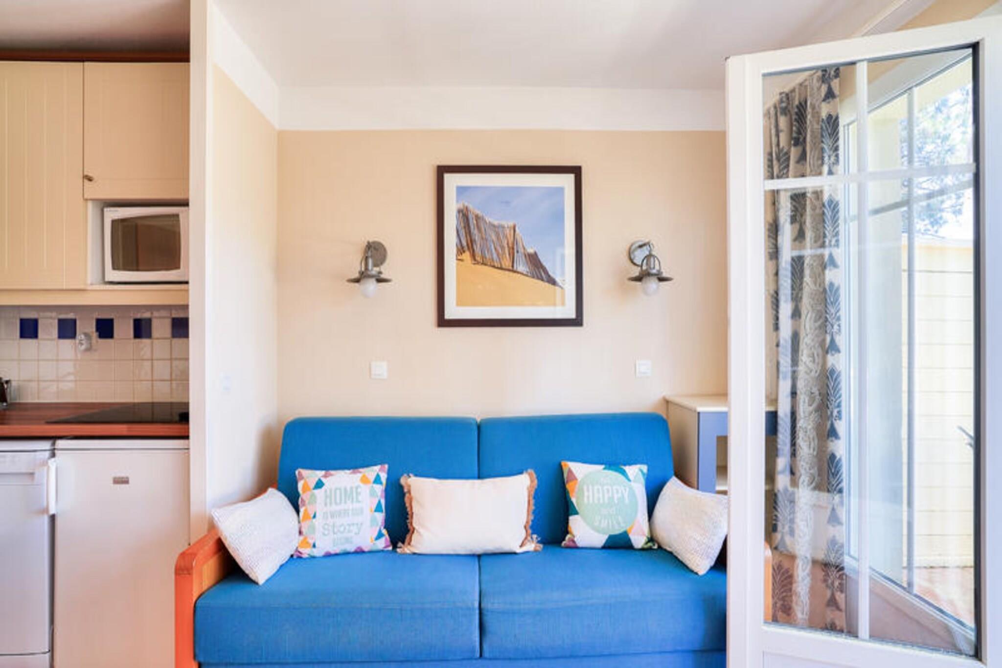 Inbäddat i en fridfull 5 hektar stor tallskog, erbjuder denna charmiga semesterlägenhet en mysig oas för upp till fyra gäster. Lägenheten har ett sovrum med två enkelsängar, en bekväm bäddsoffa i vardagsrummet och en fridfull balkong med utsikt över skogen. Gästerna kan njuta av moderna bekvämligheter som gratis utomhusparkering och valfritt husdjursvänligt boende mot en extra avgift. Boendet har även tillgång till en stor utomhuspool och plaskdamm, som är säsongsöppen från maj till september. Denna fastighet ligger bara 2 km från sandstränderna i Lacanau och nära två kända golfbanor, och är en fristad för friluftsentusiaster. Cykelentusiaster kommer att uppskatta de närliggande natursköna stigarna, medan vattensportälskare kan ägna sig åt surfing, paddleboard eller bodyboarding. Det omgivande området erbjuder en rad familjevänliga aktiviteter, inklusive yogaklasser, lekplatser och en boulebana. Gästerna kan också utforska de charmiga lokala kaféerna och marknaderna, perfekta för att prova regionala specialiteter. Lägenheten har ett välutrustat halvöppet kök, komplett med ett matbord och stolar för fyra. Badrummet har ett badkar med duschpelare, en elektrisk handdukstork och gott om förvaringsutrymme. En separat toalett ger gästerna bekvämlighet. Ytterligare tjänster som Wi-Fi, babykit, sängkläder och handdukar är tillgängliga för en nominell avgift, vilket garanterar en bekväm och stressfri vistelse.