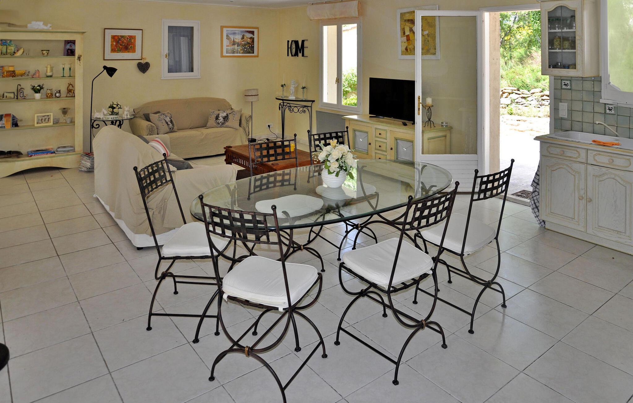 Denna semestervilla ligger nära de charmiga byarna Bonnieux och Ménerbes i Lacoste och erbjuder en fridfull tillflyktsort omgiven av natur, bara 1,5 km från byns centrum med affärer och restauranger. Villan ligger helt på marknivå. Vardagsrummet består av ett kombinerat kök, matsal och vardagsrum. Franska fönster vetter ut mot terrassen. Utomhus finns en inhägnad, grön trädgård med olivträd, lindar, plommonträd och fikonträd. En rymlig, skuggig terrass med grill erbjuder direkt tillgång till köket / matsalen. Villan har en privat, inhägnad pool (10 x 5 meter), som är säkrad med ett staket och har ett maximalt djup på 1,70 meter. Fastigheten ligger på landsbygden, ca 1,5 km från byns centrum där du hittar lokala butiker: Bageri, bar-restaurang. Det är nära till byarna Ménerbes, Bonnieux, Gordes och Roussillon och inte långt till byarna i Pays des Sorgues där floden La Sorgue flyter fram: Fontaine de Vaucluse, Isle sur la Sorgue.