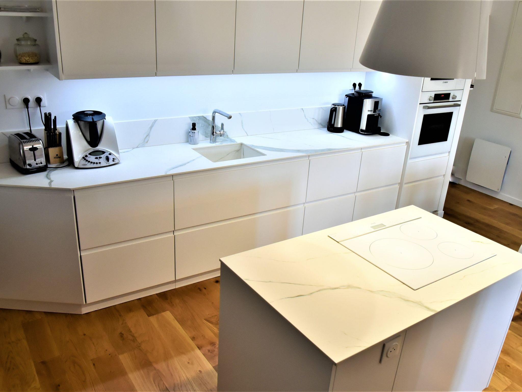 It opens onto the living room, and is sure to appeal to all cooks: Thermomix, bean-to-cup coffee machine, juicer, crepe maker... there's no shortage of equipment!