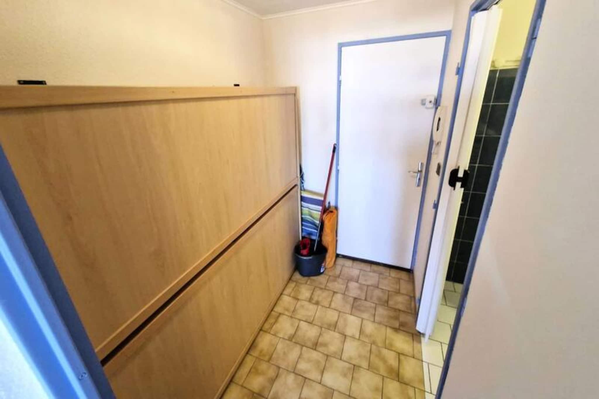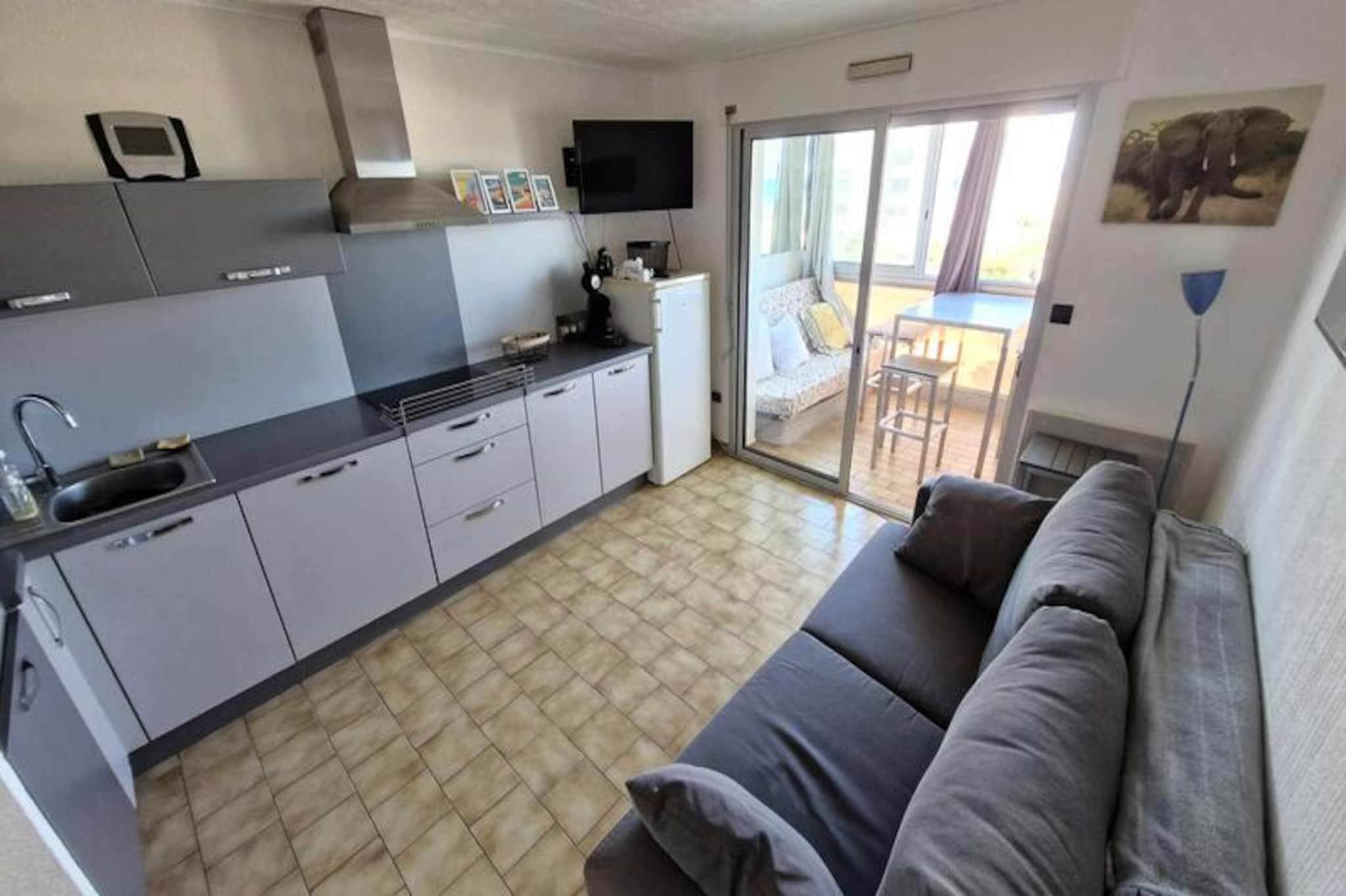 Vakna till det lugnande ljudet av vågor och den milda havsbrisen i denna charmiga studio, perfekt belägen för att erbjuda hisnande utsikt över Medelhavet. Med sina nordostvända fönster flödar morgonljuset över utrymmet och skapar en varm och inbjudande atmosfär för din kustresa. Bara några steg från sandstranden är denna studio en idyllisk tillflyktsort för par eller små familjer som söker en lugn kustsemester. Den pulserande stadskärnan, full av butiker, restauranger och lokal charm, ligger bekvämt belägen bara 1 km bort, vilket säkerställer att du aldrig är långt från händelsernas centrum. \n\nStudioen är designad med komfort och praktiska egenskaper i åtanke och rymmer upp till fyra gäster. Vardagsrummet har en mysig bäddsoffa för två personer, medan sovplatsen erbjuder utfällbara våningssängar, vilket gör den idealisk för både avkoppling och vilsamma nätter. Moderna bekvämligheter, inklusive två TV-apparater, en keramikhäll, en kombinerad mikrovågsugn och ett rymligt kylskåp, säkerställer att du har allt du behöver för en problemfri vistelse. Den 25 m² stora planlösningen är noggrant utformad för att maximera utrymme och funktionalitet, medan läget på andra våningen, tillgängligt via hiss, ger en lugn utsiktspunkt för att njuta av den fantastiska havsutsikten. För extra bekvämlighet finns gemensam parkering bara 100 meter bort, vilket gör det enkelt att utforska omgivningarna. Oavsett om du promenerar längs stranden, njuter av färska skaldjur på närliggande restauranger eller bara njuter av solen, placerar denna studio dig i hjärtat av Medelhavslivsstilen. Låt kustens skönhet och komforten i denna välutrustade studio inspirera ditt nästa kustäventyr. Med stranden precis utanför dörren och den livliga stadskärnan inom räckhåll lovar varje ögonblick att bli oförglömligt.