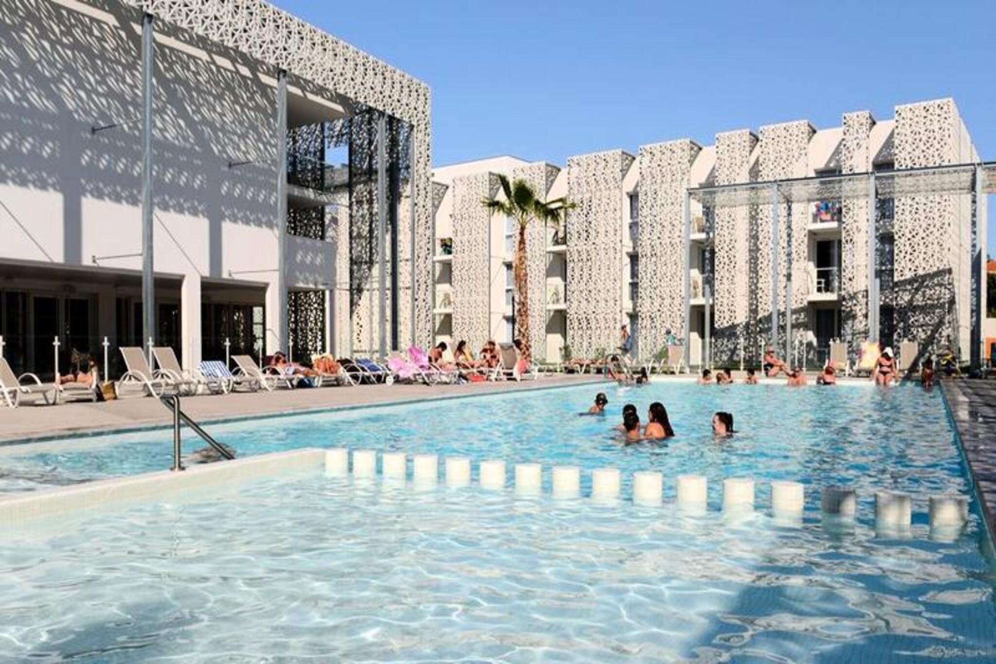 Bel?get i den livliga badorten Cap d'Agde, p? Languedoc-kusten, ?r detta residens idealiskt bel?get 150 meter fr?n stranden. Komplexet omfattar tre byggnader och frist?ende villor, som erbjuder hotellrum som betj?nas av en hiss och l?genheter f?r 2 till 8 personer. Residenset har en 150 m² stor pool med massagestr?lar och en plaskdamm, en h?lsoavdelning med fitnesscenter, hamam och bastu, samt en bar/restaurang med en terrass med utsikt ?ver poolen. Familjer kan njuta av lekomr?det f?r barn, medan aff?rsresen?rer kan anv?nda seminarierummet. Cap d'Agde ?r k?nt f?r sina 14 km fina sandstr?nder, tallskogar, sanddyner och vikar. Detta popul?ra resm?l kombinerar avkoppling och underh?llning, med livliga dag- och nattaktiviteter. Den n?rliggande antika staden Agde, en av Frankrikes ?ldsta st?der, erbjuder ett rikt historiskt och kulturellt arv, s?v?l som en k?nd levnadskonst och exceptionella lokala produkter, inklusive skaldjur och ving?rdar. Etagev?ningen i 2 plan har ett vardagsrum med en b?ddsoffa eller utdragbara s?ngar f?r tv?, ett utrustat k?k, tv? sovrum med dubbels?ngar eller enkels?ngar och en st?ngd hytt med tv? v?ningss?ngar. L?genheten har ?ven ett separat badrum och toalett. Ytterligare bekv?mligheter inkluderar gratis Wi-Fi, gratis parkering och inkluderade s?ngkl?der och handdukar. Husdjur ?r till?tna mot en extra avgift, och babykit finns p? beg?ran.