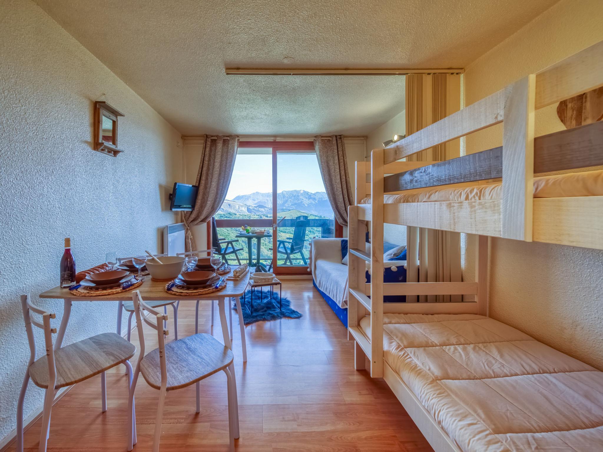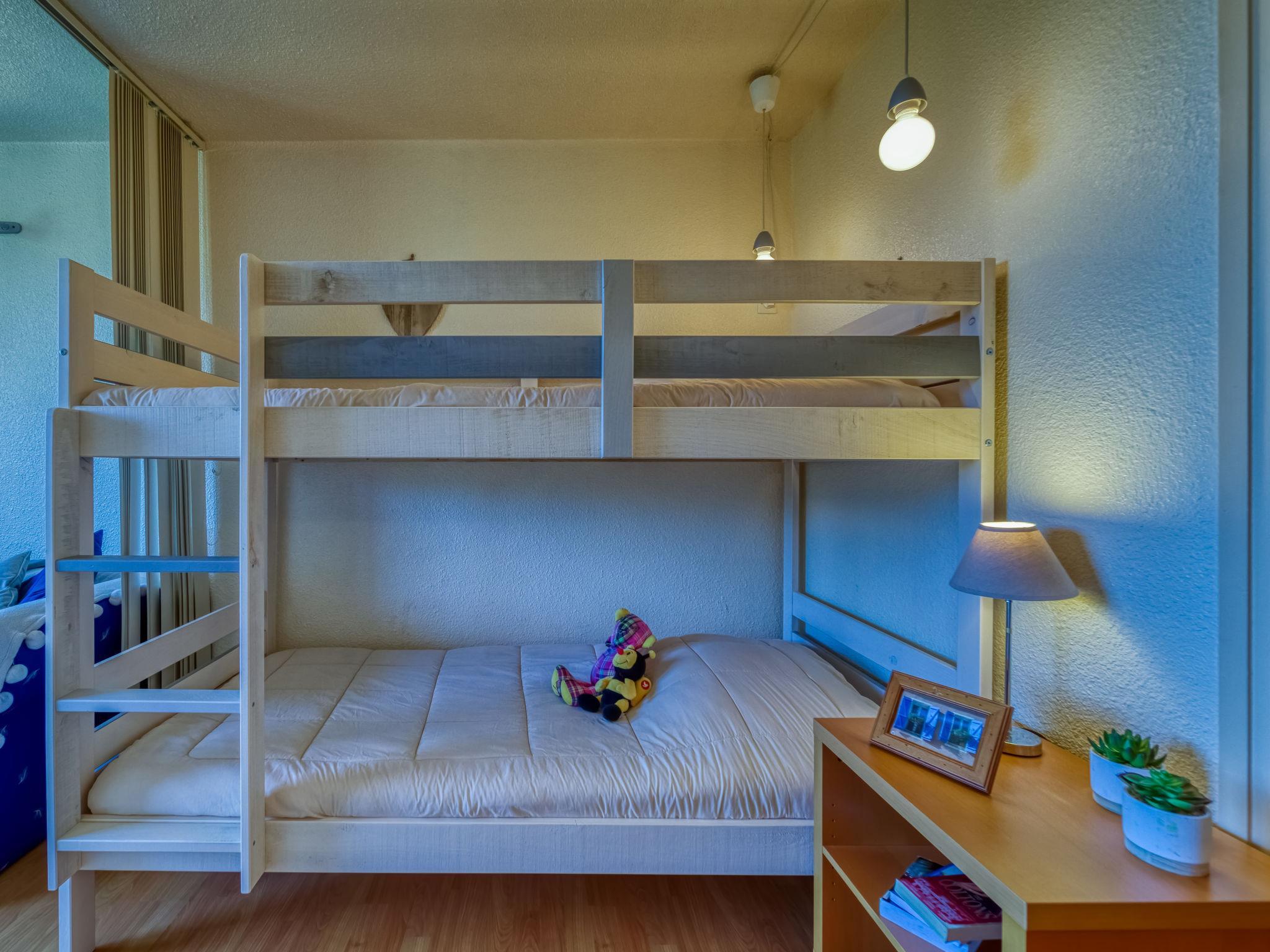1-room studio 22 m2 on 15th floor, north facing position. Simple and beautiful furnishings: living/dining room with 1 double sofabed (140 cm, length 190 cm), 1 x 2 bunk beds (90 cm, length 190 cm), TV (flat screen). Small kitchenette (2 hot plates, oven, toaster, kettle, microwave, electric coffee machine, raclette grill). Bath/WC. Electric heating. Parquet floors. Balcony 4 m2, north facing position. Balcony furniture. View of the mountains and the valley. Facilities: Internet (WiFi, extra). Please note: non-smokers only. Smoke alarm. Offer by a private individual according to Art. 155, IV of CGI.