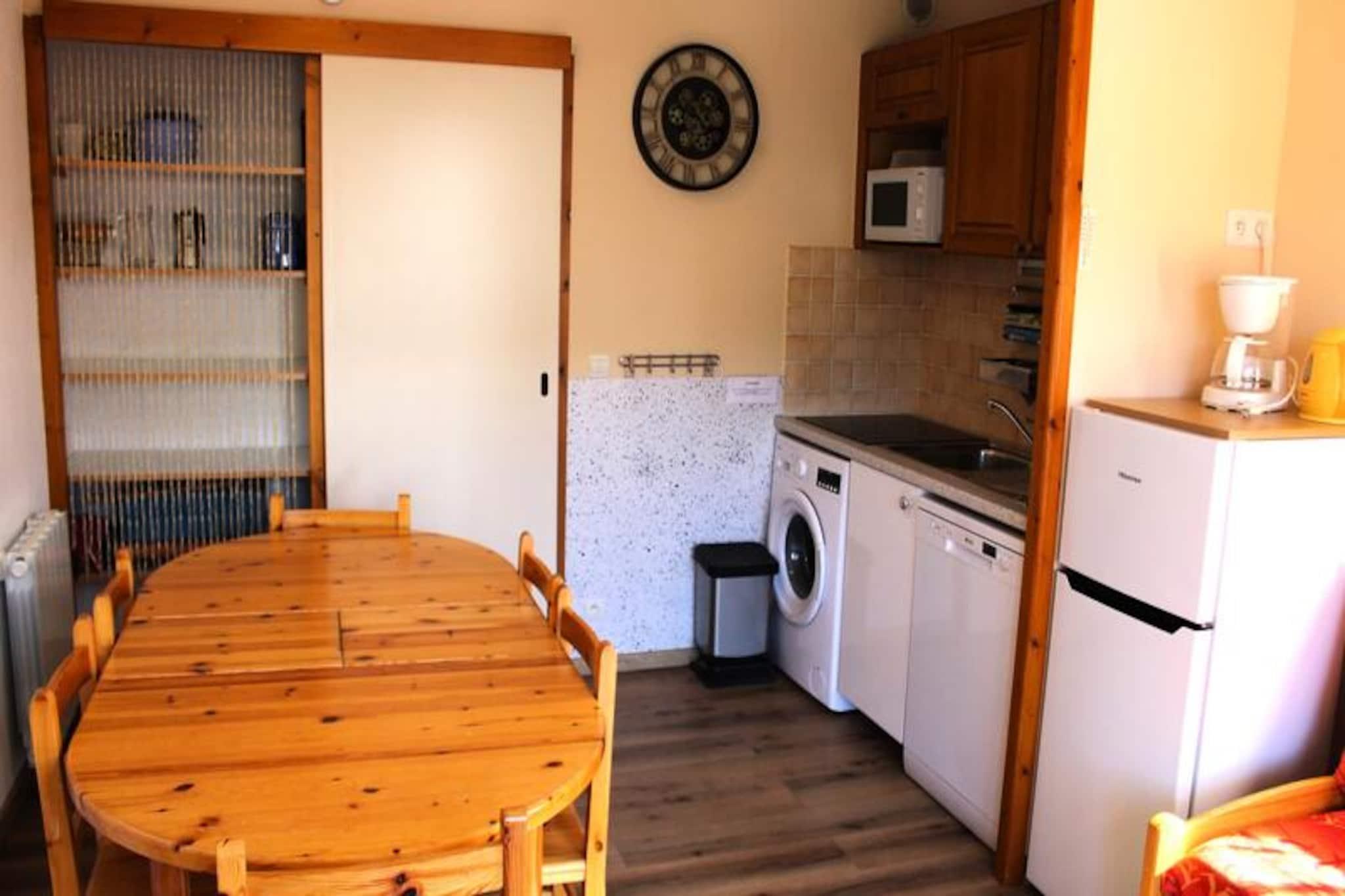Högt ovanför La Joue du Loups fridfulla landskap inbjuder denna charmiga lägenhet dig att uppleva magin i de franska Alperna under alla årstider. Med sitt oslagbara läge vid foten av backarna och i hjärtat av orten vaknar du varje morgon till hisnande utsikter över skidområdet och den livliga byns centrum, allt badande i det gyllene ljuset från den södervända solen. Oavsett om du är här för spännande vintersporter eller lugna sommarvandringar, erbjuder denna bostad den perfekta basen för dina alpina äventyr. \n\nStig in och upptäck ett omsorgsfullt utformat utrymme som bekvämt rymmer upp till åtta gäster. Lägenheten har ett mysigt vardagsrum med en utdragbar säng, ett fullt utrustat pentry med kokplattor, ugn, kylskåp, diskmaskin och tvättmaskin, samt ett sovrum med en dubbelsäng. Två sovalkover med våningssängar ger ytterligare sovmöjligheter, vilket gör den idealisk för familjer eller grupper av vänner. En privat balkong erbjuder en lugn tillflyktsort för att njuta av bergsluften, medan moderna bekvämligheter som en TV säkerställer avkoppling efter en aktiv dag. \n\nUtöver lägenheten erbjuder orten en mängd attraktioner. Hälsocentret O'dycéa ligger bara några minuter bort, där du kan varva ner i dess lyxiga relaxområden efter en dag i backarna. I närheten hittar du butiker, restauranger och nöjesalternativ som väcker byn till liv. På sommaren kan du utforska natursköna stigar, cykla genom alpina ängar eller helt enkelt njuta av lugnet i detta bergsparadis. \n\nOavsett om du söker äventyr eller avkoppling kombinerar detta boende komfort, bekvämlighet och fantastisk naturskönhet för att skapa oförglömliga minnen i hjärtat av Dévoluybergen.