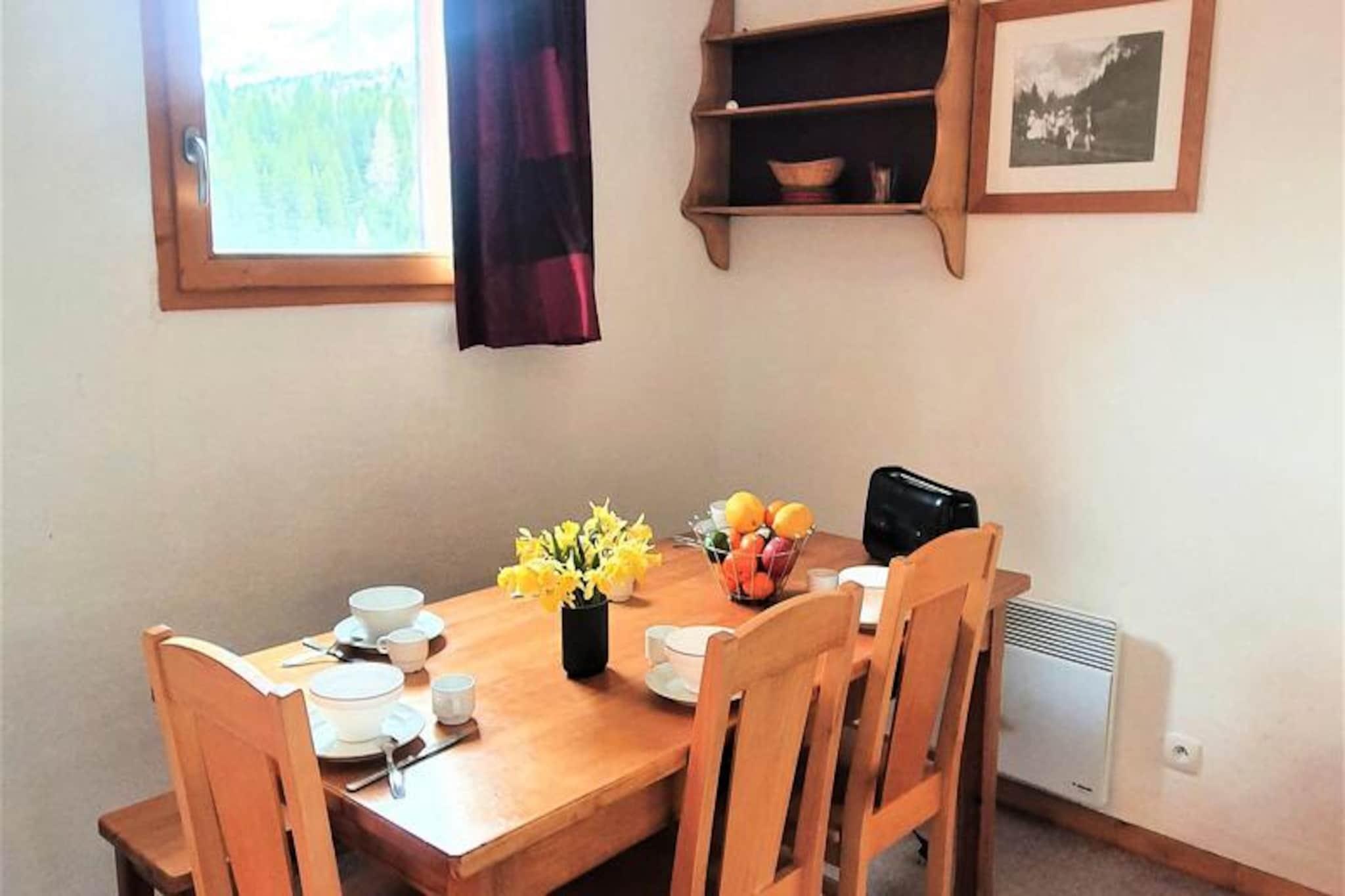 Där den majestätiska Pic de Bure reser sig mot horisonten erbjuder denna charmiga alpina lägenhet en lugn tillflyktsort bara några steg från backarna. Med hisnande utsikt över de omgivande bergen och en balkong i söderläge som fångar solens gyllene glöd, är denna bostad en fristad för både naturälskare och äventyrssökare. Oavsett om du är här för att karva dig genom orörd snö eller utforska lederna under de varmare månaderna, garanterar läget att varje ögonblick blir oförglömligt. Ansluten till backarna via en bekväm gångbro, kommer du att befinna dig nedsänkt i de franska Alpernas skönhet från det ögonblick du anländer. \n\nLägenheten är designad för upp till sex gäster, sträcker sig över 40 m² och är noggrant utrustad för att ge komfort och funktionalitet. Vardagsrummet har en mysig bäddsoffa för två personer, medan sovrummet har en lyxig queen size-säng (160x200 cm). En våningssängssoffa ger mångsidighet för familjer eller grupper. Pentryt är fullt utrustat med moderna apparater, inklusive diskmaskin, mikrovågsugn/grill, tvättmaskin och till och med en raclettegrill för autentiska alpina matupplevelser. Koppla av med en kopp kaffe bryggt i filterkaffebryggaren eller njut av en varm rostad brödrost medan du planerar dagens äventyr.\n\nGratis parkering omger boendet, med täckt parkering som kan hyras vid bokning. Det närliggande turistkontoret, bara 50 meter bort, garanterar enkel tillgång till lokal information och tjänster. Husdjur är välkomna att följa med på din semester mot en liten avgift, och linneuthyrning finns tillgänglig för extra bekvämlighet. Efter en dag med skidåkning eller vandring kan du varva ner i din lägenhets bekvämlighet, med vetskapen om att slutstädning kan ordnas vid behov.\n\nMed sitt oslagbara läge, fantastiska utsikt och omtänksamma bekvämligheter är denna alpina lägenhet den perfekta basen för att skapa bestående minnen i de franska Alperna. Oavsett om du söker spännande utomhusaktiviteter eller fridfulla stunder omgivna av naturen, erbjuder detta boende allt.