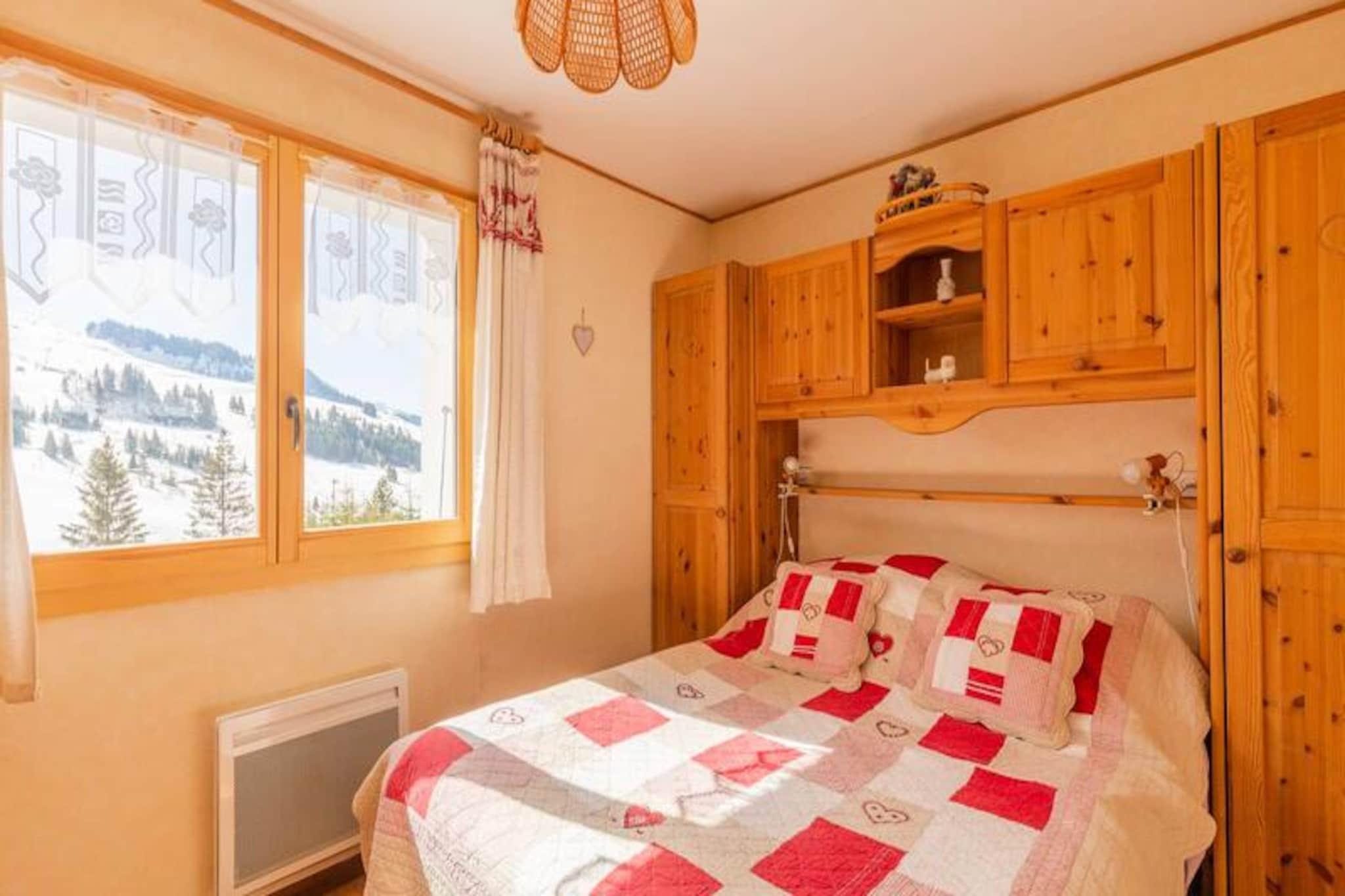 Högt ovanför dalen, där den friska alpina luften väcker dina sinnen, erbjuder denna charmiga lägenhet en lugn tillflyktsort med hisnande panoramautsikt. Perfekt beläget i hjärtat av de franska Alperna, är denna mysiga 40 m² stora bostad designad för dig som söker både avkoppling och äventyr. Oavsett om du blickar ut från den rymliga balkongen i söderläge eller utforskar de närliggande backarna, känns varje ögonblick här som en hyllning till naturens skönhet. \n\nInuti rymmer lägenheten bekvämt upp till fem gäster, vilket gör den idealisk för familjer eller små grupper. Den omsorgsfullt utformade planlösningen inkluderar ett varmt och inbjudande vardagsrum med en bäddsoffa för två personer, ett fullt utrustat kök för att laga rejäla måltider och ett lugnt sovrum med en dubbelsäng. En alkov i bergen med en nedfällbar enkelsäng ger en touch av alpin charm, medan det renoverade duschrummet garanterar modern komfort. Inbyggda garderober och garderober i varje rum ger gott om förvaring, och den privata parkeringen och den kostnadsfria skidbussen precis utanför bostaden gör din vistelse problemfri. \n\nBortom lägenheten lockar regionen med oändliga möjligheter. Från spännande skidbackar till natursköna vandringsleder erbjuder omgivningarna aktiviteter för alla säsonger. Den närliggande byn sjuder av autentisk fransk kultur och erbjuder härliga restauranger, butiker och afterski-möjligheter. På sommaren förvandlas bergen till en fristad för friluftsentusiaster, med möjligheter till paragliding, cykling och att utforska de orörda landskapen i Tarentaisedalen. \n\nOavsett om du är här för att åka genom färskt pudersnö eller bara varva ner bland fantastiska alpina vyer, är den här lägenheten din port till oförglömliga minnen i de franska Alperna.