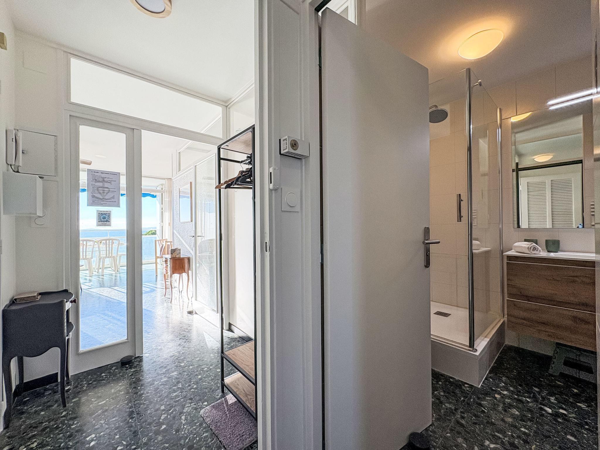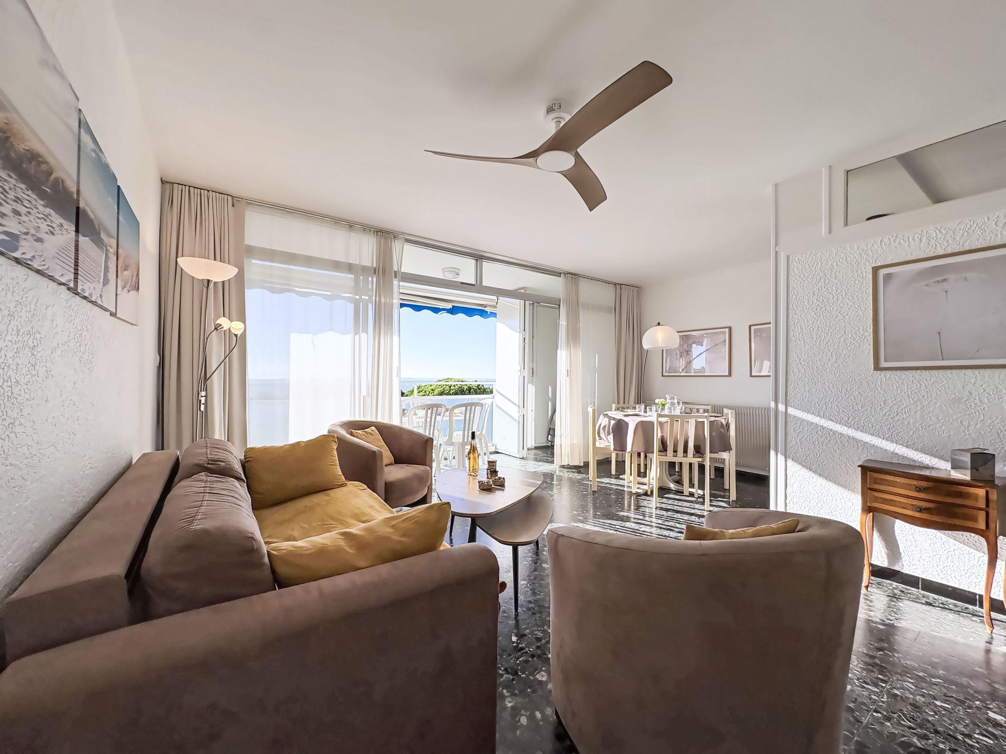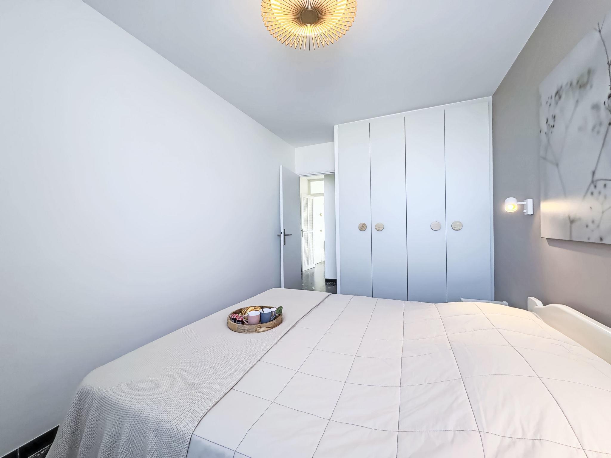 "Le Mireille", 3-room apartment 60 m2 on 4th floor. Beautiful furnishings: living/dining room with TV. 1 room with 1 french bed (160 cm, length 190 cm). 1 room with 1 bed (90 cm, length 190 cm), 1 pull-out bed (2 pers. 2 x 90 cm, length 200 cm). Kitchen (oven, 4 ceramic glass hob hotplates, toaster, kettle, microwave, freezer, electric coffee machine). Shower, sep. WC. Gas heating. Terrace 9 m2, south-west facing position. Terrace furniture. Beautiful view of the sea. Facilities: washing machine. Internet (WiFi, free). Parking space n 258. Please note: smoke alarm. Offer by a private individual according to Art. 155, IV of CGI.