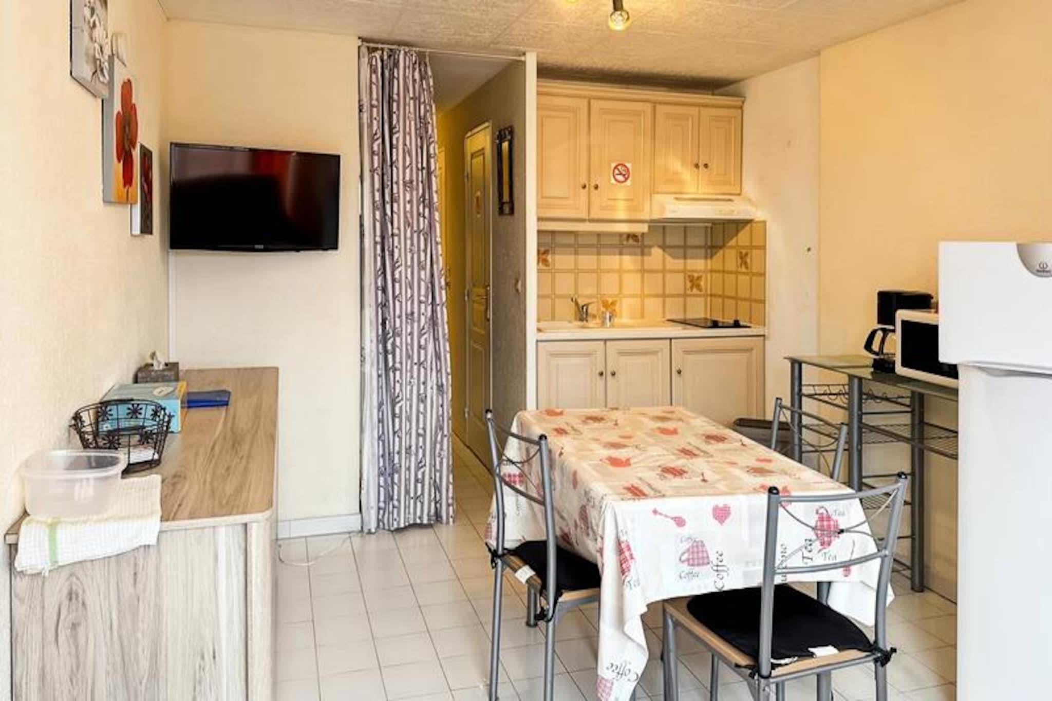 I hjärtat av den fridfulla Blå lagunen inbjuder denna charmiga lägenhet dig att uppleva södra Frankrikes skönhet i komfort och stil. Tänk dig att vakna upp till den milda medelhavsbrisen, omgiven av frodiga landskap och löftet om en dag fylld av utforskning och avkoppling. Oavsett om du är här för en familjesemester eller en romantisk flykt, erbjuder denna mysiga tillflyktsort den perfekta basen för att skapa oförglömliga minnen. \n\nMed en noggrant utformad planlösning på 25 m² rymmer lägenheten bekvämt upp till sex gäster. Den har ett välutrustat pentry, ett sovrum med en dubbelsäng, två våningssängar och en bäddsoffa i vardagsrummet, vilket säkerställer att alla har en mysig plats att vila på. Under de varmare månaderna, från juni till mitten av september, kan du dra nytta av residensens inbjudande pool, perfekt för uppfriskande dopp i solen. En privat parkeringsplats med en säker grind ökar bekvämligheten, så att du kan utforska regionen utan bekymmer. Ytterligare alternativ som uthyrning av sängkläder och handdukar, husdjursvänliga vistelser och slutstädning garanterar en problemfri upplevelse. \n\nDenna lägenhet ligger nära alla bekvämligheter och erbjuder enkel tillgång till skatterna i Blå lagunen. Upptäck charmiga byar, lokala marknader och natursköna vandringsleder som visar upp regionens naturliga skönhet. Oavsett om du promenerar längs kusten eller njuter av regionala delikatesser, erbjuder området oändliga möjligheter till äventyr och avkoppling. \n\nVälj denna förtjusande lägenhet för din nästa semester och fördjupa dig i södra Frankrikes värme och charm. Med sin inbjudande atmosfär och utmärkta läge är det den perfekta miljön för en minnesvärd semester.