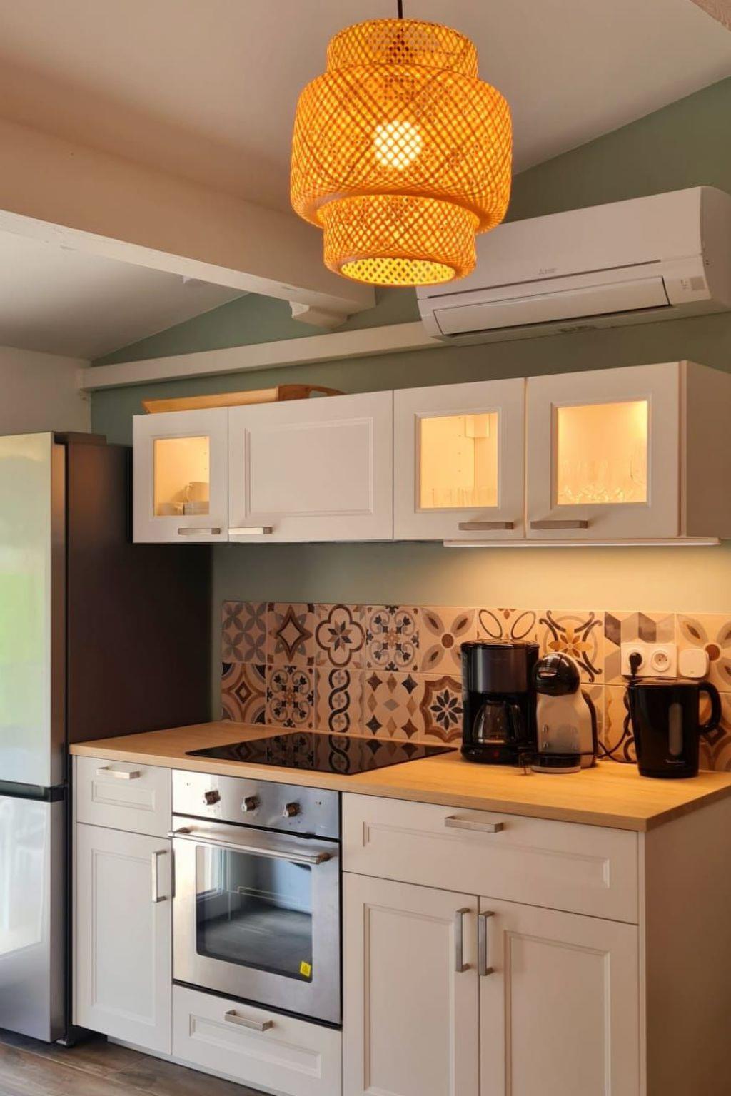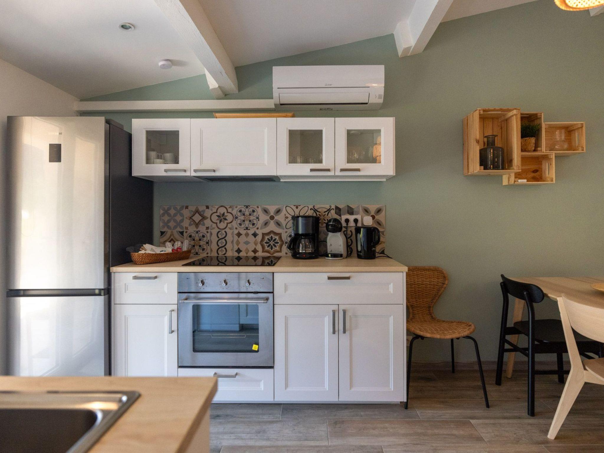 Gîte of 70m² for 7 people. Very pleasant gîte comprising a fully-equipped open-plan kitchen (hob, oven, microwave, fridge, coffee maker, toaster, dishwasher), a living room with sofa bed, a double bedroom (queen-size bed), a connecting double bedroom (2 single beds), a bathroom with shower and WC. Washing machine and iron available. Large terrace overlooking the vineyards with sea views. Bedroom: * 1 double bed 1.60 x 2.00m * 1 single bed 0.90 x 2.00m * Connecting room: Sofa bed 1.40 x 2.00m for 2 people * Living room: Sofa bed 1.40 x 2.00m for 2 people Fully equipped kitchen.