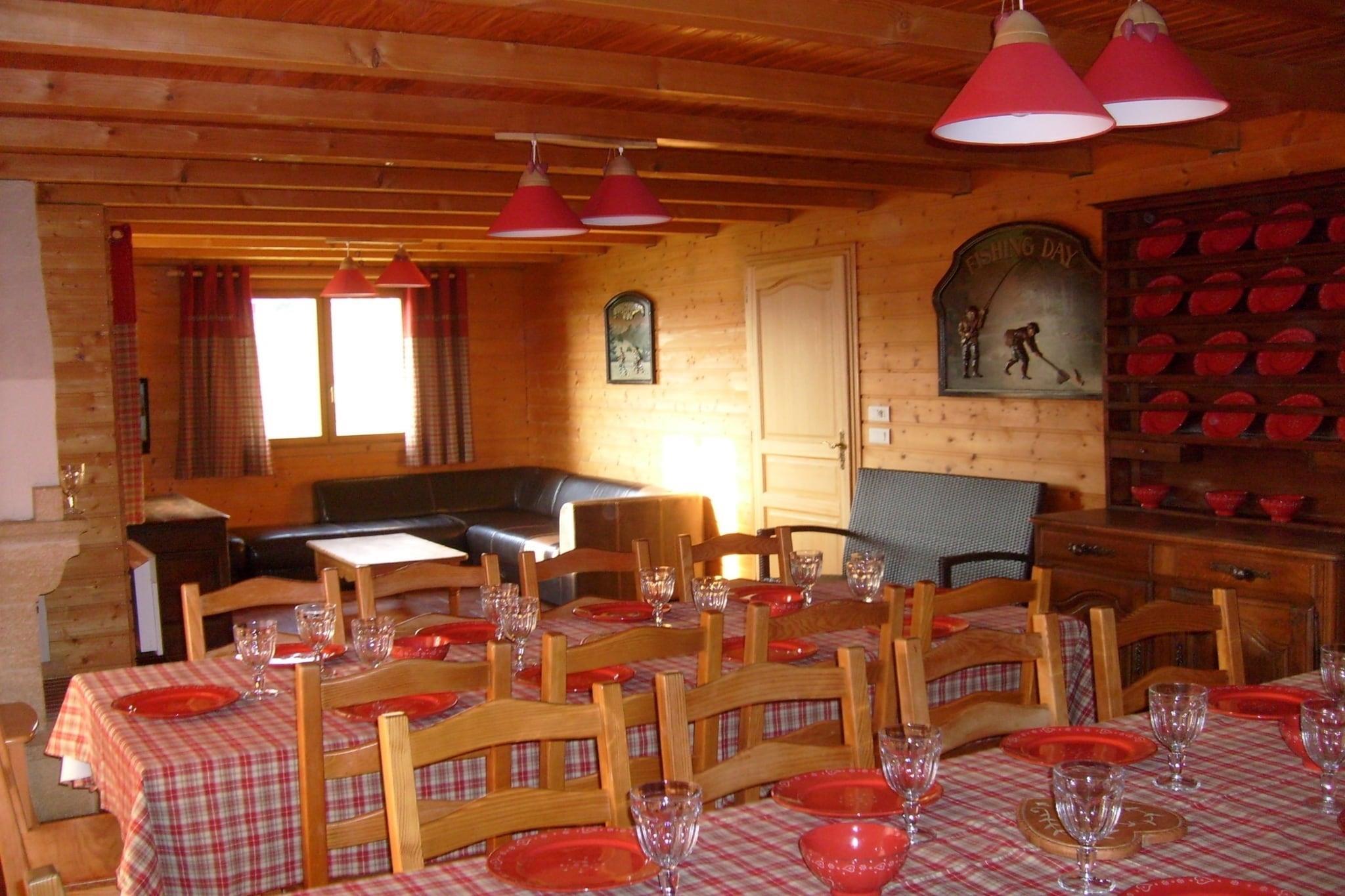 Denna fastighet, tillsammans med sin charmiga design, erbjuder en rymlig stuga som bekvämt rymmer 18 till 20 personer, perfekt för 4-5 par och barn. Stugan är välskött och har en varm, regional stil. Det är husdjursvänligt med en kostnad på 5 EURO per husdjur och natt. Ytterligare föremål som babysängar (28 EURO per vistelse), barnstolar (tillgängliga i receptionen utan kostnad) och enheter som raclette, fondue och soppmixer finns tillgängliga på begäran. Stugan erbjuder också en rad gratisaktiviteter, inklusive pool, gigantisk jacuzzi, bowling inomhus och utomhustennispass, som är tillgängliga baserat på vistelsens längd. Ett spelrum, en gigantisk lekplats utomhus och gratis WiFi i receptionen bidrar till komforten. Läget är idealiskt beläget nära flera attraktioner, inklusive lokala kaféer och marknader, vilket ger gästerna möjlighet att utforska det livliga omgivningen. Närliggande transportförbindelser, såsom busshållplatser och tågstationer, gör det enkelt att ta sig till fastigheten. De närmaste flygplatserna har goda förbindelser, vilket garanterar en bekväm reseupplevelse för gästerna. Inuti stugan har ett fullt utrustat kök, med alla nödvändiga bekvämligheter för att laga mat, tillsammans med moderna toaletter. Vardagsrummet är mysigt, med en bekväm soffa och inbjudande gemensamma utrymmen perfekta för avkoppling. Med dessa faciliteter kan gästerna njuta av en hemtrevlig vistelse i en vackert möblerad och välutrustad miljö.