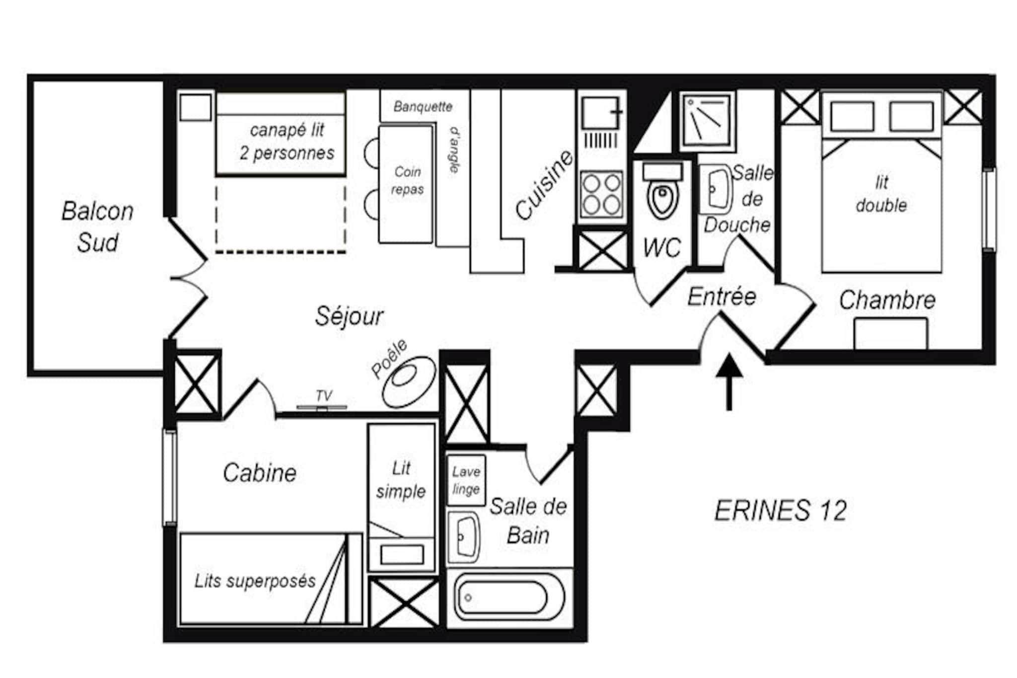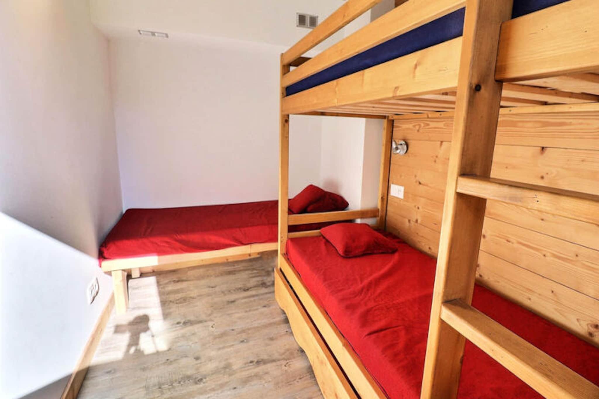 Högt ovanför Méribel-Mottarets skimrande sluttningar erbjuder denna charmiga alpina oas en perfekt blandning av komfort och bekvämlighet för din bergssemester. Tänk dig att vakna upp till hisnande utsikter från din balkong i söderläge, smutta på kaffe medan solen går upp över de snöklädda topparna. Med direkt tillgång till skidbackarna direkt från bostaden väntar äventyret bara några steg från din dörr, vilket gör det till ett idealiskt val för både vintersportentusiaster och naturälskare. Oavsett om du är här för att åka i färskt pudersnö eller utforska natursköna stigar, känns varje ögonblick som en hyllning till naturen. \n\nInuti är bostaden noggrant utformad för att rymma upp till sex gäster på sin 45 m² stora yta. Det mysiga vardagsrummet har en matplats, ett vardagsrum med en bäddsoffa för två personer och en vedeldad spis som ger en touch av rustik charm (ved ingår ej). Pentryt är fullt utrustat med moderna apparater, inklusive kylskåp, diskmaskin, induktionshäll, miniugn, mikrovågsugn med mera, vilket gör det enkelt att laga mat efter en dag i backarna. Två inbjudande sovrum erbjuder flexibla sovarrangemang – en dubbelsäng i det ena och en kombination av våningssängar och en enkelsäng i det andra – vilket garanterar vilsamma nätter för alla. Ytterligare bekvämligheter inkluderar platt-TV, gratis internet (anslutning beroende på operatörens tillgänglighet) och en tvättmaskin för extra bekvämlighet.\n\nBeläget bara 500 meter från köpcentret Mottaret, tillgängligt via trappor eller linbana, hittar du allt du behöver inom räckhåll. Från skiduthyrning och afterski-platser till charmiga butiker och lokala restauranger, surrar byn av liv och alpin charm. På sommaren förvandlas området till en fristad för vandrare och cyklister, med frodiga stigar och panoramautsikt som väntar på att utforskas.\n\nOavsett om du söker spännande skiddagar, lugna kvällar vid kaminen eller oförglömliga stunder omgivna av de franska Alpernas skönhet, inbjuder denna bostad dig att skapa bestående minnen i en av regionens mest pittoreska miljöer.