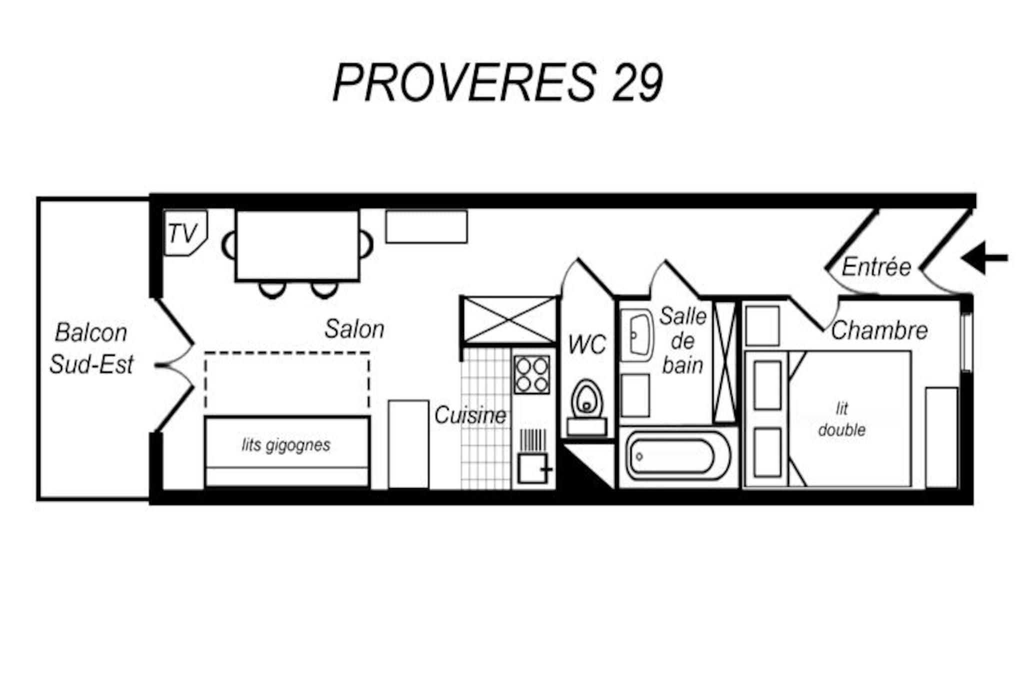 Högt ovanför den livliga skidorten Méribel erbjuder denna charmiga lägenhet i Les Provères-residenset en idyllisk alpin tillflyktsort med direkt tillgång till backarna. Tänk dig att vakna upp till den friska bergsluften och gå ut på din balkong i österläge för att njuta av morgonsolen och utsikten över de snötäckta topparna. Perfekt beläget mellan två köpcentrum, nås på bara fem minuter via trappor, kombinerar denna mysiga tillflyktsort bekvämlighet med lugn, vilket gör den till en idealisk bas för dina vinter- eller sommaräventyr. \n\nLägenheten är designad för upp till fyra gäster och har en genomtänkt planlösning med ett vardagsrum utrustat med utdragssängar och ett separat sovrum med en bekväm dubbelsäng. Pentryt är fullt utrustat med moderna apparater, inklusive kylskåp, diskmaskin, mikrovågsugn med grill och viktiga kaffebryggare för att starta dagen på rätt sätt. Efter en dag med skidåkning eller utforskande kan du varva ner i det inbjudande vardagsrummet med en platt-TV eller njuta av en lugn stund på balkongen. Badrummet och den separata toaletten garanterar extra komfort för din vistelse. Husdjur är välkomna och lägenheten är helt rökfri, vilket garanterar en fräsch och trevlig miljö. \n\nGå ut i backarna direkt via utgången från skidskåpet, som leder till den gröna Perdrix-nedfarten som förbinder dig med den huvudsakliga avgångspunkten för skidliftarna. Chalets linbana, som är i drift till sent på kvällen, ger fri tillgång till områdena Hameau och Laitelet, vilket utökar dina möjligheter att utforska området. Oavsett om du är här för spännande nedfarter eller natursköna vandringar, garanterar residensens utmärkta läge att du alltid är nära till allt. \n\nMed sin blandning av praktiskhet och charm inbjuder Les Provères dig att skapa oförglömliga minnen i hjärtat av de franska Alperna. Oavsett om du söker äventyr eller avkoppling, erbjuder denna mysiga bergsresort den perfekta miljön för din alpina semester.