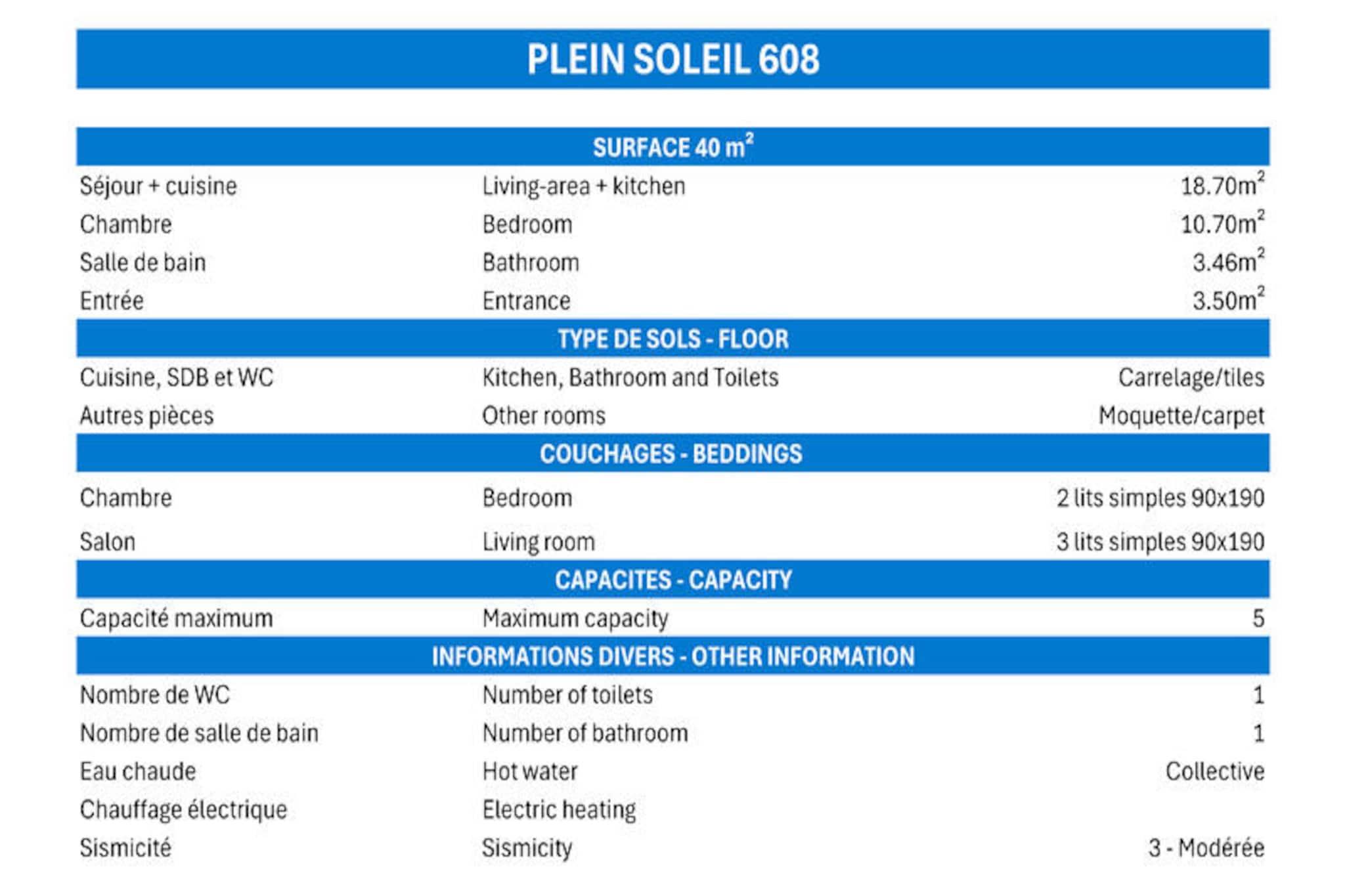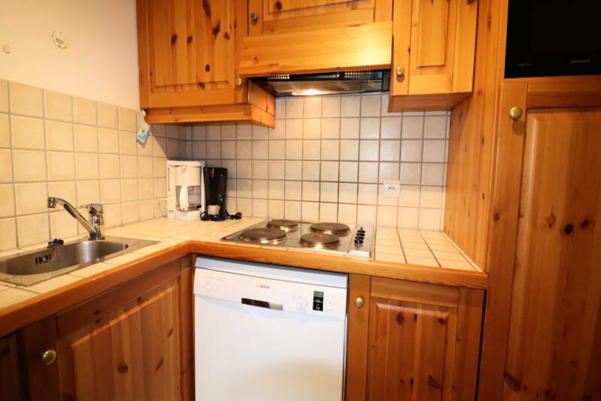 Högt ovanför de pittoreska sluttningarna i Méribel-Mottaret erbjuder denna charmiga alpina oas en plats på första parkett i hjärtat av de franska Alperna. Med sitt avundsvärda ski-in, ski-out-läge låter Plein Soleil-residenset dig kliva direkt ut i backarna från skidförvaringen och fördjupa dig i bergens spänning från det ögonblick du anländer. Balkongen i söderläge inbjuder dig att njuta av solskenet och panoramautsikten, vilket skapar den perfekta bakgrunden för din alpina resa. \n\nDenna mysiga men rymliga lägenhet på 40 m² är designad för upp till fem gäster och har en noggrant utformad planlösning. Vardagsrummet har en uppsättning utdragbara sängar och en bäddsoffa, medan det separata sovrummet har två bekväma enkelsängar. Ett välutrustat pentry med en kombinerad mikrovågsugn, kylskåp, diskmaskin och viktiga apparater säkerställer att du har allt du behöver för att laga rejäla måltider efter en dag i backarna. Moderna bekvämligheter som en platt-TV och gratis Wi-Fi i residensens lounge bidrar till bekvämligheten och komforten under din vistelse. \n\nBeläget i Mottarets pulserande centrum, bara några steg från butiker, restauranger och afterski-aktiviteter. Chalets linbana, med fri tillgång från tidig morgon till sent på kvällen, förbinder dig enkelt med områdena Hameau och Laitelet, vilket gör det enkelt att utforska det vidsträckta skidområdet Les Trois Vallées. Oavsett om du är en erfaren skidåkare eller en förstagångsbesökare, placerar detta läge dig i hjärtat av en av världens mest kända skiddestinationer. \n\nMed sitt oslagbara läge, varma atmosfär och moderna bekvämligheter är denna lägenhet det perfekta valet för familjer, vänner eller par som söker en oförglömlig alpin semester. Låt magin i Méribel-Mottaret fängsla dig när du skapar värdefulla minnen i denna idylliska bergsresort.