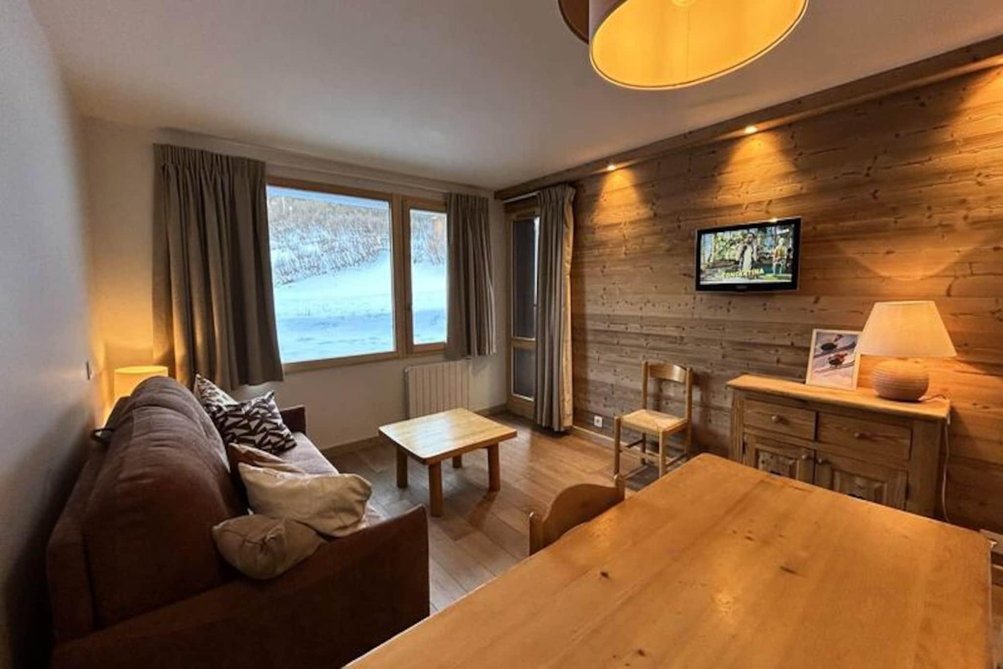 Högt ovanför den pittoreska Méribel Mottaret erbjuder denna charmiga alpina lägenhet en mysig tillflyktsort för dig som söker den perfekta skidturen. Föreställ dig morgnar fyllda med frisk bergsluft och kvällar tillbringade med att titta på de snötäckta topparna från din privata terrass. Beläget i hjärtat av Laitelet-distriktet, kombinerar denna bostad bergens lugn med bekvämligheten av att vara bara några steg från backarna och lokala bekvämligheter. \n\nLägenheten är omsorgsfullt utformad för att rymma upp till sex gäster. Vardagsrummet har en bekväm bäddsoffa för två personer och en TV för avkoppling efter en dag i backarna. Sovrummet har två enkelsängar som kan skjutas ihop och en våningssäng, vilket gör den idealisk för familjer eller små grupper. Det fullt utrustade köket har en keramikhäll, mikrovågsugn, diskmaskin, ugn, kylskåp, vattenkokare, brödrost och en Nespresso Essenza-kaffebryggare, vilket säkerställer att du har allt som behövs för att laga rejäla måltider. Ett badrum med separat toalett ökar bekvämligheten, medan ett skidförvaringsskåp i bostaden håller din utrustning säker. Observera att detta är en rökfri anläggning och husdjur är inte tillåtna.\n\nLe Nantchu Residence har ett perfekt läge för skidentusiaster och erbjuder direkt tillgång till backarna och närhet till butiker, restauranger och barer. Den kostnadsfria Méribus-bussen eller linbanan Les Chalets ger enkel tillgång till Mottarets centrum, där du kan utforska mer av vad denna livliga semesterort har att erbjuda.\n\nOavsett om du är här för att snubbla genom orörd snö eller bara njuta av den fridfulla alpina atmosfären, är denna lägenhet din port till oförglömliga bergsäventyr. Boka din vistelse och upplev magin i Méribel Mottaret på nära håll.
