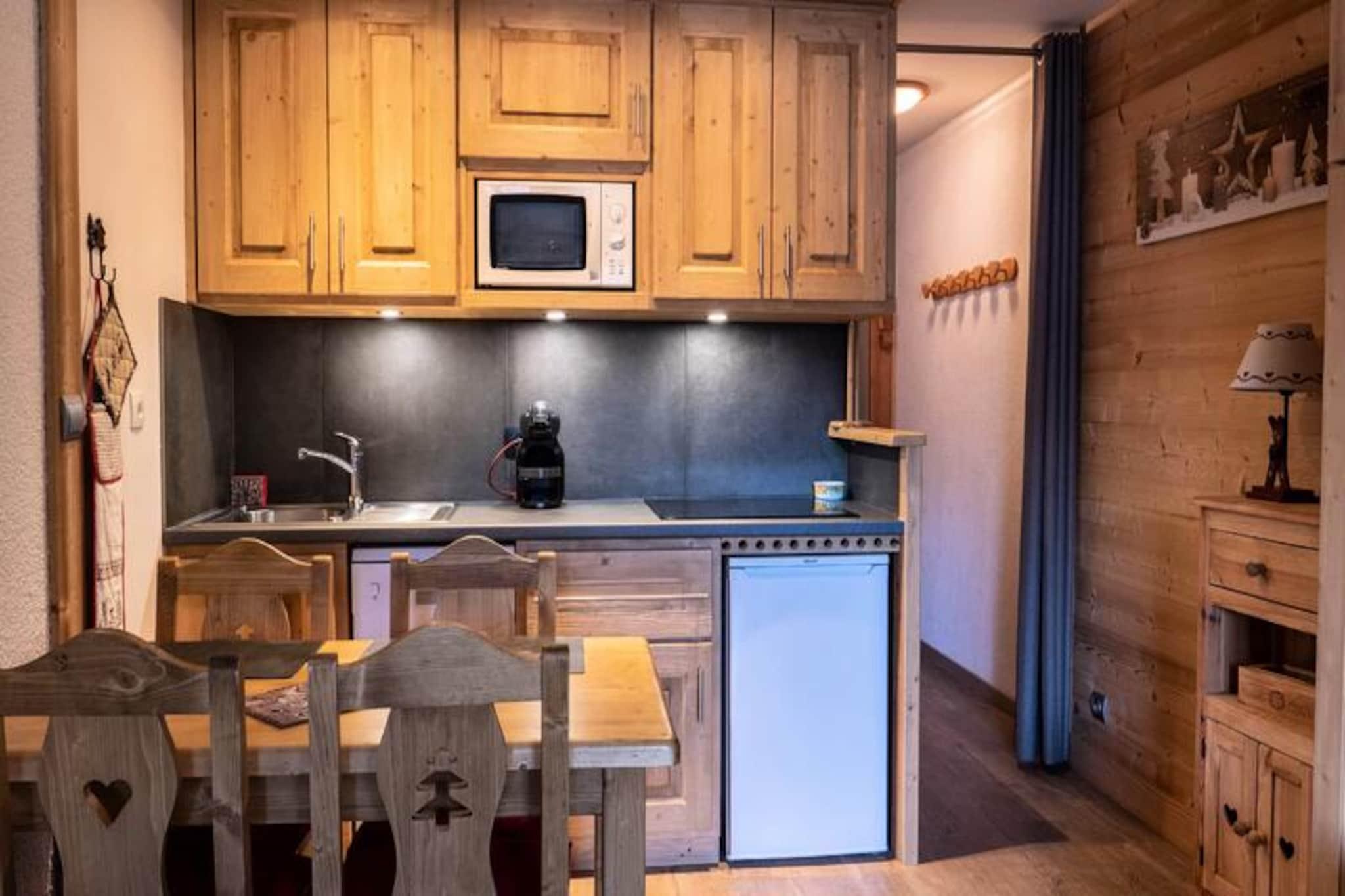 I Méribel Mottarets fridfulla omfamning erbjuder denna charmiga studiolägenhet en lugn tillflyktsort med direkt tillgång till backarna. Tänk dig att stiga ut på din balkong i söderläge, där den hisnande utsikten över Mont Vallon och de snötäckta backarna sätter tonen för en perfekt alpin semester. Oavsett om du är en ivrig skidåkare eller bara söker en lugn flykt till bergen, lovar denna bostad en harmonisk blandning av komfort och bekvämlighet. \n\nInuti är studion noggrant utformad för att rymma upp till tre gäster. Vardagsrummet har en RAPIDO bäddsoffa (140x190) och en TV, vilket skapar ett mysigt utrymme att varva ner efter en dag i backarna. En nedfällbar enkelsäng i hallen ger extra sovplatser. Pentryt är fullt utrustat med induktionshäll, diskmaskin, mikrovågsugn, kylskåp och en Dolce Gusto-kaffebryggare, vilket säkerställer att du har allt som behövs för att laga läckra måltider. Ett separat badrum och toalett bidrar till utrymmets praktiska egenskaper. Lägenheten är rökfri, husdjursfri och inkluderar ett skidförvaringsskåp och hiss för extra bekvämlighet. \n\nProvères-residenset är idealiskt beläget mellan Le Hameau och centrala Méribel Mottaret, i ett lugnt område som erbjuder både lugn och tillgänglighet. Lokala butiker och gratis kollektivtrafik ligger bara några minuter bort, vilket gör det enkelt att utforska omgivningarna. Gästerna lovordar konsekvent denna fastighet, med ett imponerande genomsnittligt betyg på 9,00/10 från förra vinterns besökare. \n\nOavsett om du är här för att vandra genom orörda backar, njuta av den alpina atmosfären eller bara koppla av i hjärtat av de franska Alperna, erbjuder denna studiolägenhet den perfekta basen för en oförglömlig bergssemester.