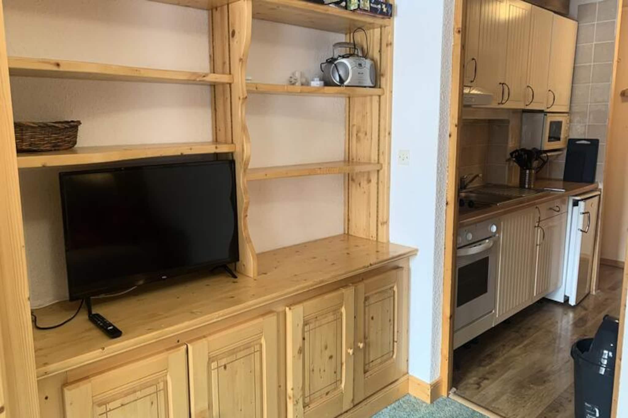 Mitt bland de lugna, grankantade sluttningarna i Méribels Altiport-distrikt erbjuder denna mysiga studiolägenhet en fridfull tillflyktsort för alpinister. Oavsett om du är här för spänningen med vinterskidåkning eller charmen med sommarvandringar, inbjuder miljön dig att fördjupa dig i de franska Alpernas skönhet. Föreställ dig att varva ner på den västvända balkongen, omgiven av höga vintergröna träd, medan den friska bergsluften föryngrar dina sinnen. Med backarna bara några steg bort och en busshållplats i närheten är äventyr alltid inom räckhåll. \n\nDenna studio på 19 m² är designad för att rymma upp till fyra gäster och är omsorgsfullt utformad för komfort och bekvämlighet. Vardagsrummet har en bäddsoffa för två personer, medan en sovalkov erbjuder våningssängar, perfekt för familjer eller små grupper. Köket är utrustat med moderna bekvämligheter, inklusive keramikhäll, ugn, mikrovågsugn och kylskåp, vilket gör matlagningen till en barnlek efter en dags utomhusutforskning. Lägenheten har också ett privat skidförvaringsskåp, vilket säkerställer att din utrustning är redo för action. \n\nBortom residenset ligger Méribels pulserande centrum bara 5 km bort, och erbjuder en härlig blandning av butiker, restauranger och afterski-aktiviteter. På sommaren förvandlas området till en fristad för naturälskare, med stigar som slingrar sig genom frodiga landskap och möjligheter att se djurliv. Med rabatterade liftkort och Wi-Fi-uthyrningsmöjligheter har varje detalj tänkts igenom för att förbättra din vistelse. \n\nOavsett om du söker spännande backar eller fridfulla alpina stunder, är denna studiolägenhet din port till oförglömliga minnen i Méribels förtrollande Altiport-distrikt.