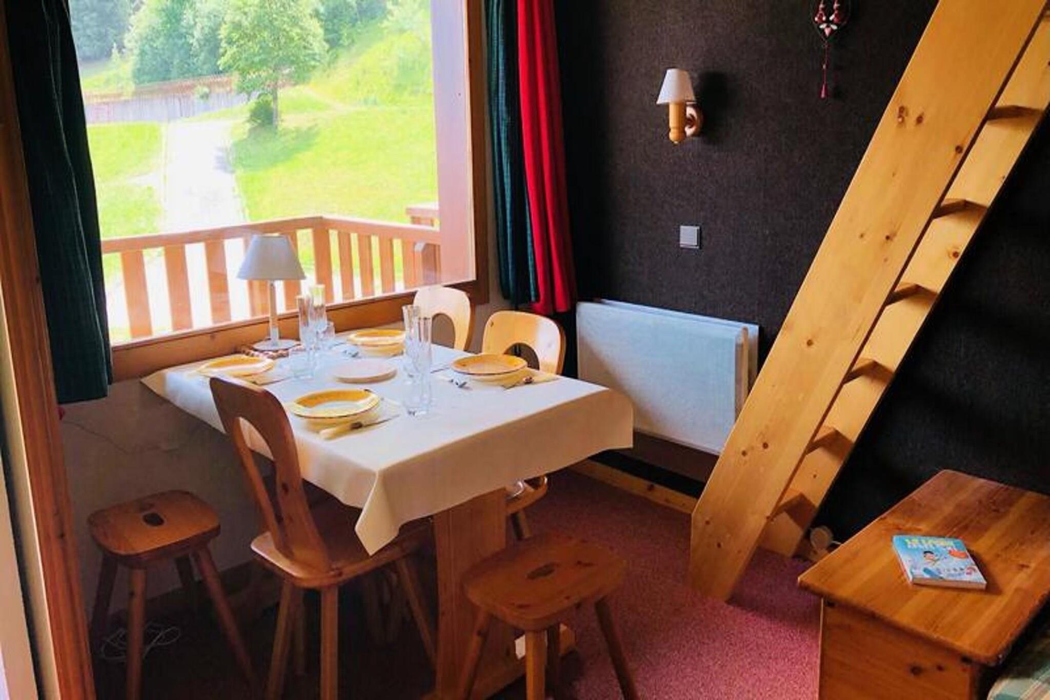 This charming studio is designed to accommodate 4-5 people and features a cozy living area with a convertible sofa and a single bed, as well as a mezzanine with a double bed. All beds are equipped with duvets for a comfortable stay. The apartment is non-smoking, and pets are not allowed. Linen and cleaning services are available for an additional fee, and the tourist tax is not included in the rental price. Located in the peaceful hamlet of Crève-cœur, this apartment offers easy access to the surrounding attractions, with stunning mountain views from the balcony. The residence provides covered parking and elevators for convenience. Guests can enjoy nearby shops, cafes, and markets, as well as the slopes, making it a great base for outdoor activities and exploring the area. The apartment includes a fully equipped kitchen with a fridge, dishwasher, oven, electric hobs, coffee maker, kettle, and toaster, ideal for preparing meals during your stay. The bathroom is well-appointed, and a separate toilet adds extra convenience. Heating is available throughout the apartment to ensure a warm and comfortable atmosphere, and a vacuum cleaner is provided for keeping the space tidy.