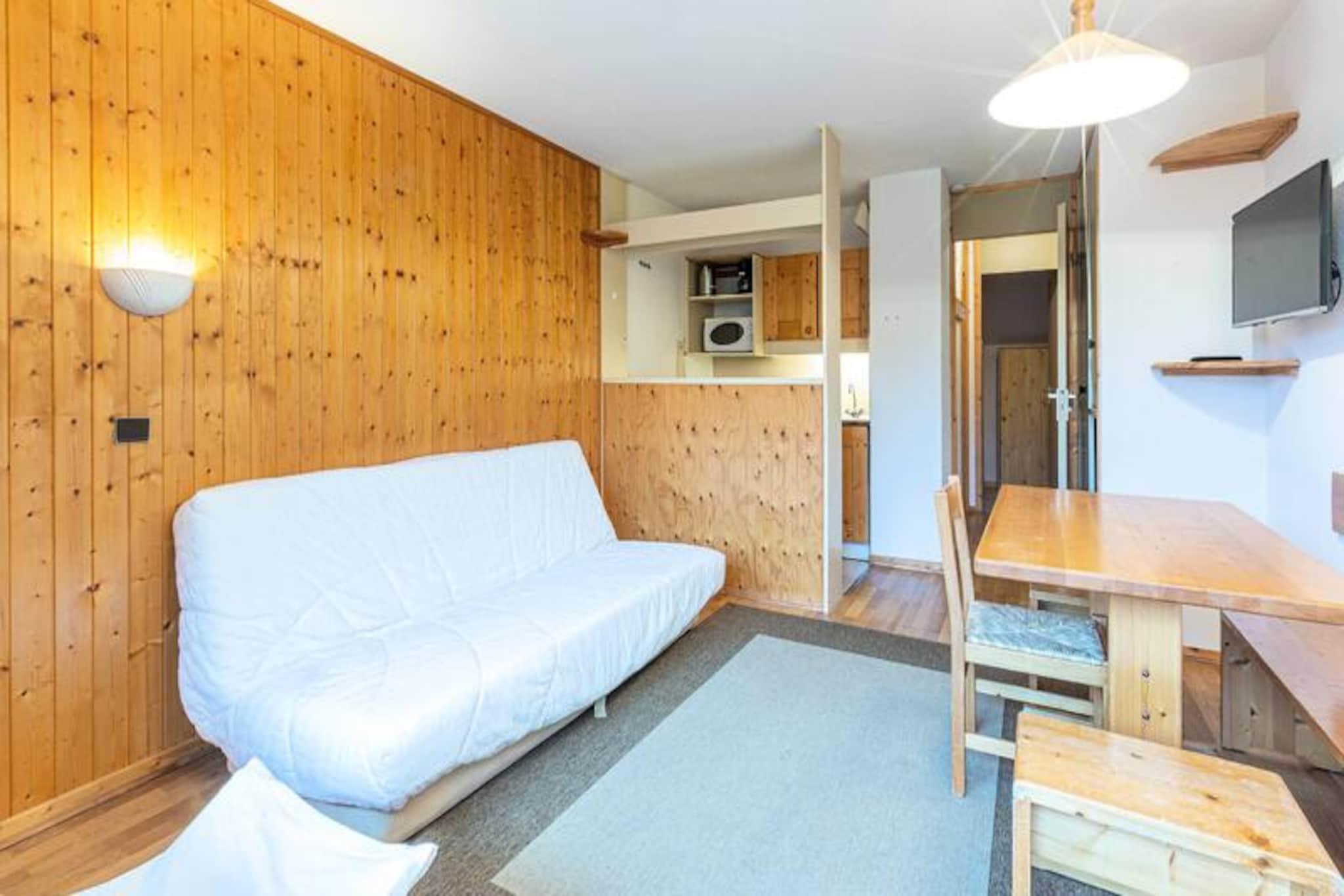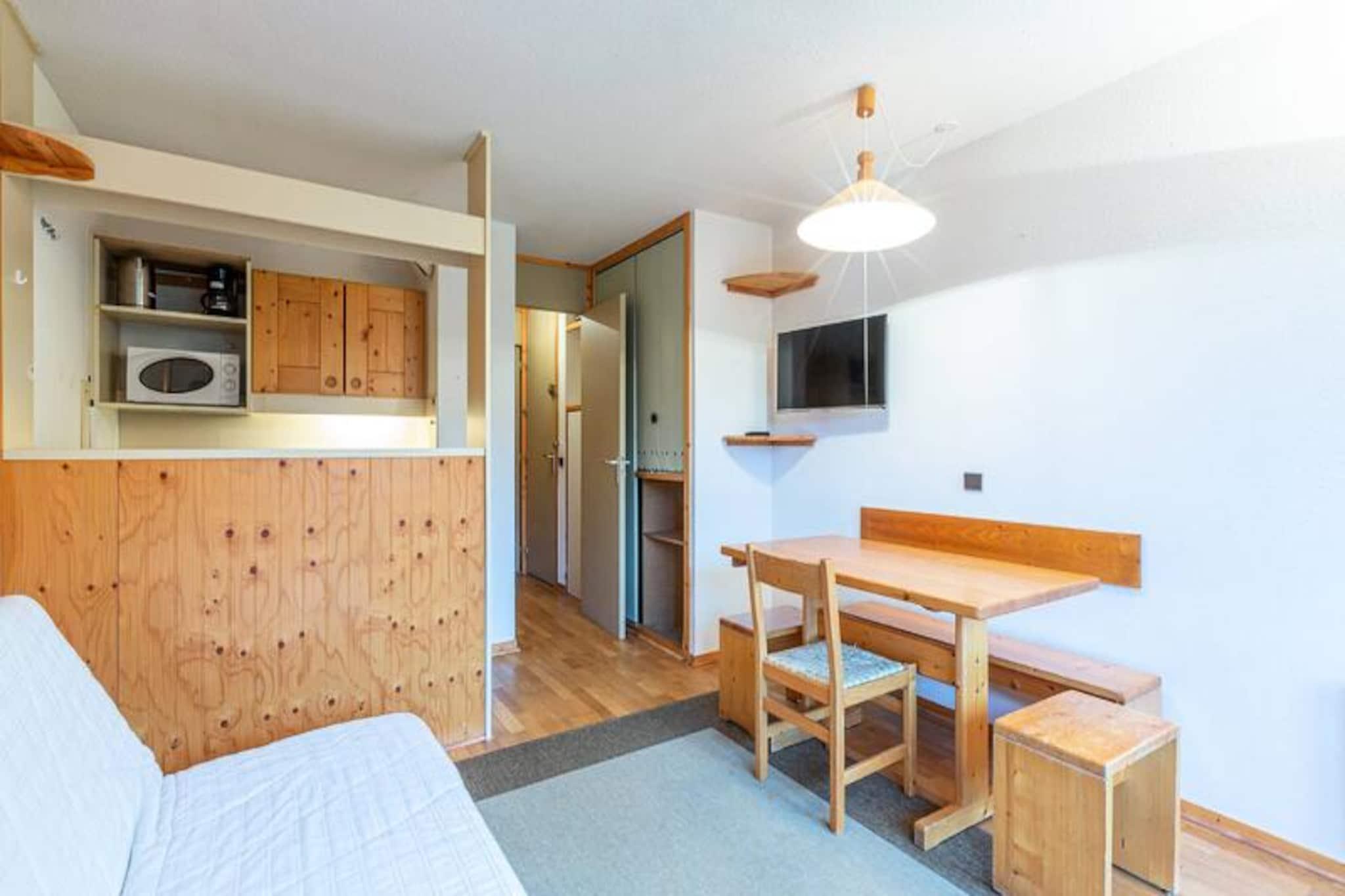 Belägen i det charmiga Crève Coeur-området i Valmorel, erbjuder denna mysiga lägenhet en härlig alpin tillflykt bara några minuter från backarna. Tänk dig att vakna upp till solen som kastar gyllene nyanser över de snötäckta topparna, kliver ut på din balkong i söderläge för att andas in den friska bergsluften och förbereder dig för en dag av äventyr med Côte Soleil-skidliften bara 50 meter bort och Pierrafort-linbanan en kort 200 meter lång promenad bort. Oavsett om du är en erfaren skidåkare eller nybörjare, tillgodoser läget alla nivåer och garanterar en smidig start på din dag i backarna. \n\nInuti är lägenheten omsorgsfullt möblerad för att ge komfort och bekvämlighet. Vardagsrummet har en bäddsoffa för två, medan det separata sovrummet erbjuder mysiga våningssängar, vilket gör den perfekt för familjer eller små grupper. Det välutrustade köket har en elektrisk spis, diskmaskin, mikrovågsugn och kylskåp, så att du kan laga rejäla måltider efter en spännande dag utomhus. Badrummet är praktiskt och funktionellt, och balkongen i söderläge erbjuder fantastisk utsikt över orten, vilket skapar den perfekta platsen att varva ner med en varm dryck medan solen går ner över bergen.\n\nCrève Coeur-området är idealiskt beläget mellan ortens centrum och byn Mottet, anslutet med linbanan Télébourg. Enkla butiker, inklusive ett bageri, en minilivs och en sportaffär, ligger bekvämt i närheten, vilket säkerställer att du har allt du behöver inom räckhåll. För de som anländer med bil finns avgiftsbelagd underjordisk parkering tillgänglig, och residensen har en hiss för enkel åtkomst.\n\nDenna lägenhet är din port till den förtrollande Valmorel-upplevelsen, som erbjuder en blandning av lugn, bekvämlighet och alpin charm. Oavsett om du är här för spänningen med skidåkning eller lugnet i bergen, lovar varje ögonblick att bli oförglömligt.