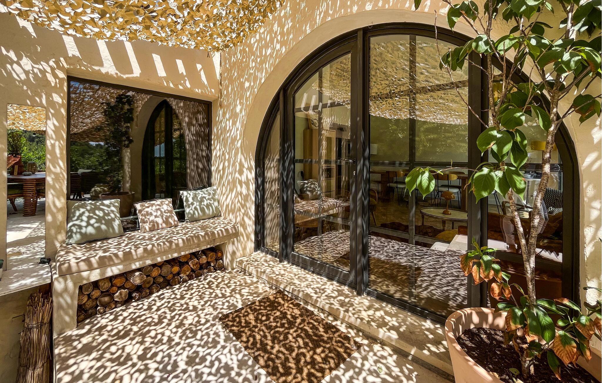 Utanför inbjuder den södervända terrassen med ett stort designat trädgårdsbord under pergolan till att dröja sig kvar. Njut av utsikten över olivträden, den skogsklädda trädgården och Alpilles från bubbelpoolen, fräscha upp dig i poolen, unna dig en cocktail eller espresso i soffan på sommarens uteplats, prata långt in på natten på stämningsfulla grillkvällar.