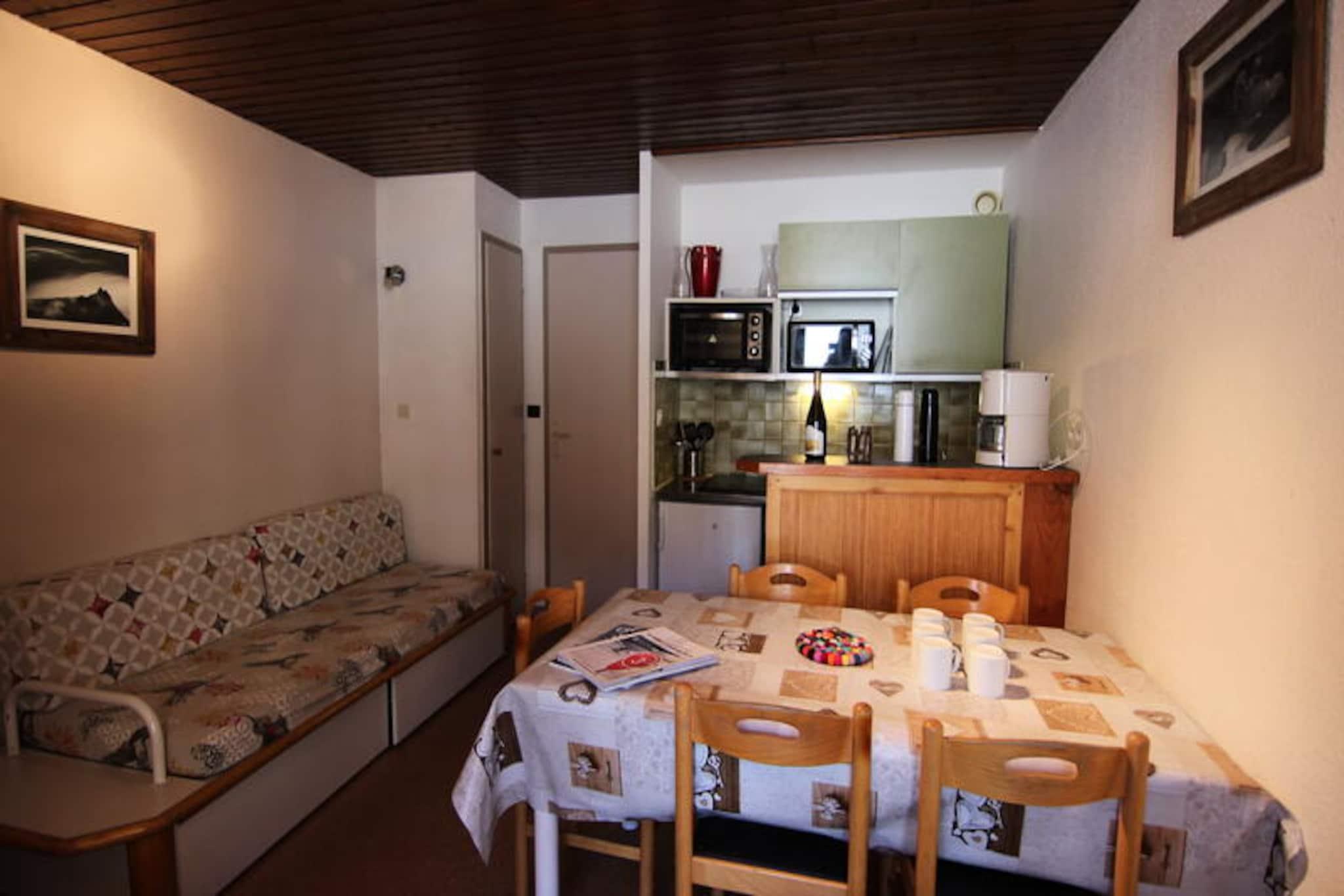 Högt ovanför Val Thorens pulserande hjärta, i det fridfulla slalomdistriktet, ligger din perfekta alpina tillflyktsort. Denna charmiga lägenhet i Le Schuss erbjuder en fridfull oas mitt i Europas högst belägna skidort. Tänk dig att vakna upp till den friska bergsluften, kliva ut på din balkong i österläge och njuta av den hisnande utsikten över snötäckta toppar som sträcker sig så långt ögat kan nå. Oavsett om du är här för spännande vintersport eller sommaräventyr i alpina skidor, sätter denna fastighet scenen för oförglömliga minnen. \n\nLägenheten är designad med komfort och funktionalitet i åtanke och rymmer upp till sex gäster. Det mysiga vardagsrummet har två bäddsoffor för enkla personer och en TV, vilket skapar ett välkomnande utrymme att varva ner efter en dag i backarna. Det välutrustade pentryt har ugn, mikrovågsugn, keramikhäll, kylskåp och diskmaskin, vilket gör att du enkelt kan laga rejäla måltider. En dubbelsäng i sovrummet och våningssängar i stugan ger vilsamma sovarrangemang för familjer eller grupper av vänner. Badrummet har badkar och handfat, medan en separat toalett gör din vistelse bekvämare. \n\nBeläget bara 50 meter från närmaste backe, kan du njuta av enkel tillgång till skidåkning i världsklass. Det närliggande köpcentret Péclet erbjuder allt du behöver, från lokala butiker och restauranger till liftbiljettkontoret. För extra bekvämlighet finns garageuthyrning och slalomparkering tillgänglig, och skidutrustning kan hyras på Skiset Goitschel Sport, bara 150 meter bort. \n\nOavsett om du söker spännande skiddagar, lugna kvällar eller den pulserande energin i Val Thorens, erbjuder denna lägenhet den perfekta basen för din alpina flykt. Låt magin i de franska Alperna fängsla dig när du skapar bestående minnen på detta exceptionella läge.