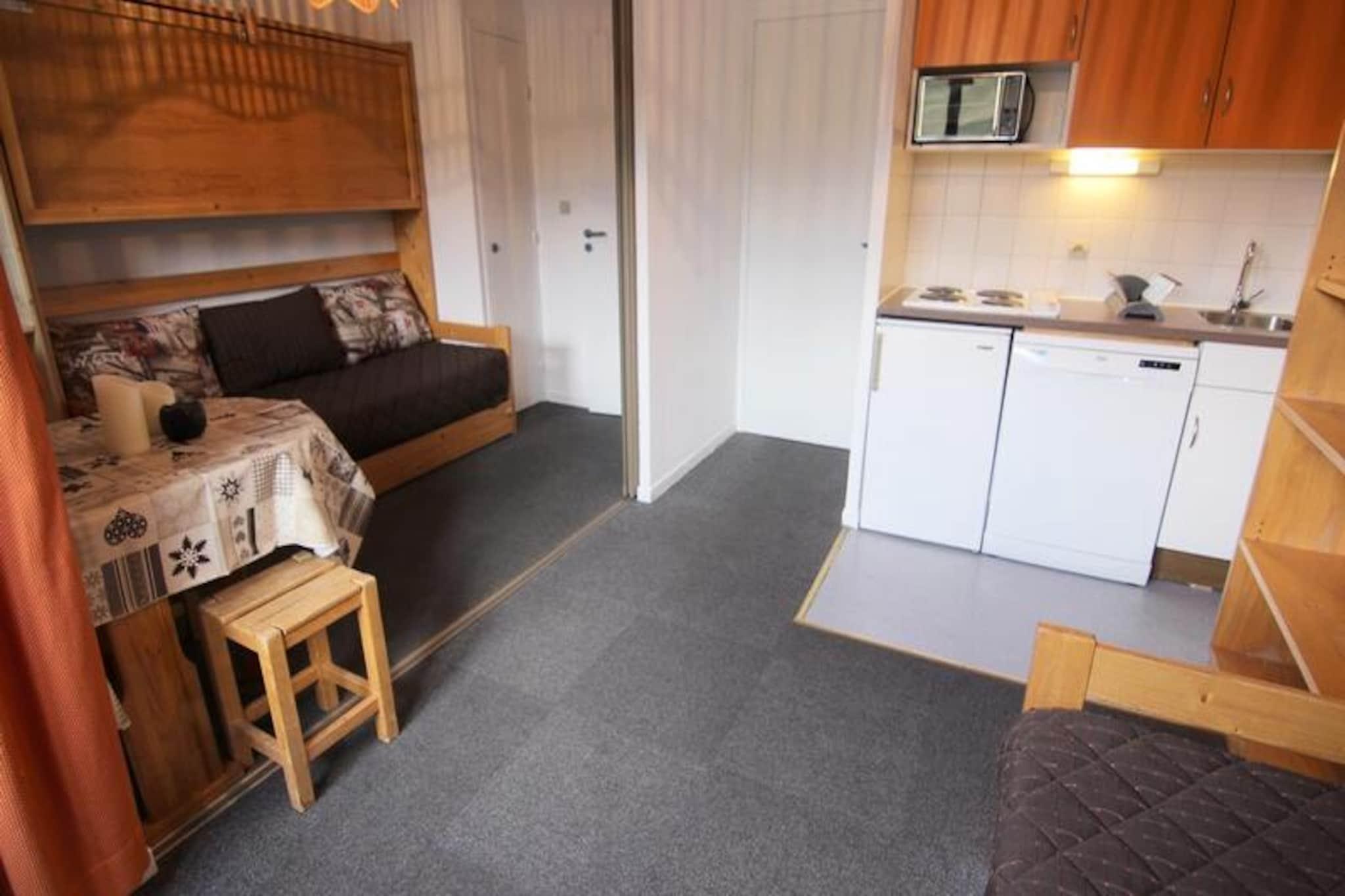 Vid porten till det pulserande Arolles-distriktet inbjuder denna charmiga lägenhet på bottenvåningen dig att uppleva magin i de franska Alperna i komfort och stil. Med sin balkong i söderläge vaknar du upp till den milda värmen från den alpina solen och njuter av fridfulla vyer som sätter tonen för en dag av äventyr. Oavsett om du är här för att åka skidor i backarna eller bara njuta av bergsatmosfären, erbjuder denna mysiga tillflyktsort den perfekta basen för din semester. \n\nLägenheten är designad för att rymma upp till fyra gäster och har ett omsorgsfullt inrett vardagsrum med en bäddsoffa för två personer och en separat stuga med ytterligare en bäddsoffa för två personer, vilket garanterar avskildhet och avkoppling för alla. Pentryt är utrustat med miniugn, mikrovågsugn, kylskåp, elektrisk spishäll och diskmaskin, vilket gör det enkelt att laga mat efter en dag av utforskande. Moderna bekvämligheter som TV och badkar bidrar till komforten, medan den separata toaletten garanterar bekvämlighet för familjer eller grupper. \n\nBara 30 meter från backarna har du enkel tillgång till skidåkning i världsklass, medan den närliggande Skiset-butiken gör det enkelt att hyra utrustning. Joker-residenset är idealiskt beläget nära busstationen, köpcentret och Caron sportcenter, vilket ger dig allt du behöver inom räckhåll. På sommaren förvandlas området till en fristad för vandrare och naturälskare, med stigar som visar upp Alpernas hisnande skönhet. \n\nOavsett om du söker spännande vintersport eller lugna sommarresor, erbjuder denna lägenhet ett välkomnande hem hemifrån i en av Frankrikes mest älskade bergsdestinationer.