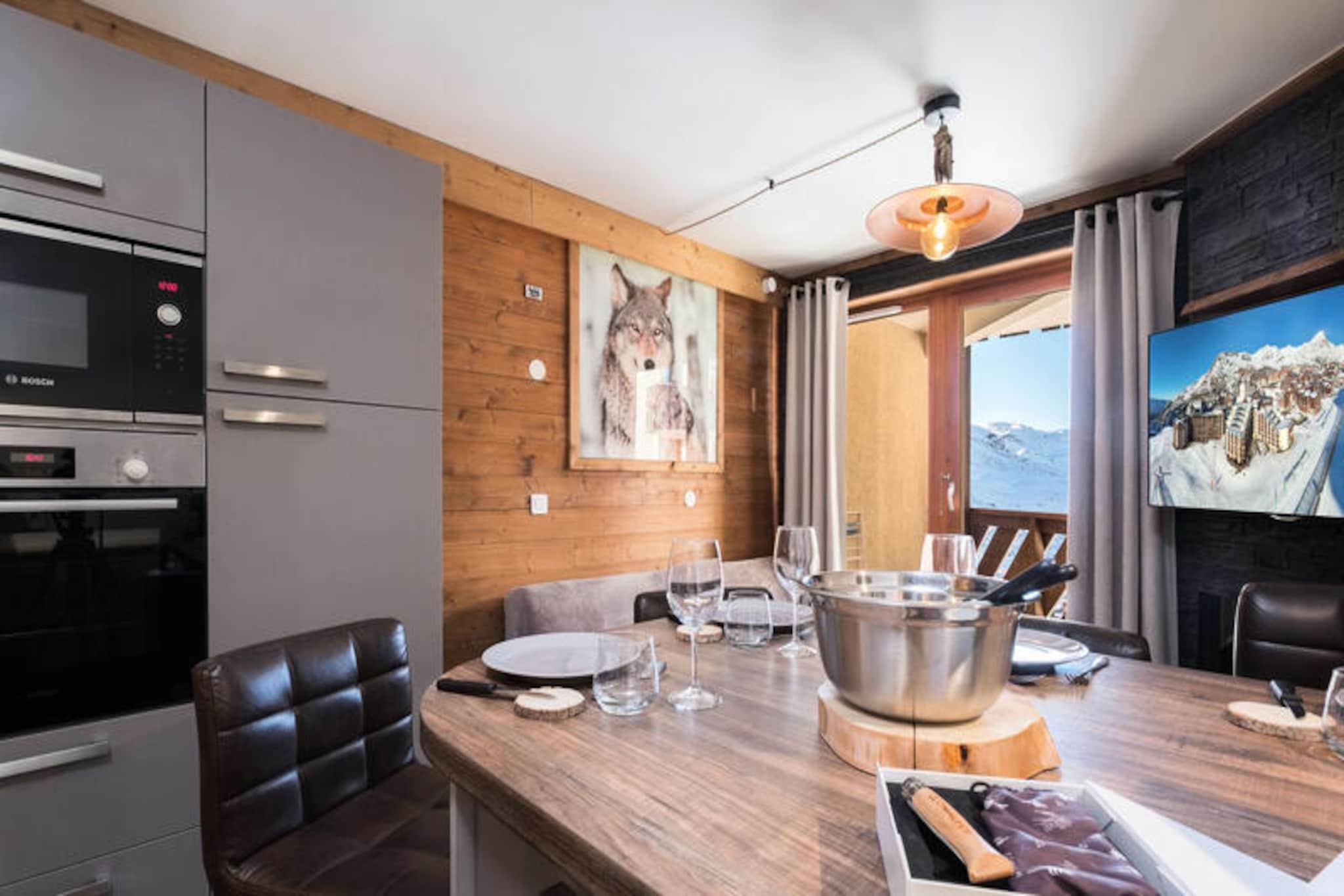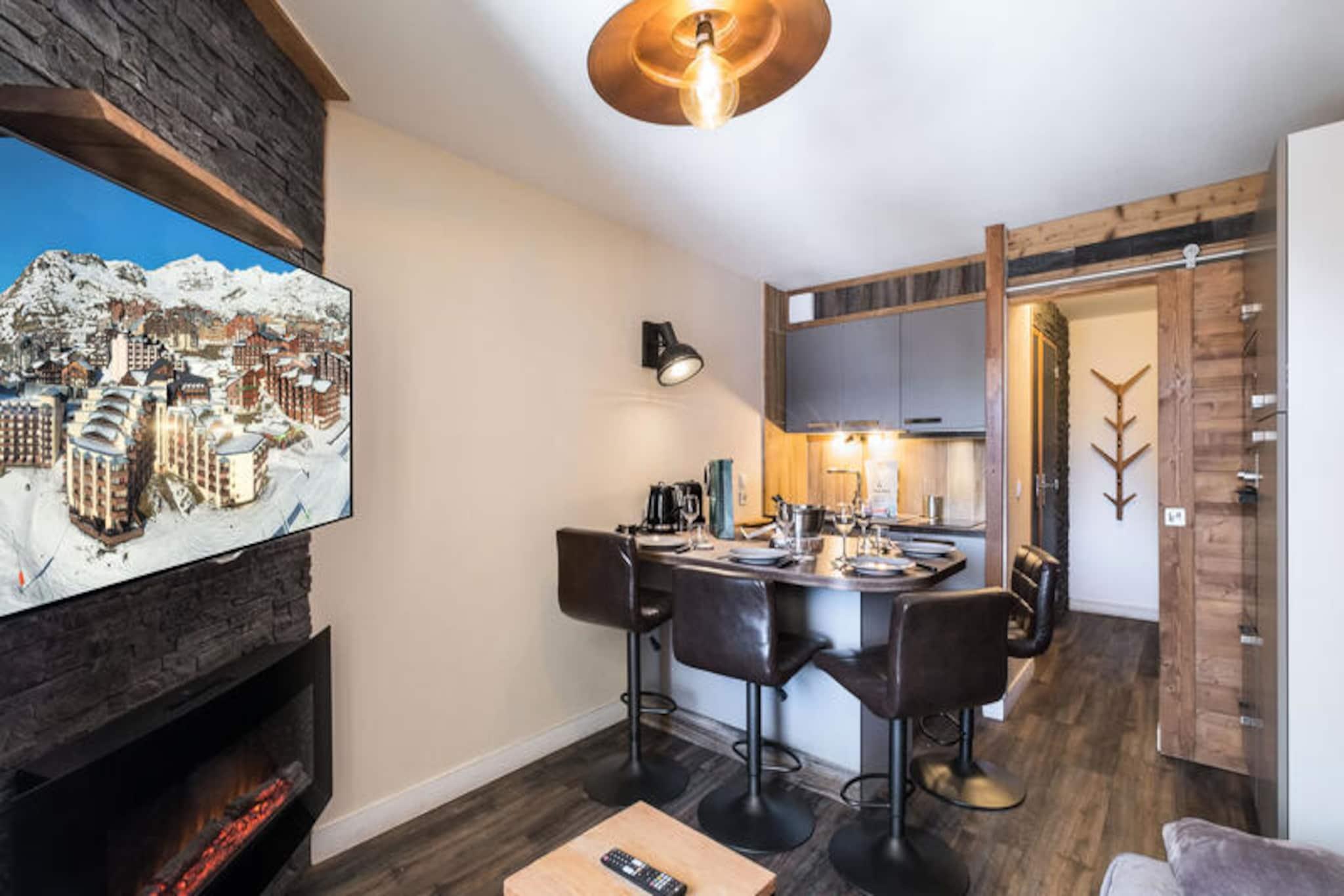 I hjärtat av Soleil-distriktet i Val Thorens erbjuder denna charmiga lägenhet i Machu Pichu-residenset en oöverträffad alpin reträtt med direkt tillgång till ski-in/ski-out. Från balkongen i västerläge kan gästerna beundra den fantastiska utsikten över Sommet de la Masse, en hisnande bakgrund till dina bergsäventyr. Oavsett om du är här för spänningen i backarna eller den fridfulla skönheten i de franska Alperna, lovar denna mysiga oas en minnesvärd vistelse. Lägenheten på 26 m² är omsorgsfullt utformad för att rymma upp till fyra gäster, vilket gör den idealisk för par eller små familjer. Köket och vardagsrummet med öppen planlösning skapar ett välkomnande utrymme att koppla av efter en dag i backarna, medan det privata sovrummet med dubbelsäng och en sovalkov med våningssängar garanterar vilsamma nätter. Ett modernt badrum och separat toalett bidrar till bekvämligheten, och den minimalistiska inredningen förstärker känslan av lugn och komfort. Gästerna kommer att uppskatta de extra bekvämligheterna, inklusive ett skidförvaringsskåp för enkel förvaring av utrustning och en privat täckt parkeringsplats mittemot residenset. Machu Pichu-residenset erbjuder även en rad inkluderade tjänster, såsom ett personligt välkomnande, sängkläder, toalettartiklar och bäddade sängar vid ankomst, vilket garanterar en smidig och stressfri upplevelse. Beläget vid foten av backarna är residenset perfekt positionerat för att utforska det världsberömda skidområdet Val Thorens. Förutom skidåkning erbjuder Soleil-distriktet en mängd olika afterski-alternativ, restauranger och shopping, allt inom gångavstånd. Oavsett om du söker äventyr eller avkoppling är denna lägenhet din port till en oförglömlig alpin flykt.