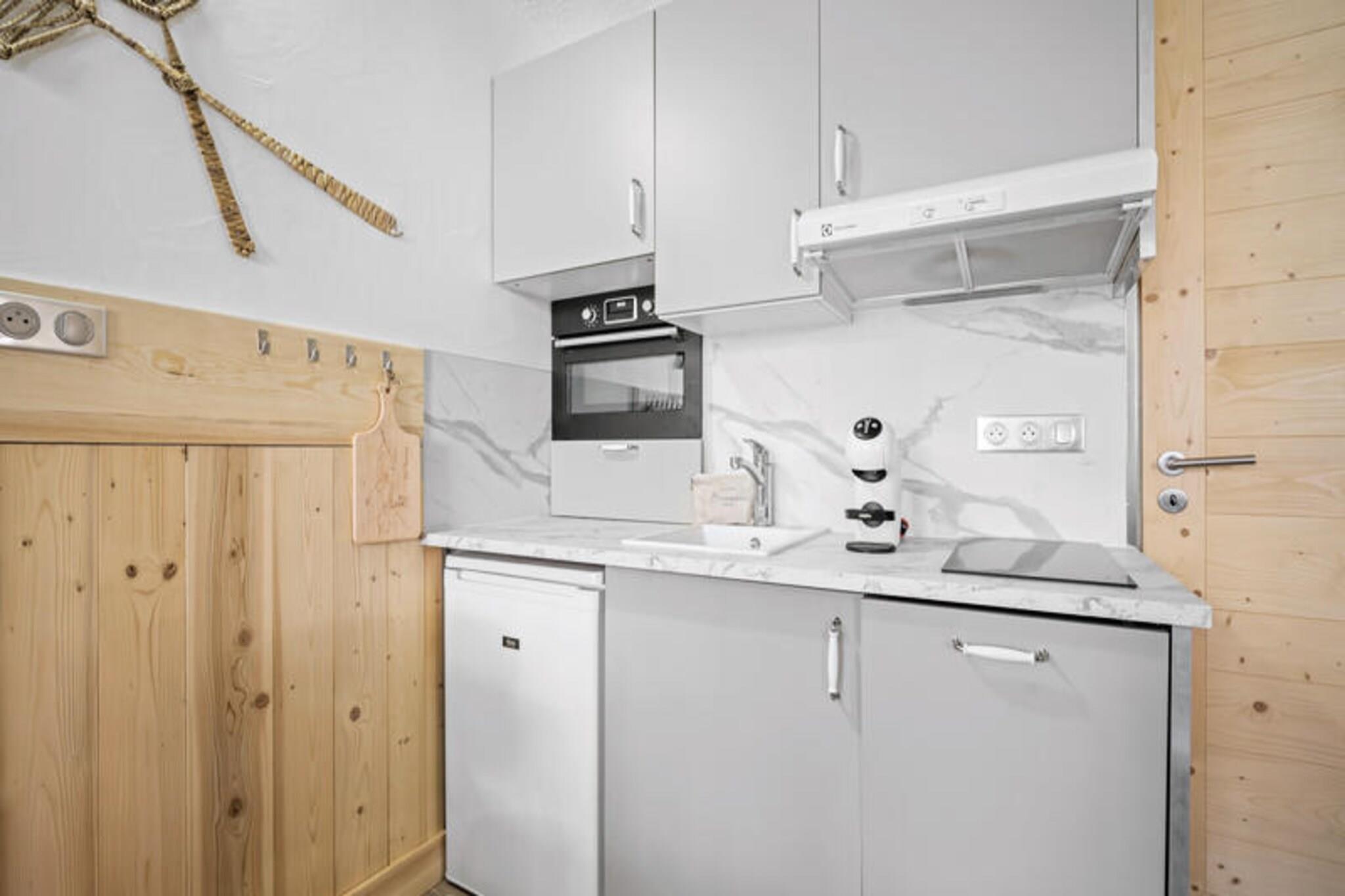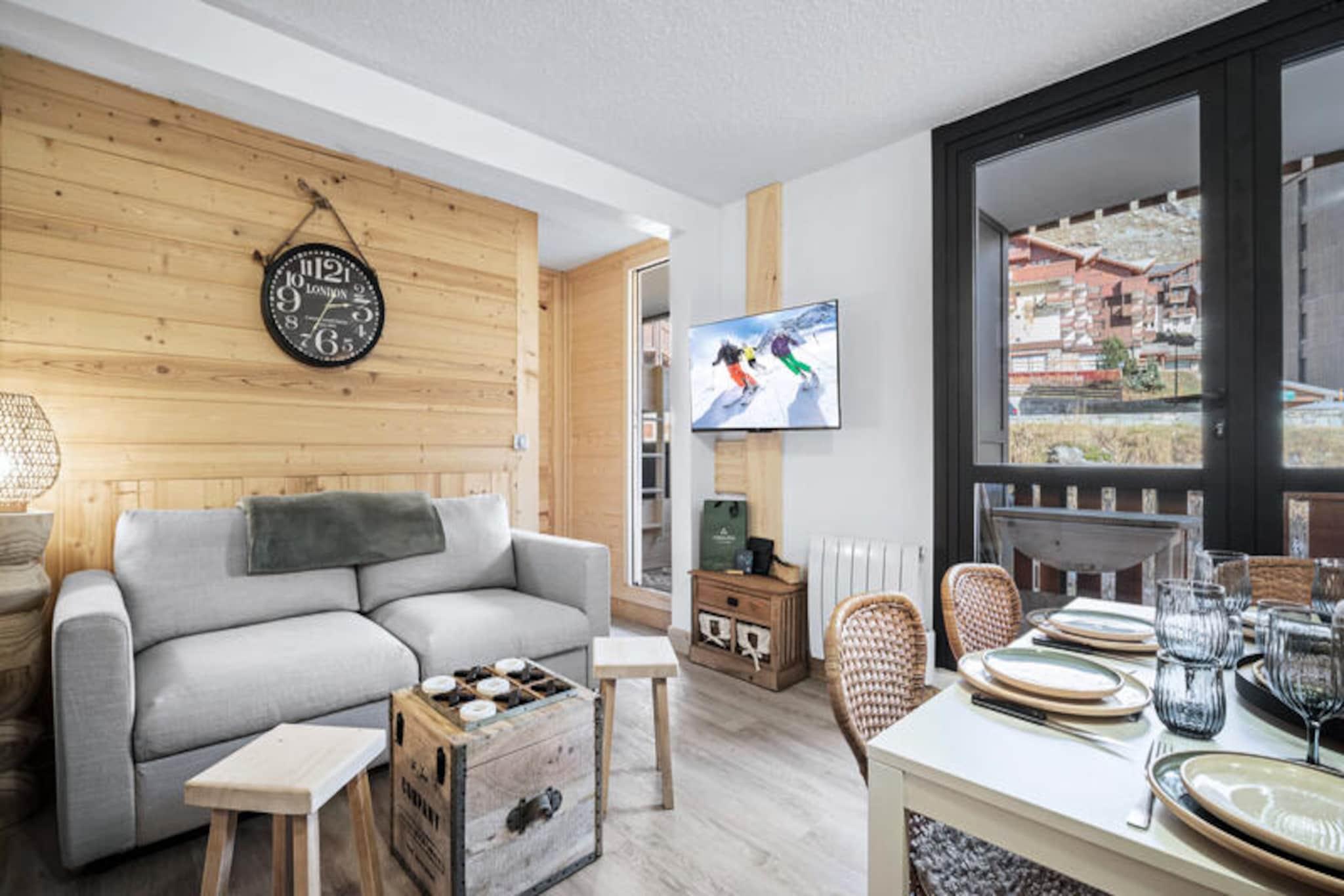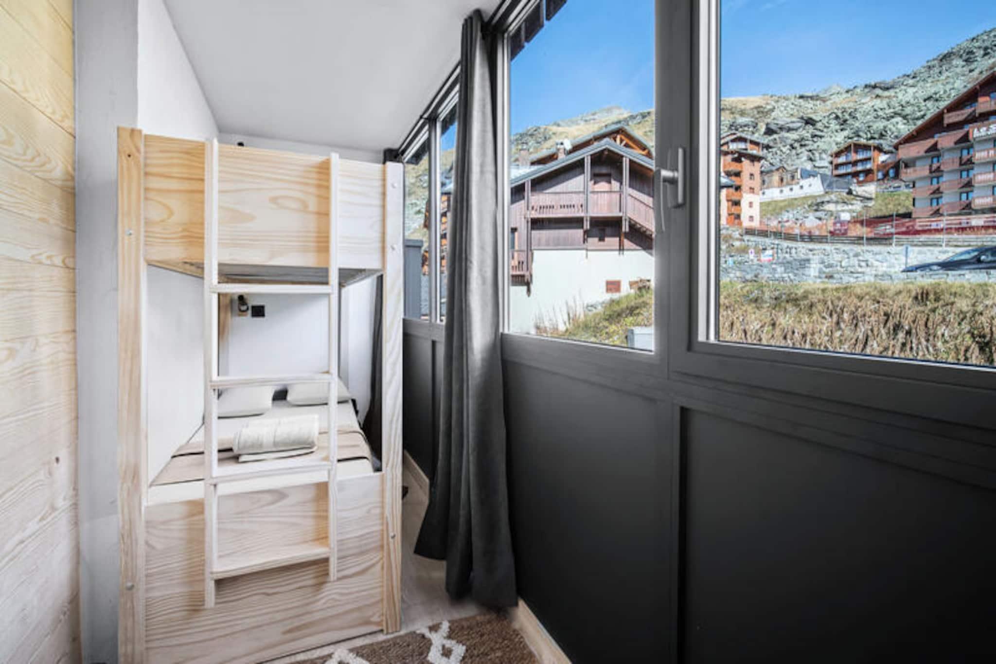 Ovanför Val Thorens skimrande takåsar inbjuder denna moderna alpina lägenhet dig att fördjupa dig i de franska Alpernas skönhet. Belägen på fjärde våningen i Les Hauts de la Vanoise-residenset, erbjuder denna oas en harmonisk blandning av modern design och bergscharm, perfekt för dig som söker både komfort och äventyr. Med stadens centrum och skidbackarna bara några steg bort börjar din alpina flykt i det ögonblick du anländer. Vakna upp till hisnande utsikter, andas in den friska bergsluften och förbered dig för en dag med spännande nedfarter eller lugn utforskning. \n\nInuti sträcker sig lägenheten över 34 kvadratmeter och har omsorgsfullt renoverats med en minimalistisk estetik som kompletterar dess naturliga omgivningar. Planlösningen inkluderar ett mysigt sovrum med dubbelsäng, ett charmigt våningssängrum perfekt för barn eller vänner, och ett vardagsrum med öppen planlösning och ett fullt utrustat kök. Ett modernt badrum och separat toalett garanterar bekvämlighet, medan den välkomnande atmosfären gör det enkelt att varva ner efter en dag i backarna. Gästerna bjuds på premiumtjänster, inklusive nybäddade sängar, kvalitetslakan, toalettartiklar och slutstädning, vilket garanterar en smidig och avkopplande upplevelse. \n\nVal Thorens erbjuder mer än bara skidåkning; det är en delvis gågatorad semesterort med livliga afterski-möjligheter, lokala butiker och restauranger som serverar specialiteter från Savoien. Oavsett om du utforskar det vidsträckta skidområdet Les Trois Vallées eller njuter av sommarvandringslederna, är denna plats en inkörsport till oförglömliga alpina äventyr. Med obligatorisk parkeringsbokning och concierge-tjänster har varje detalj beaktats för att göra din vistelse enkel. \n\nVälj detta boende för dess oslagbara läge, moderna bekvämligheter och löftet om att skapa bestående minnen i hjärtat av Alperna.