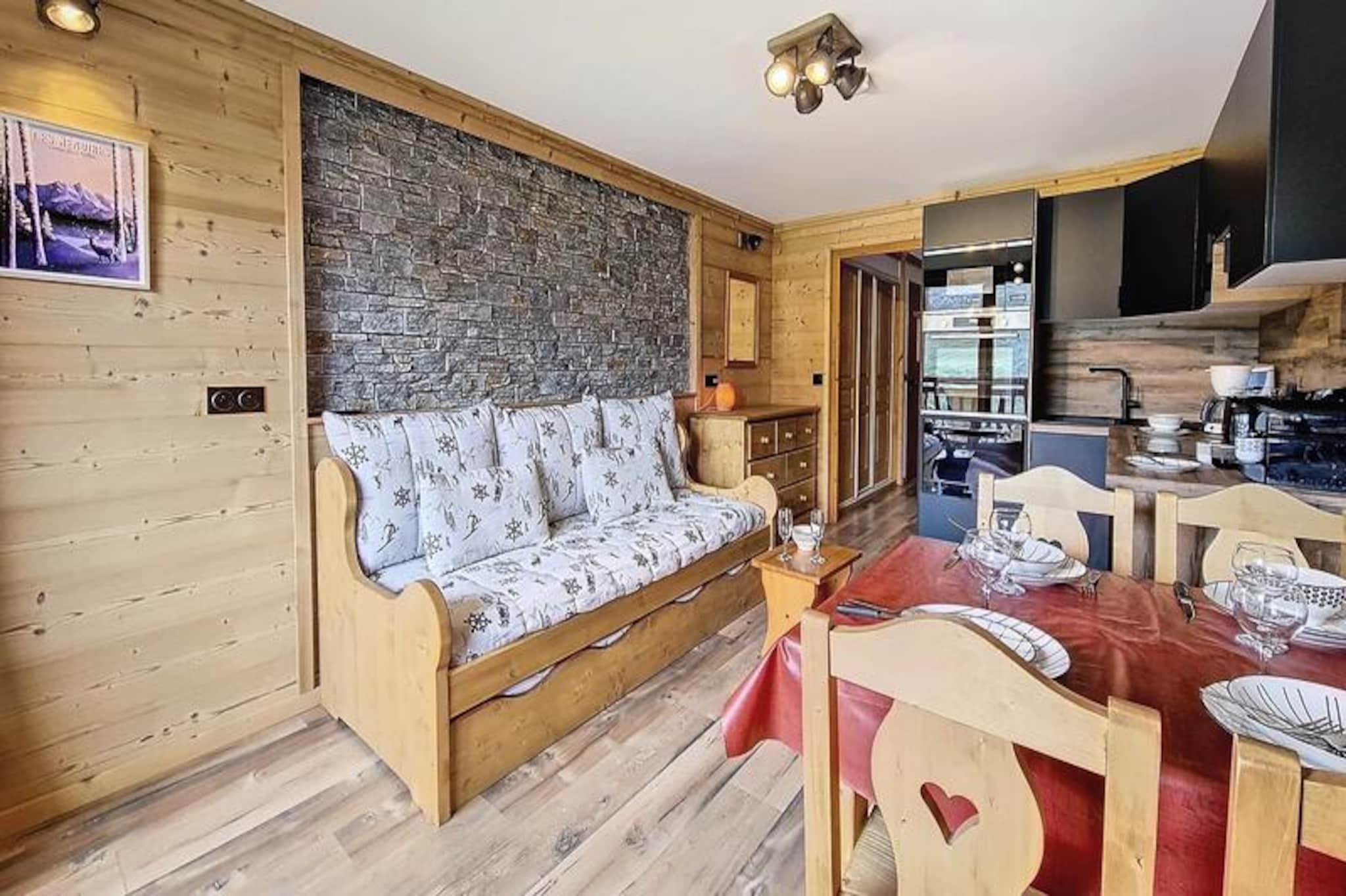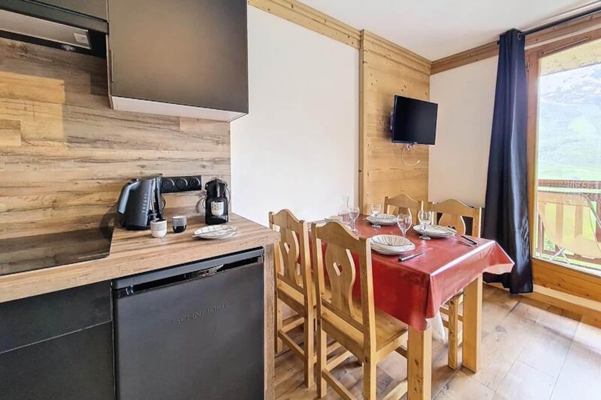 Högt ovanför det charmiga Bruyères-distriktet erbjuder denna moderna alpina lägenhet en mysig tillflyktsort för dig som söker både äventyr och avkoppling i hjärtat av Les Menuires. Belägen på 12:e våningen har residensen en balkong i söderläge där du kan njuta av solen och beundra den hisnande utsikten över bergen, vilket skapar den perfekta miljön för ditt morgonkaffe eller en afterski-avkoppling. Lägenheten, som nyligen renoverades 2023, kombinerar modern komfort med en varm bergestetik, vilket gör den till en inbjudande oas efter en dag i backarna. Inuti är den 30 m² stora ytan noggrant utformad för att rymma upp till fyra gäster. Vardagsrummet har en bäddsoffa för en enda person och en utdragbar säng, medan det separata sovrummet erbjuder en lyxig dubbelsäng för vilsamma nätter. Det fullt utrustade köket har moderna apparater som mikrovågsugn/grill, diskmaskin och kaffebryggare, vilket säkerställer att du har allt som behövs för att laga rejäla måltider. Badrummet med badkar och separat toalett bidrar till bekvämligheten, medan laminatgolv i hela lägenheten förstärker den mysiga atmosfären. Kliv ut, och du är bara några minuter från Bruyères pulserande hjärta. Området är fullt av bekvämligheter, inklusive restauranger, butiker, skidskola, rodelbana och till och med en vattenpark och ett hälsocenter för ultimat avkoppling. Familjer kommer att uppskatta den närliggande lekplatsen, medan bioälskare kan se en film bara några steg från boendet. Med skidliftar och backar precis utanför dörren är läget en dröm för vintersportsentusiaster. Oavsett om du är här för att åka i färskt pudersnö, utforska den livliga byn eller bara njuta av den fridfulla alpina atmosfären, erbjuder denna lägenhet den perfekta basen för en oförglömlig bergssemester. Upplev magin i Les Menuires och skapa minnen som varar livet ut.