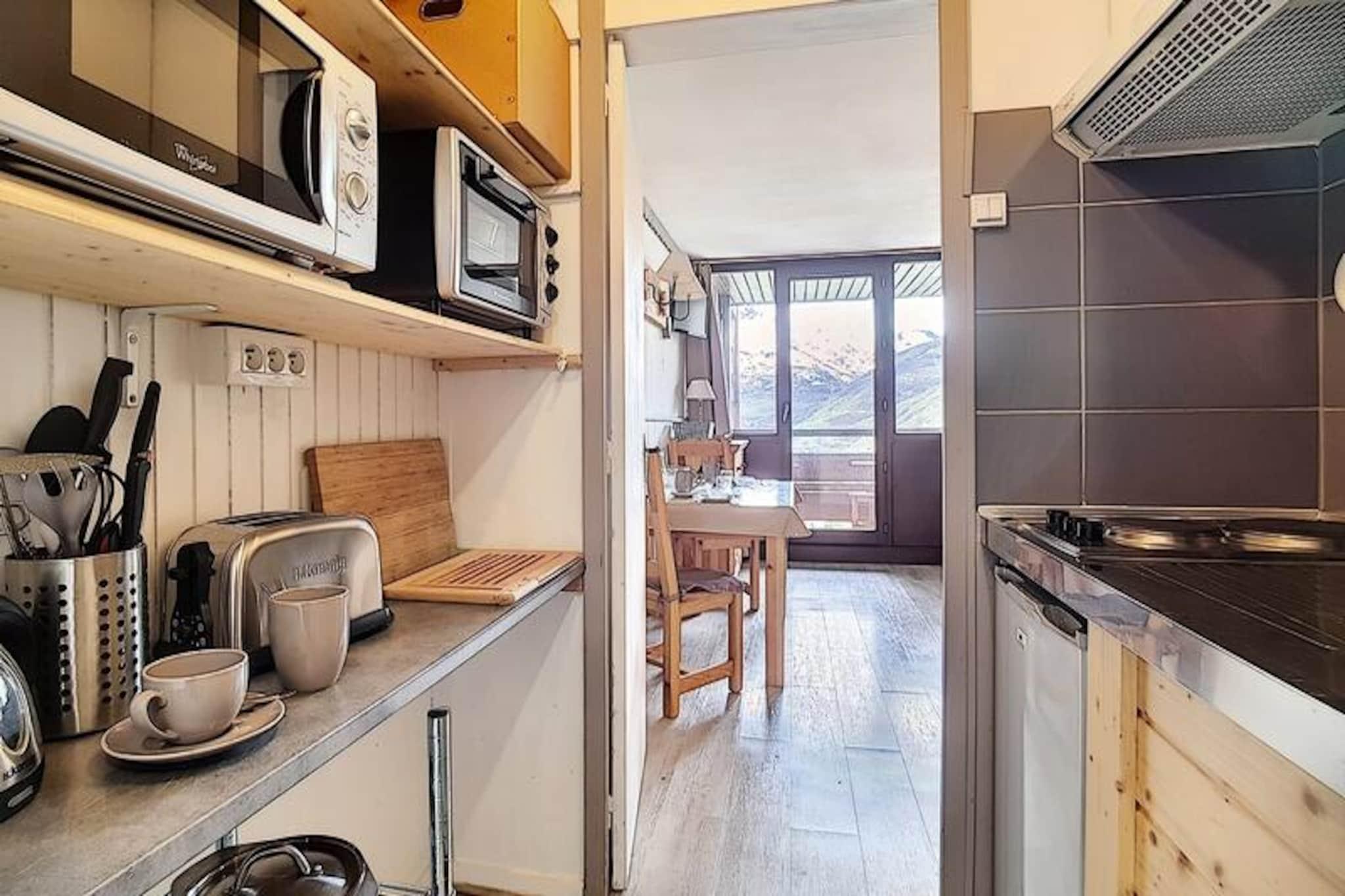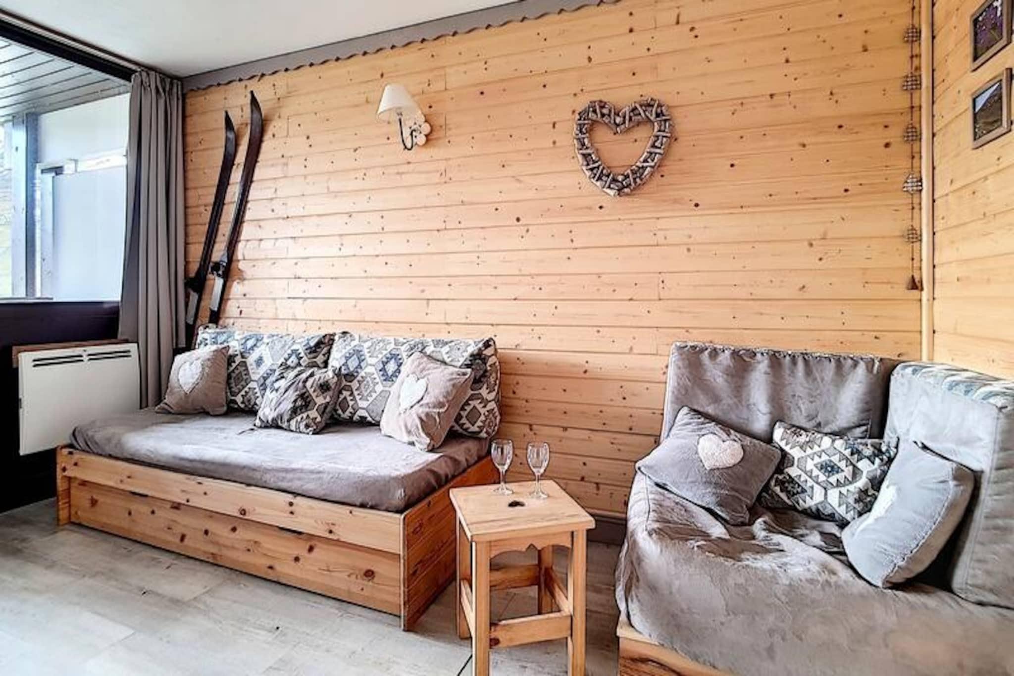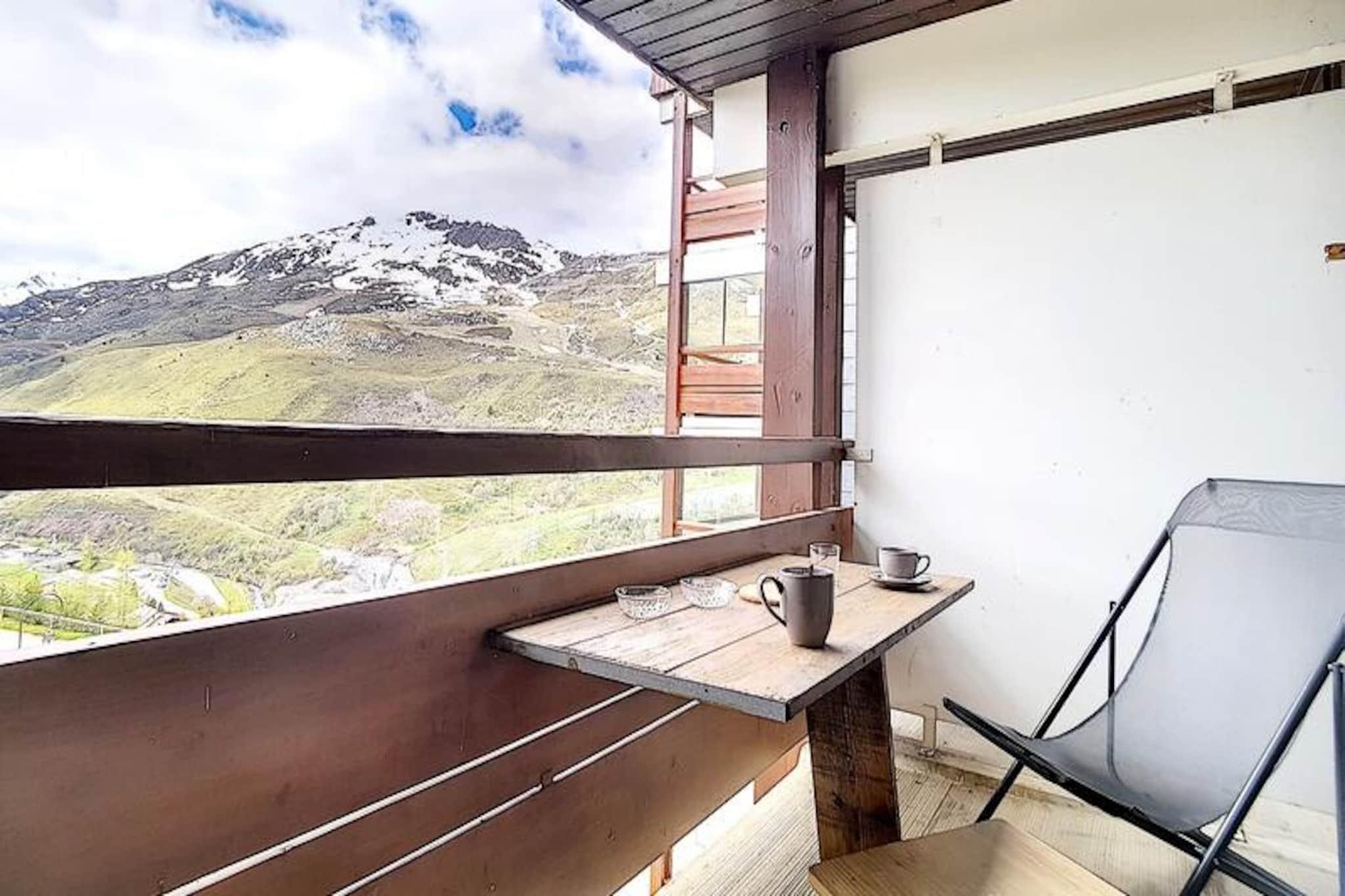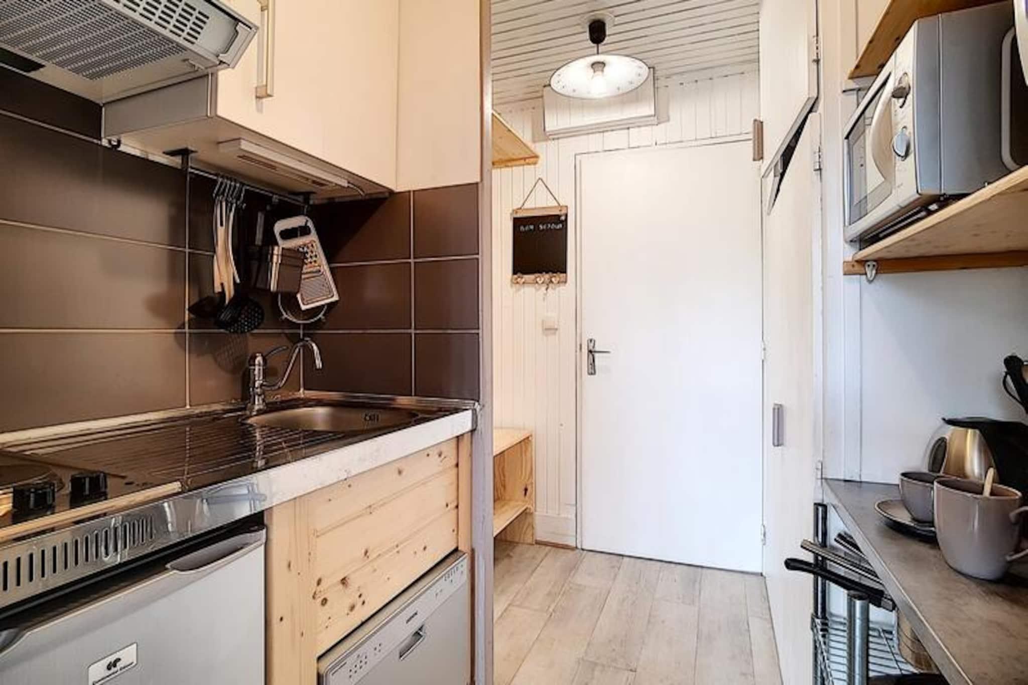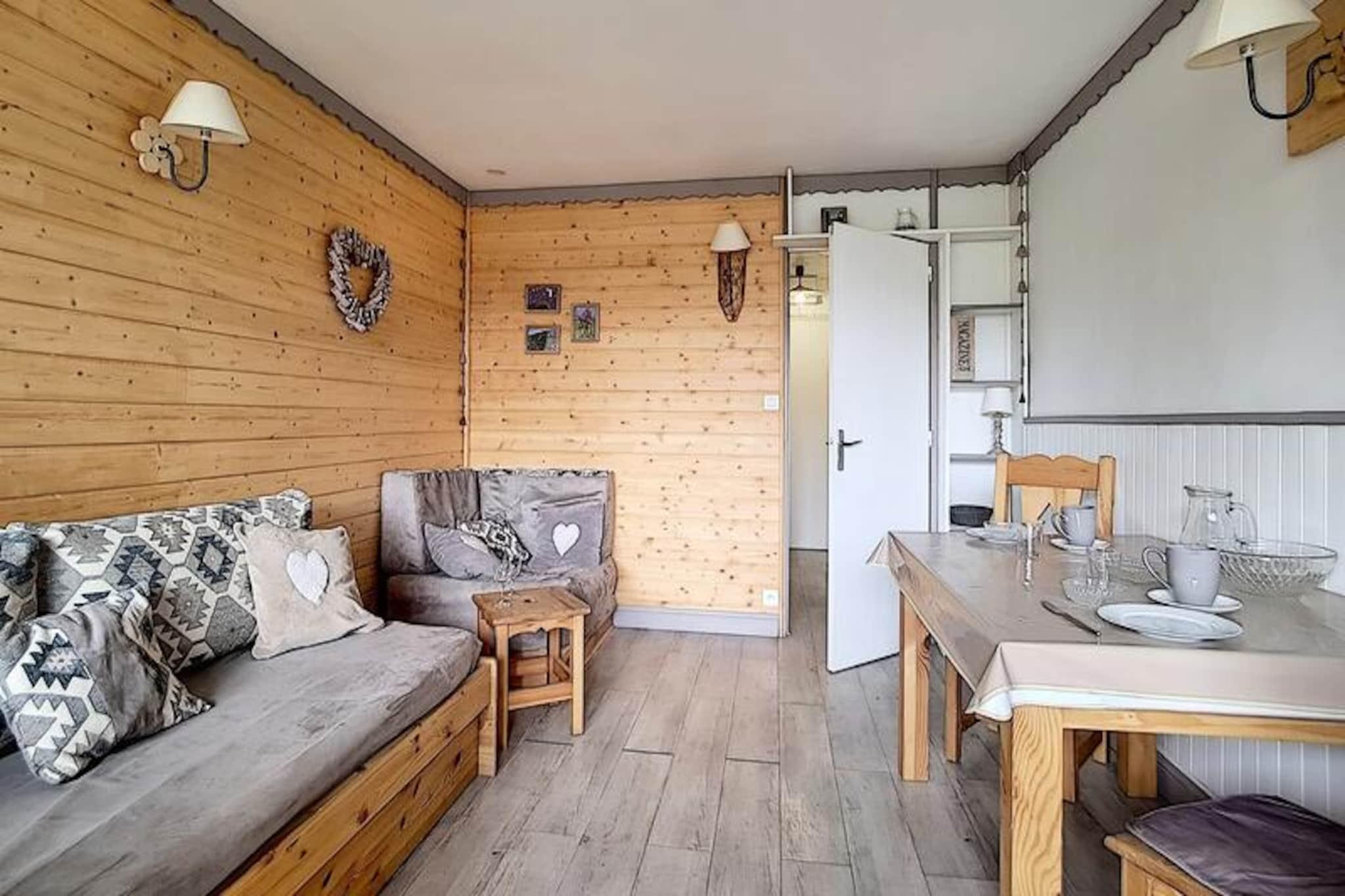 Högt ovanför semesteranläggningens livliga gator erbjuder denna charmiga studiolägenhet en mysig tillflyktsort med fantastisk utsikt i söderläge från sin balkong på sjunde våningen. Perfekt för par eller ensamresenärer som söker en lugn alpin semester, kombinerar detta renoverade utrymme på 19 m² modern bekvämlighet med värmen i traditionellt bergsliv. Oavsett om du är här för att åka skidor, vandra eller bara koppla av, sätter lägenhetens välkomnande atmosfär tonen för en oförglömlig semester. \n\nInuti hittar du ett omsorgsfullt utformat vardagsrum med en bäddsoffa för en enda person och en utdragbar säng, perfekt för vilsamma nätter efter en dag av äventyr. Pentryt är utrustat med allt du behöver, inklusive elektriska spisar, kylskåp, miniugn, mikrovågsugn, brödrost, vattenkokare och kaffebryggare, vilket gör det enkelt att laga mat och snacks. Badrummet, komplett med badkar och toalett, garanterar komfort och bekvämlighet. Med linoleumgolv och mysiga filtar är denna rökfria lägenhet ett härligt hem hemifrån. \n\nBeläget bara 100 meter från backarna erbjuder residenset oöverträffad tillgång till vintersport och alpina aktiviteter. Köpcentrumet La Croisette ligger bara 50 meter bort och erbjuder en mängd olika butiker och matställen. Familjer kommer att uppskatta daghemmet och snöträdgården som är bekvämt belägna vid foten av byggnaden, medan den närliggande busshållplatsen säkerställer enkel transport i hela anläggningen. Skidförvaring i källaren gör denna välutrustade fastighet ännu mer praktisk. \n\nOavsett om du dras till spänningen i backarna eller bergens fridfulla skönhet, är denna studiolägenhet din port till det bästa av alpint liv. Koppla av, ladda batterierna och skapa bestående minnen i denna idylliska miljö.