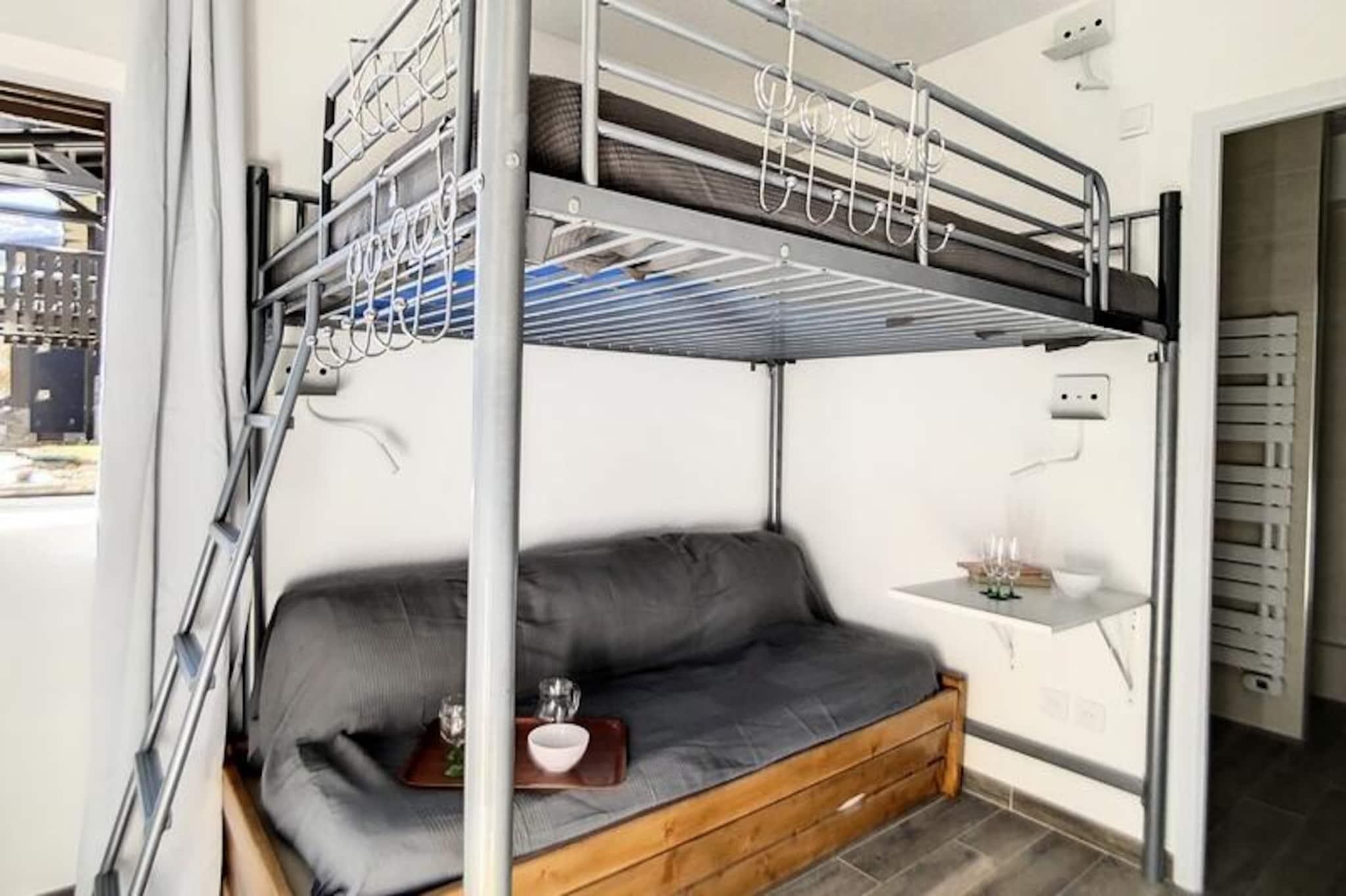 I det fridfulla Fontanettes-distriktet i Les Menuires inbjuder denna charmiga lägenhet på bottenvåningen dig att varva ner i en lugn alpin miljö. Bara fem minuters promenad via offentliga trappor till det livliga Croisette-distriktet, kommer du att njuta av den perfekta balansen mellan lugn och närhet till hjärtat av orten. Med gratis parkering bekvämt belägen vid foten av residenset är din ankomst och avresa problemfri, vilket ger dig mer tid att njuta av bergsluften och det hisnande landskapet. \n\nDenna mysiga lägenhet på 25 m² är nyrenoverad och omsorgsfullt utformad för att rymma upp till fyra gäster. Vardagsrummet har en bekväm bäddsoffa för två personer och en TV för avkopplande kvällar, medan sovrummet, separerat av en skjutdörr, erbjuder en unik dubbelsäng på mezzaninen för vilsamma nätter. Köket med öppen planlösning är fullt utrustat med moderna apparater, inklusive en spishäll med två plattor, diskmaskin, mikrovågsugn, ugn och ett rymligt kylskåp, vilket gör det enkelt att laga rejäla måltider efter en dag av äventyr. Badrummet har en uppfriskande dusch, och den separata toaletten gör din vistelse ännu bekvämare. Les Menuires är känt för sin skidåkning och sina utomhusaktiviteter i världsklass, och Fontanettes-distriktet erbjuder enkel tillgång till båda. Oavsett om du utforskar backarna, vandrar längs natursköna leder eller njuter av den livliga afterski-atmosfären på Croisetten, fungerar denna lägenhet som en idealisk bas för din alpina flykt. Residensens fridfulla omgivningar och bergscharm skapar en välkomnande tillflyktsort efter en spännande dag. Denna rökfria lägenhet är perfekt för par eller små familjer och kombinerar komfort, praktiskhet och en touch av elegans. Med sitt Silver Snowflake-betyg lovar den en minnesvärd vistelse i en av Frankrikes mest älskade skiddestinationer. Gör detta till ditt hem hemifrån och upplev magin i Les Menuires.
