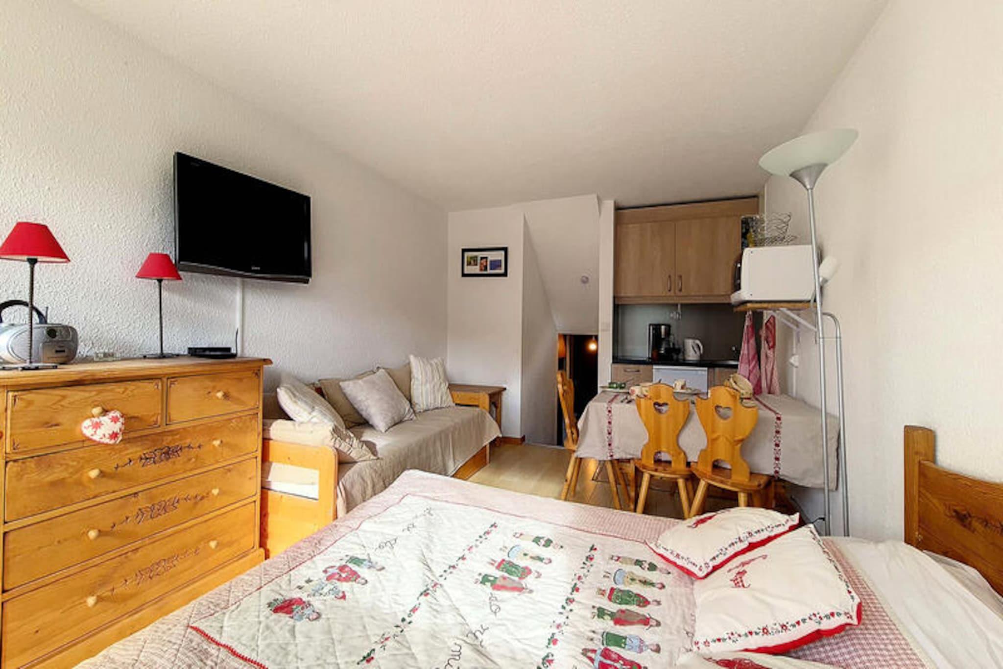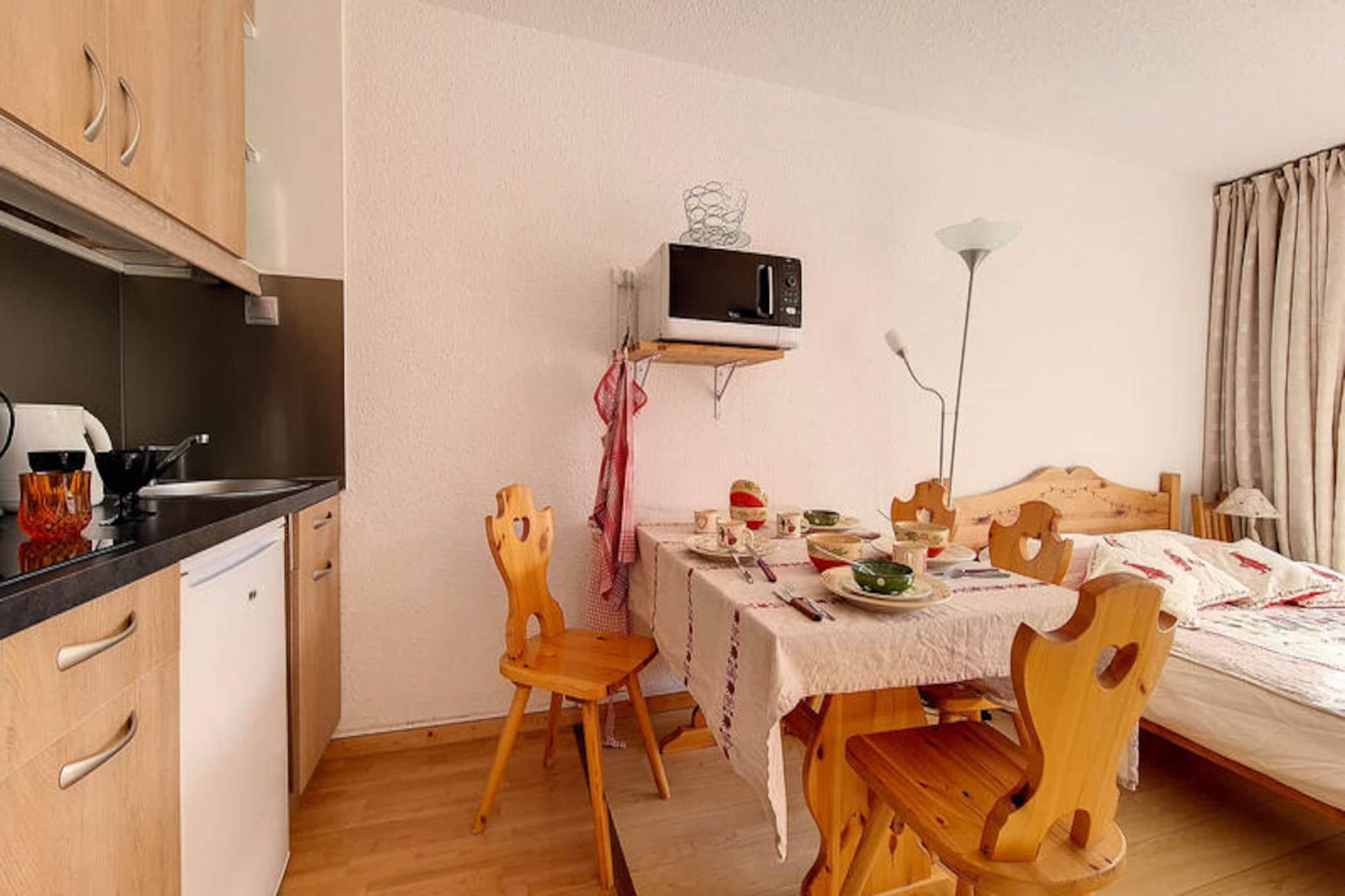 Högt ovanför den livliga skidorten Les Menuires erbjuder Brelin-byggnaden en fridfull tillflyktsort med panoramautsikt över det omgivande alpina landskapet. Belägen ovanför det livliga distriktet La Croisette kombinerar denna studiolägenhet bekvämlighet och lugn, tillgänglig via dygnet runt-öppna hissar som förbinder dig med hjärtat av skidorten. Tänk dig att vakna upp till värmen från södra solen på din privata balkong, med de snöklädda topparna som sträcker sig framför dig – en perfekt start på din dag i de franska Alperna. \n\nDenna mysiga studio på 20 m² är omsorgsfullt utformad för att rymma upp till tre gäster. Vardagsrummet har en bekväm dubbelsäng och en bäddsoffa, kompletterad med en TV för avkopplande kvällar. Det integrerade köket är utrustat med moderna apparater, inklusive en spishäll med två plattor, kombinerad mikrovågsugn/ugn, kylskåp, vattenkokare, brödrost och kaffebryggare, vilket gör det enkelt att laga mat efter en dag i backarna. Badrummet har badkar och tvättmaskin, medan en separat toalett ger extra bekvämlighet. Filtar finns, vilket garanterar en varm och vilsam vistelse. Observera att våningssängen inte är lämplig för barn under sex år, och husdjur är inte tillåtna.\n\nBrelin-byggnaden är ett bekvämt centrum, med butiker, liftbiljettkontor och skidförvaring i området. Gratis parkering finns vid foten av byggnaden nära Danchet-liften, vilket gör det enkelt att utforska omgivningarna. För de som söker äventyr ligger backarna bara några steg bort, medan avgiftsbelagt Wi-Fi säkerställer att du håller dig uppkopplad under din vistelse.\n\nOavsett om du är här för att åka skidor, koppla av eller bara njuta av den alpina atmosfären, erbjuder denna studiolägenhet den perfekta basen för en oförglömlig bergsflykt. Låt den exceptionella utsikten och solskenet inspirera ditt nästa äventyr i Les Menuires.