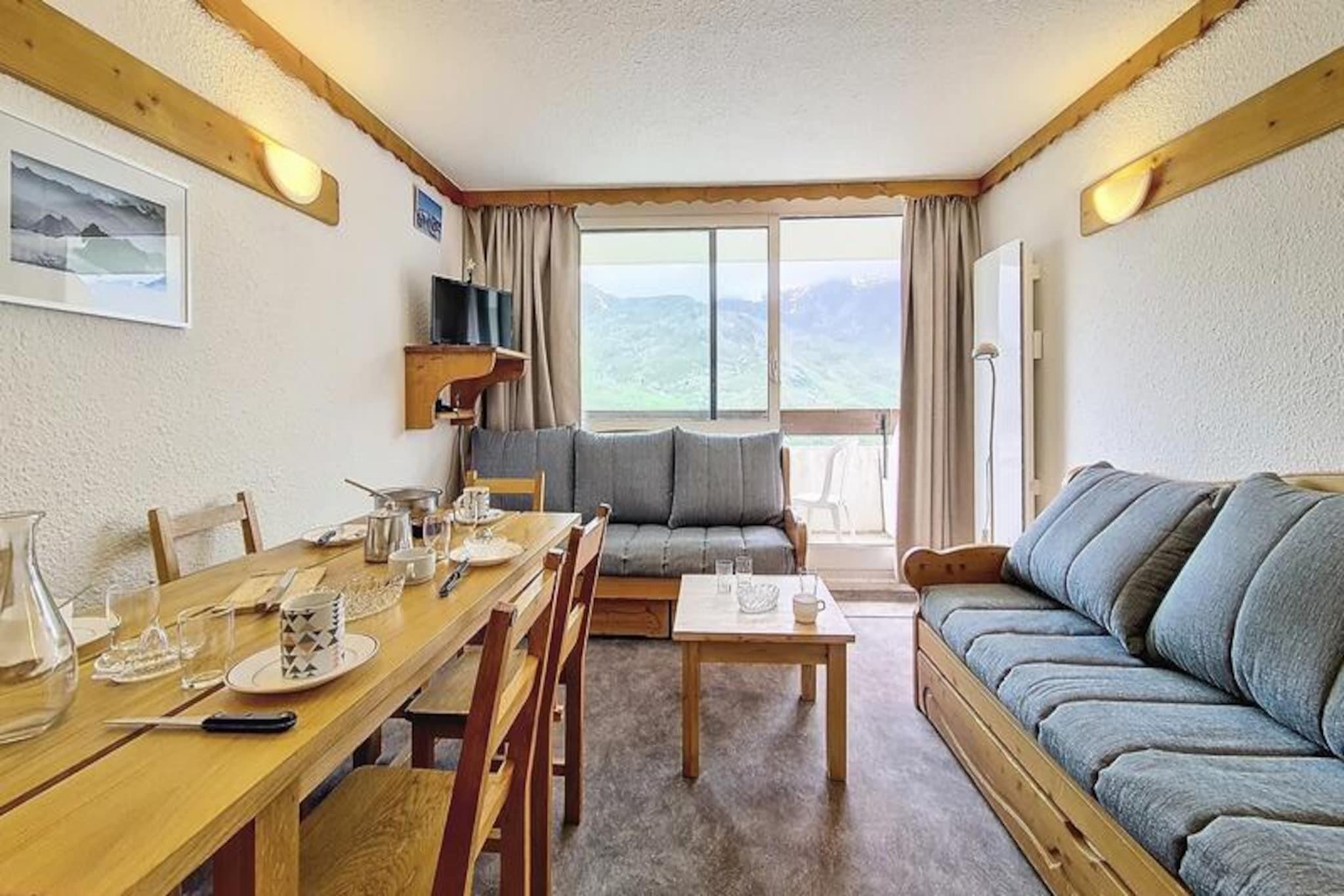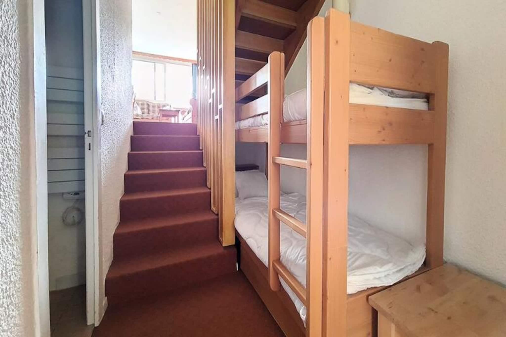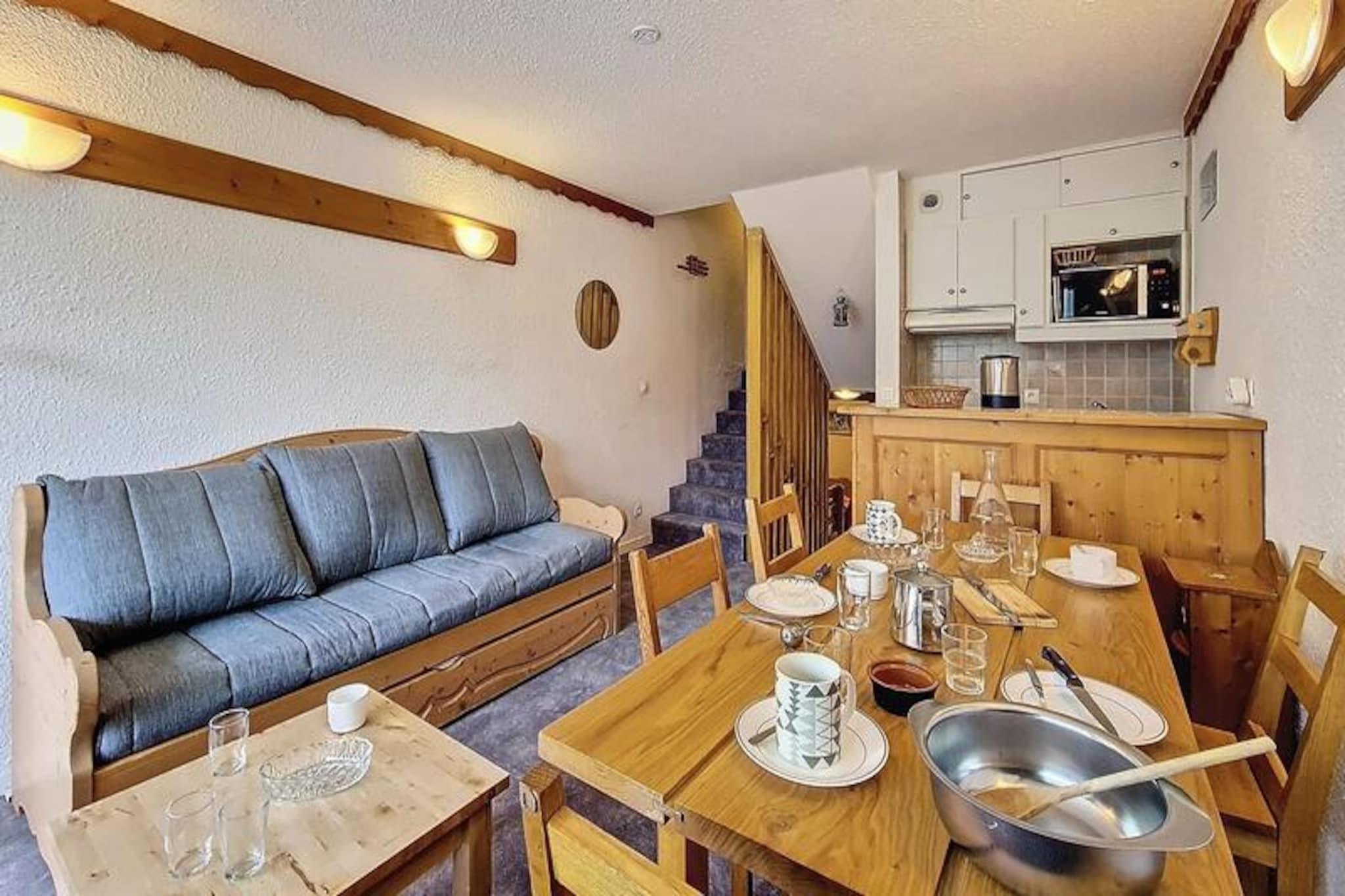Högt ovanför den livliga skidorten Les Menuires erbjuder denna charmiga duplexlägenhet i Brelin-byggnaden en lugn alpin tillflyktsort med panoramautsikt över de omgivande topparna. Bekvämt beläget ovanför La Croisette-distriktet, är fastigheten tillgänglig via dygnet runt-öppna hissar, vilket garanterar enkel åtkomst till hjärtat av skidorten samtidigt som du bibehåller en fridfull tillflyktsort. Oavsett om du är här för att åka skidor eller bara för att njuta av bergsatmosfären, är denna lägenhet den perfekta basen för dina äventyr. \n\nDenna helrenoverade duplex med två rum är 39 m² stor och rymmer upp till fem gäster, vilket gör den idealisk för små familjer eller grupper. Den syd-/västvända balkongen inbjuder dig att koppla av och njuta av den soliga utsikten efter en dag i backarna. Inuti finns vardagsrummet med en bäddsoffa för en person och en utdragbar säng, kompletterat av en TV för mysiga kvällar. Det välutrustade köket har en spishäll med 2 plattor, mikrovågsugn, miniugn, kylskåp, diskmaskin, brödrost, vattenkokare och kaffebryggare, vilket säkerställer att du har allt som behövs för att laga mat. På övervåningen finns sovrummet med en bekväm dubbelsäng, medan en sovalkov under trappan erbjuder en extra enkelsäng. Det moderna badrummet har dusch och det finns en separat toalett för extra bekvämlighet.\n\nLägenheten ligger på 12:e våningen med hiss och har även skidförvaring på bottenvåningen, vilket gör det enkelt att förvara din utrustning. I Brelin-byggnaden finns butiker och liftbiljettkontor, medan gratis parkering finns vid den närliggande Danchet-liften. För dig som söker uppkoppling finns avgiftsbelagd Wi-Fi-åtkomst tillgänglig, beroende på nätverkstäckning.\n\nOavsett om du dras till backarna eller den pulserande atmosfären i Les Menuires, kombinerar denna lägenhet komfort, bekvämlighet och fantastisk utsikt för en oförglömlig alpin semester.