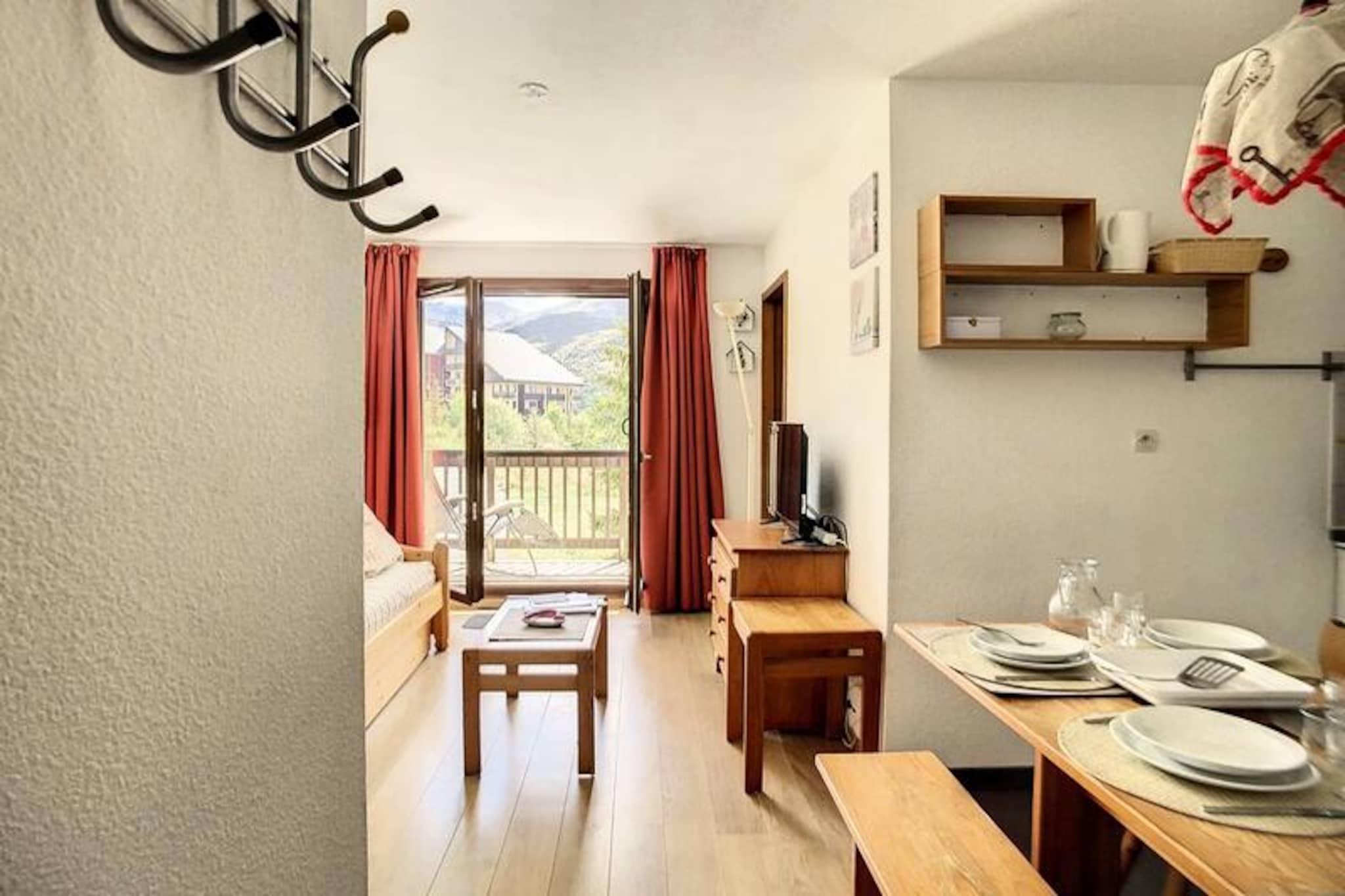 Högt ovanför de fridfulla sluttningarna av de franska Alperna erbjuder denna charmiga lägenhet i residenset Balcons d'Olympie en mysig tillflyktsort för både äventyrare och naturälskare. Med hisnande utsikt från sin balkong i söderläge inbjuder lägenheten dig att njuta av den lugna skönheten i Preyerand-distriktet, där alpin charm möter modern bekvämlighet. Oavsett om du är här för att åka skidor, vandra eller bara varva ner, lovar atmosfären en oförglömlig flykt. \n\nInuti är lägenheten noggrant utformad för att rymma upp till sex gäster fördelade på sina två rum och sovalkov. Vardagsrummet har en enkelsäng och en utdragbar säng, medan sovrummet har två enkelsängar separerade med en skjutdörr för extra avskildhet. Alkoven, utrustad med en dubbel våningssäng, erbjuder ett mysigt utrymme för yngre gäster. Ett välutrustat kök inkluderar kylskåp, miniugn, diskmaskin och viktiga apparater som vattenkokare och kaffebryggare, vilket gör det enkelt att laga mat efter en dag av äventyr. Badrummet har ett badkar för ett avkopplande dopp, och den separata toaletten ökar bekvämligheten. Filtar finns och Wi-Fi mot avgift finns tillgängligt, vilket garanterar en bekväm vistelse. \n\nResidenset har direkt tillgång till ski-in/ski-out, vilket gör det till en dröm för vintersportsentusiaster. Den kostnadsfria gondolbanan TéléPreyerand förbinder dig direkt med det centrala La Croisette-området, där du hittar liftbiljettkontor, butiker och restauranger – allt mindre än 10 minuters promenad bort. På sommaren förvandlas regionen till en fristad för vandrare och mountainbikecyklister, med stigar som leder till fantastiska vyer och alpina ängar. \n\nOavsett om du söker spännande backar eller fridfulla bergsupplevelser, är denna lägenhet din port till det bästa av de franska Alperna. Låt den friska alpina luften och den majestätiska omgivningen inspirera ditt nästa äventyr.