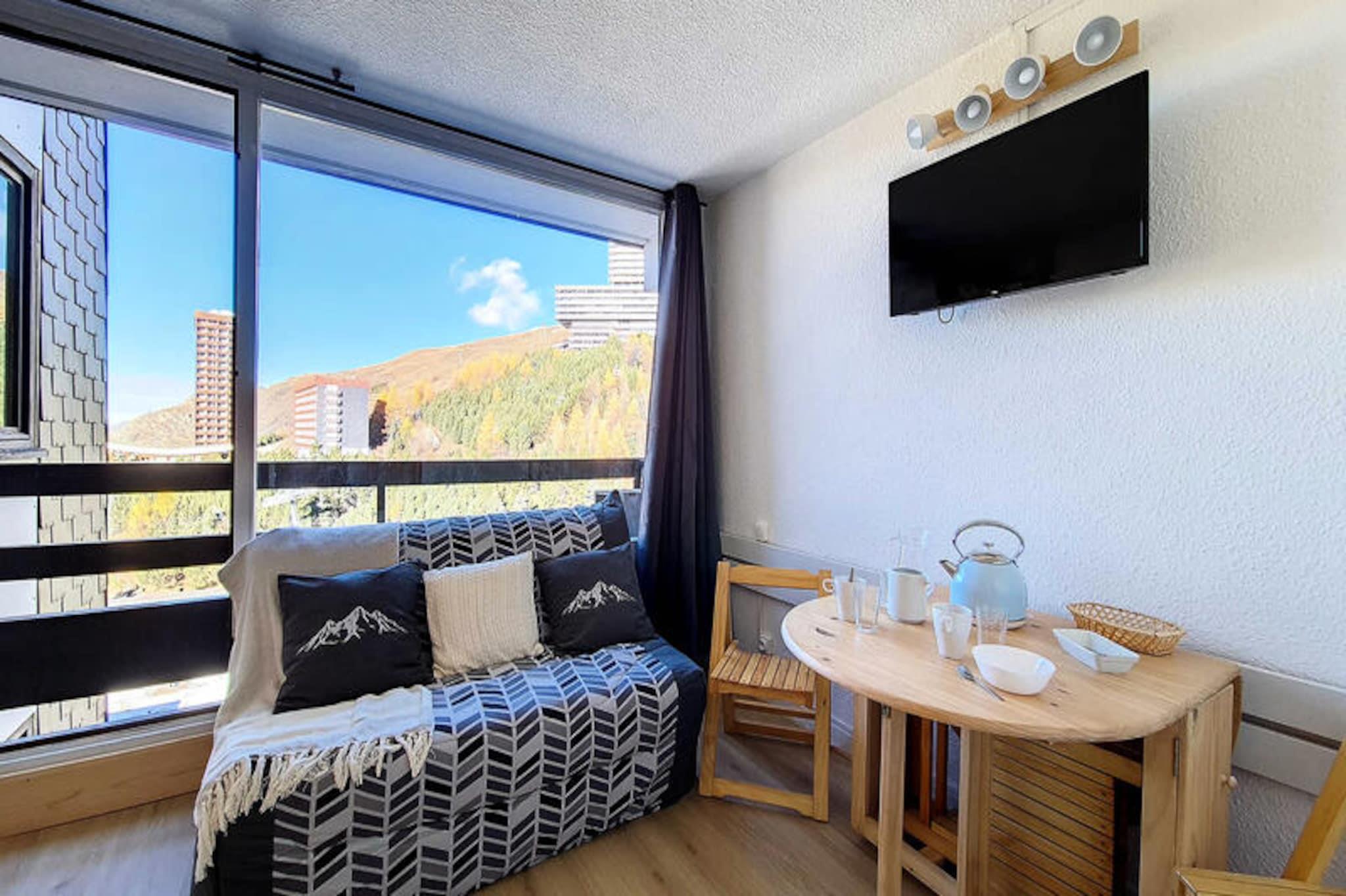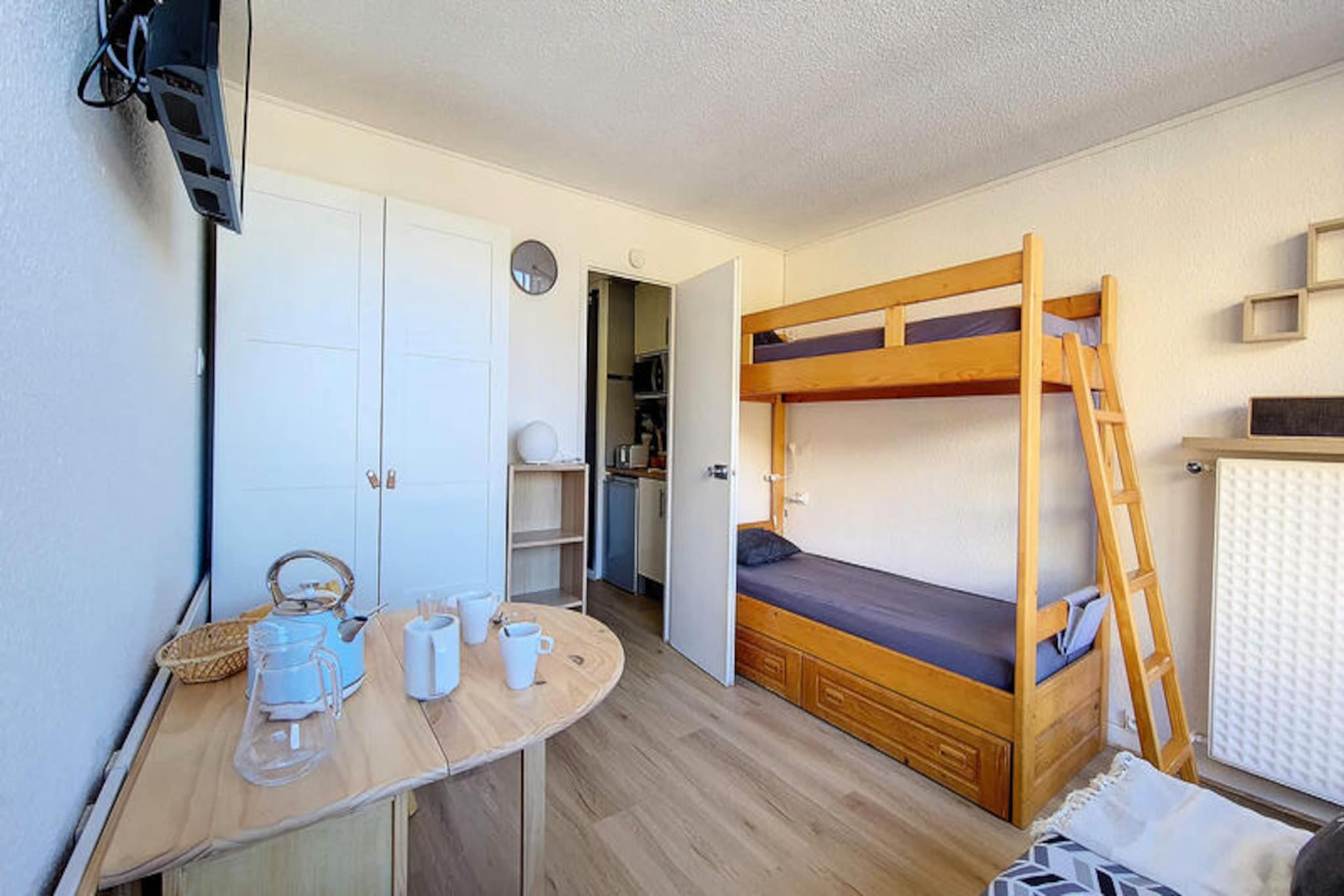 Högt ovanför det pittoreska distriktet La Croisette erbjuder denna charmiga studiolägenhet en mysig tillflyktsort för dem som söker en sömlös alpin semester. Belägen på 6:e våningen i Chavière-residenset, erbjuder fastigheten hisnande utsikt över de omgivande topparna och direkt tillgång till backarna, vilket gör det till en fristad för skidentusiaster. Med bekvämligheten av en hiss och en shoppinggalleria precis nedanför lovar din vistelse både komfort och praktiskhet. \n\nDenna vackert renoverade studio på 17 m² är omsorgsfullt utformad för att rymma upp till tre gäster. Vardagsrummet har en bekväm bäddsoffa för två personer och en enkelsäng, perfekt för par eller små familjer. Ett kompakt men fullt utrustat kök inkluderar en spishäll med 2 plattor, mikrovågsugn/grill, minidiskmaskin, vattenkokare och kaffebryggare, vilket gör att du enkelt kan laga mat. Badrummet är utrustat med badkar och toalett, medan den lilla balkongen i norrläge inbjuder dig att varva ner med en kopp kaffe och njuta av den friska bergsluften. Moderna bekvämligheter som TV och betalt Wi-Fi (i mån av tillgång) förbättrar din vistelse, medan linoleumgolv och mysiga filtar ger en touch av värme.\n\nStig ut, så befinner du dig i hjärtat av La Croisettes pulserande atmosfär. Backarna ligger bara några steg bort, och gratis utomhusparkering vid foten av byggnaden (i mån av tillgång) garanterar problemfri ankomst. Familjer kommer att uppskatta daghemmet som ligger bara 300 meter bort, medan den närliggande shoppinggallerian erbjuder en mängd olika restauranger och butiksalternativ att utforska efter en dag på berget.\n\nOavsett om du är här för spänningen med skidåkning eller en lugn reträtt i Alperna, kombinerar denna studio i Chavière-residenset bekvämlighet, komfort och charm för att skapa en oförglömlig semesterupplevelse.