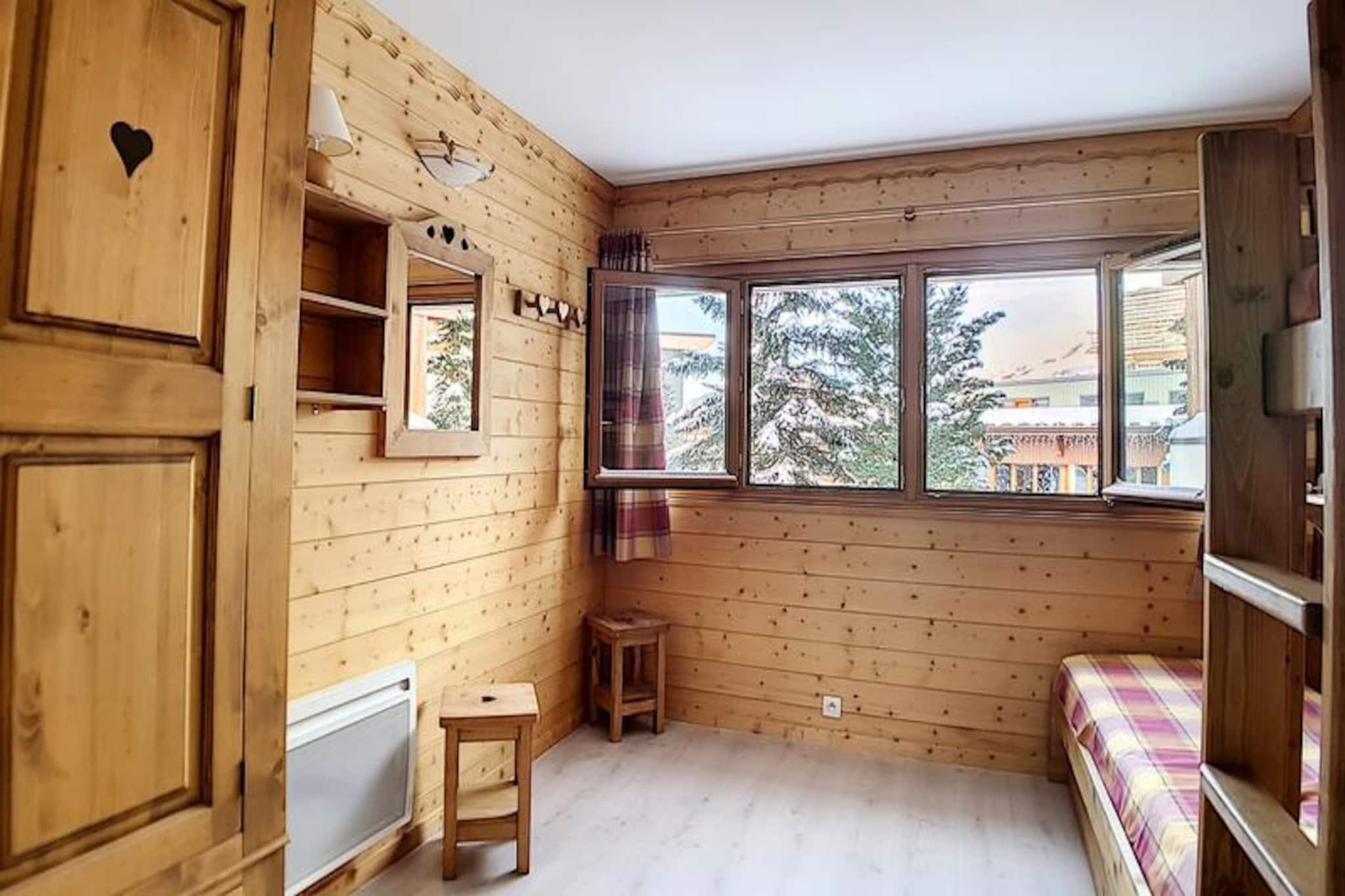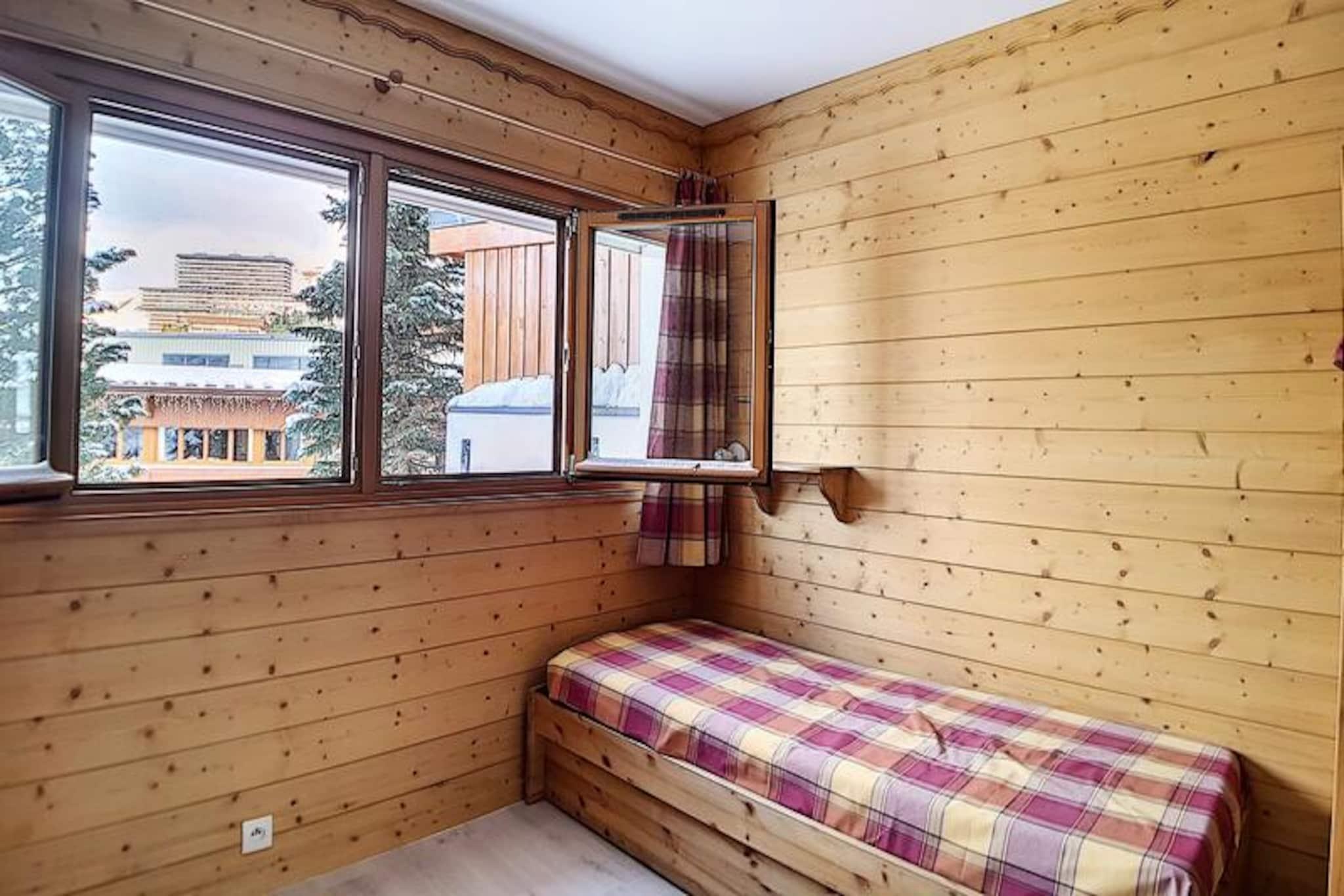 I hjärtat av den charmiga Alpages-byggnaden erbjuder denna mysiga lägenhet en härlig alpin tillflyktsort för familjer och små grupper som söker en lugn men bekväm vistelse i de franska Alperna. Bara några steg från den livliga shoppingarkaden La Croisette är residenset perfekt placerat för att ge enkel tillgång till lokala bekvämligheter samtidigt som det bibehåller en fridfull atmosfär. Den söderläge balkongen inbjuder dig att njuta av solskenet och den fridfulla utsikten över de omgivande topparna, vilket skapar en perfekt bakgrund för din bergssemester. \n\nInuti är lägenheten noggrant utformad för att rymma upp till fem gäster fördelade på två rum. Vardagsrummet har en bekväm bäddsoffa för två personer och en TV, vilket garanterar en avkopplande plats att varva ner efter en dag av äventyr. Sovrummet har en enkelsäng och två våningssängar, vilket gör det idealiskt för barnfamiljer. Köket är fullt utrustat med moderna apparater, inklusive kylskåp, miniugn, mikrovågsugn, diskmaskin och kaffebryggare, så att du kan laga rejäla måltider för dina alpina utforskningar. Badrummet har ett lugnande badkar, och den separata toaletten gör din vistelse bekvämare. \n\nLäget ligger bara 100 meter från backarna och är en dröm för skidentusiaster, med skidförvaring i källaren för extra bekvämlighet. Familjer kommer att uppskatta den närliggande förskolan och snöträdgården, perfekt för att hålla de små underhållna. Busshållplatsen ligger bara 50 meter bort, vilket ger enkel tillgång till busstationen och omgivande sevärdheter. Oavsett om du är här för att åka skidor, vandra eller bara koppla av, placerar denna lägenhet dig i hjärtat av allt. \n\nMed sin varma atmosfär, praktiska bekvämligheter och oslagbara läge lovar denna bostad en oförglömlig alpin flykt för alla årstider. Låt magin i de franska Alperna fängsla dig när du skapar värdefulla minnen i detta inbjudande hem hemifrån.