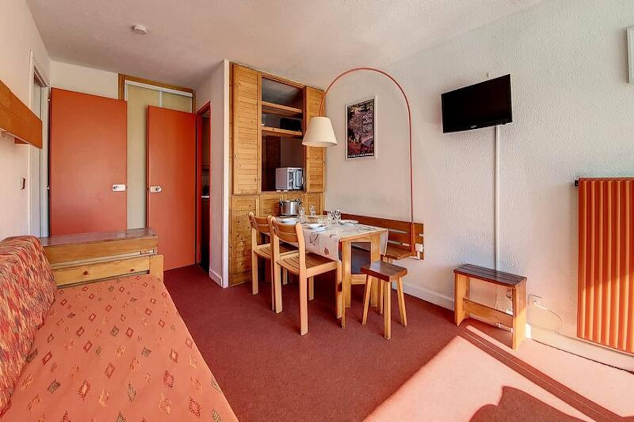 Högt ovanför det pittoreska distriktet La Croisette erbjuder denna charmiga alpina lägenhet en mysig tillflyktsort med direkt tillgång till backarna, vilket gör den till en drömdestination för skidentusiaster. Tänk dig att kliva ut genom dörren och glida rakt ut på den orörda snön, med den livliga shoppinggallerian bekvämt belägen precis nedanför byggnaden. Chavière-residenset kombinerar spänningen i bergsäventyr med moderna bekvämligheter, vilket garanterar en minnesvärd vistelse för alla. \n\nDenna 37 m² stora lägenhet ligger på 6:e våningen med hiss och rymmer bekvämt upp till fem gäster. Vardagsrummet har två bäddsoffor för enkla personer och en platt-TV, perfekt för att varva ner efter en dag i backarna. Sovrummet har två enkelsängar och en utdragbar säng, vilket ger flexibla sovarrangemang för familjer eller små grupper. Det separata köket är fullt utrustat med spishäll, ugn, kylskåp, diskmaskin och viktiga apparater som brödrost, vattenkokare och kaffebryggare, vilket gör matlagningen till en barnlek. Två balkonger i söderläge inbjuder dig att njuta av det alpina solskenet och den hisnande utsikten. \n\nUtöver lägenheten erbjuder distriktet La Croisette en livlig atmosfär med ett daghem bara 300 meter bort och gratis utomhusparkering finns vid foten av byggnaden. Oavsett om du är här för att åka skidor, utforska den charmiga byn eller bara koppla av i den friska bergsluften, placerar denna residens dig i hjärtat av allt. Med betalt Wi-Fi och filtar har varje detalj noggrant övervägts för att garantera din komfort. \n\nVälj Chavière-residenset för dess oslagbara läge, mysiga atmosfär och löftet om oförglömliga alpina minnen. Oavsett om du besöker för en vinterflykt eller en sommarretreat, är denna lägenhet din port till de franska Alpernas förtrollande skönhet.
