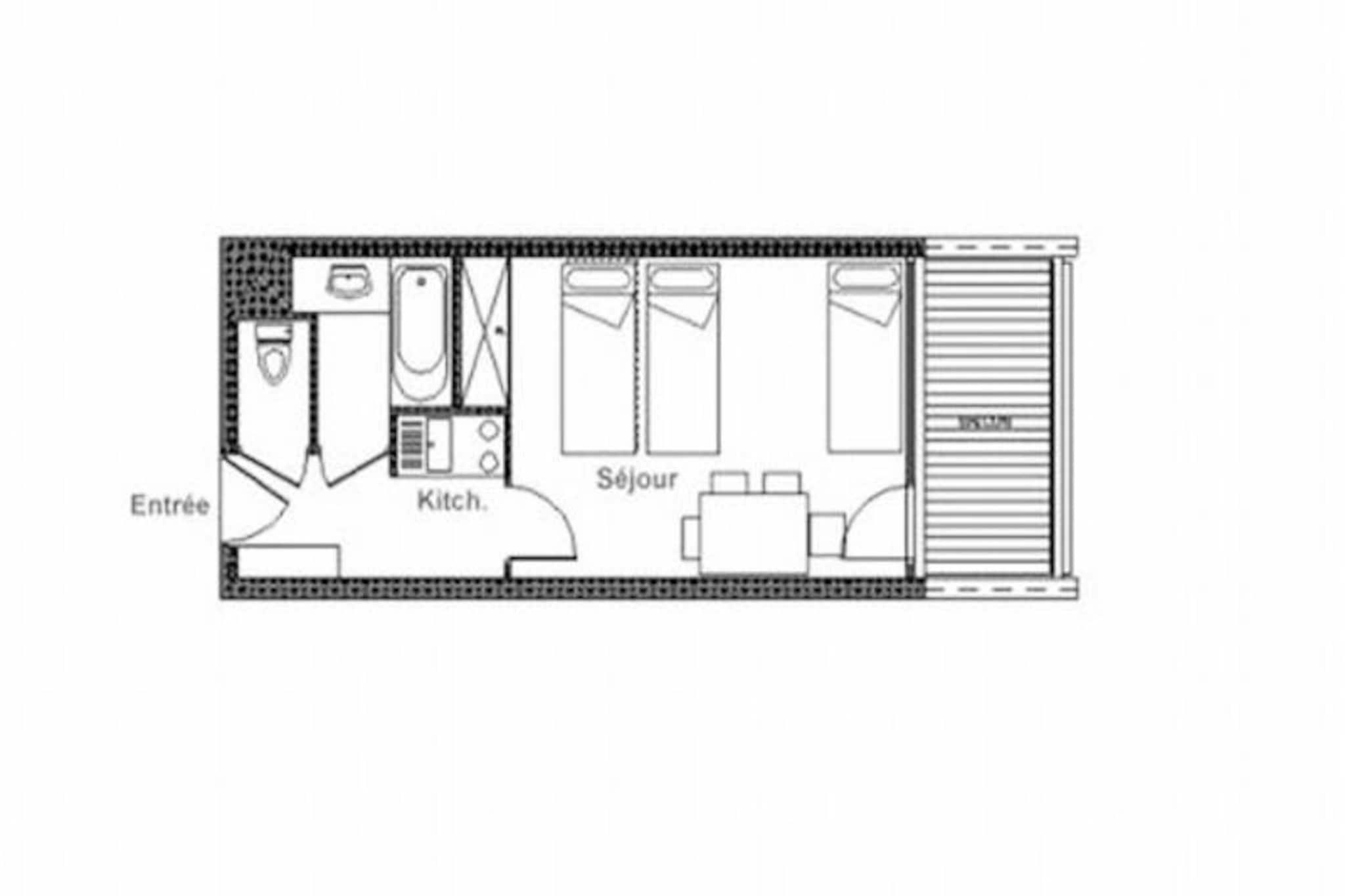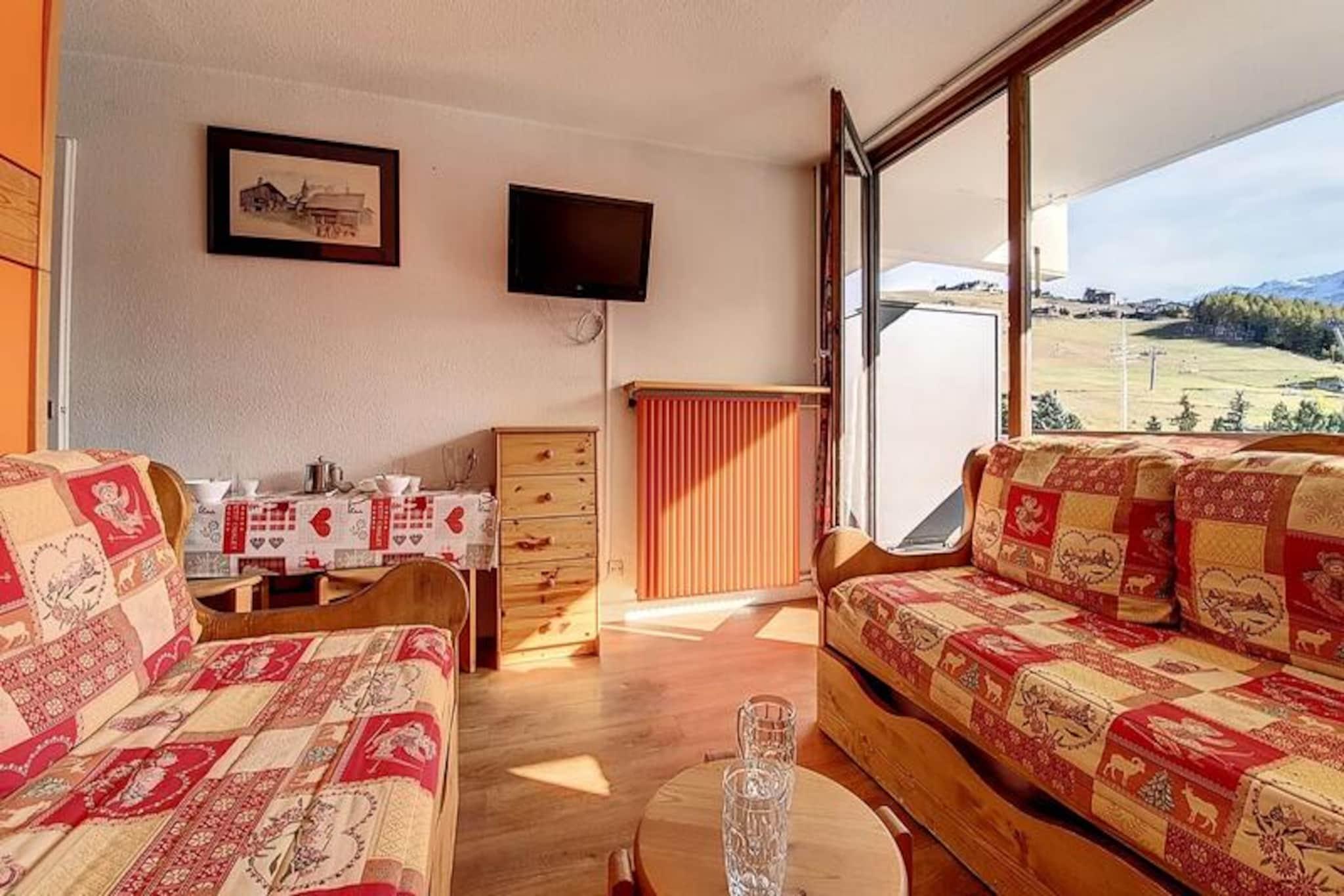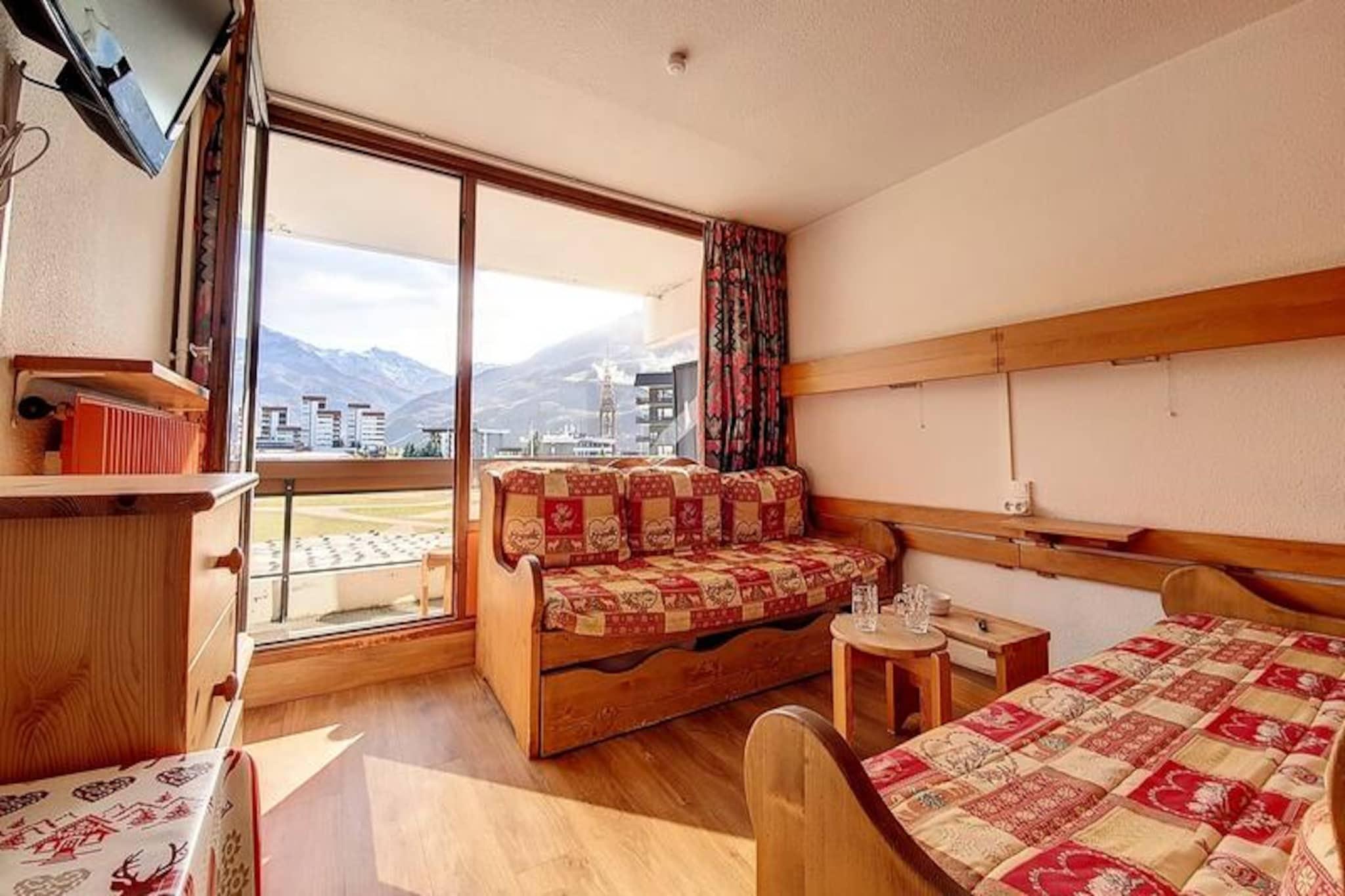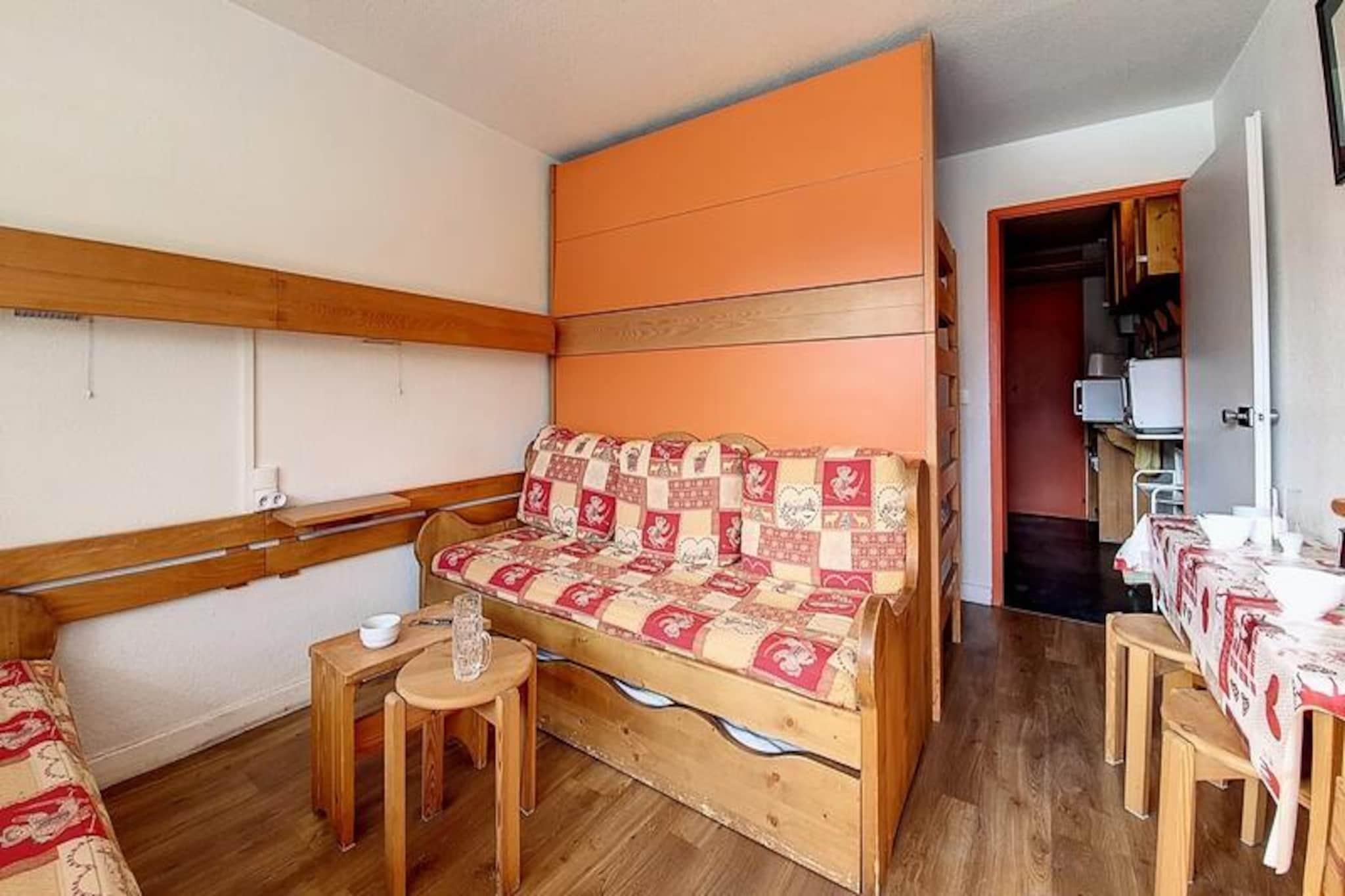 Högt ovanför det pittoreska distriktet La Croisette erbjuder denna mysiga studiolägenhet i Chavière-residenset en varm och välkomnande tillflyktsort för din alpina semester. Med direkt tillgång till backarna kan du kliva ut ur byggnaden och ut i snön, vilket gör den till ett perfekt val för skidentusiaster som vill maximera sin tid på berget. Balkongen i söderläge inbjuder dig att njuta av solskenet och beundra den fantastiska utsikten över de omgivande topparna, vilket skapar en lugn bakgrund för din semester. Denna kompakta men omsorgsfullt designade studio på 24 m² rymmer bekvämt upp till fyra gäster. Vardagsrummet har två våningssängar och två enkelsängar, vilket gör den idealisk för familjer eller små grupper. Det fullt utrustade köket inkluderar en spishäll med 2 brännare, kylskåp, kombinerad mikrovågsugn/ugn, minidiskmaskin, brödrost, vattenkokare och kaffebryggare, så att du kan laga rejäla måltider efter en dag i backarna. Lägenheten har också ett badrum med badkar, en separat toalett och moderna bekvämligheter som TV och Wi-Fi (beroende på nätverkstäckning). Observera att våningssängen inte är lämplig för barn under sex år. Bekvämlighet är nyckeln på Chavière, med en shoppinggalleria direkt tillgänglig från byggnadens källare och ett daghem bara 300 meter bort. Gratis utomhusparkering finns vid foten av byggnaden (i mån av tillgång), vilket garanterar en problemfri ankomst och avresa. Oavsett om du är här för spänningen med skidåkning eller lugnet i bergen, erbjuder denna charmiga studio den perfekta basen för dina äventyr i de franska Alperna.