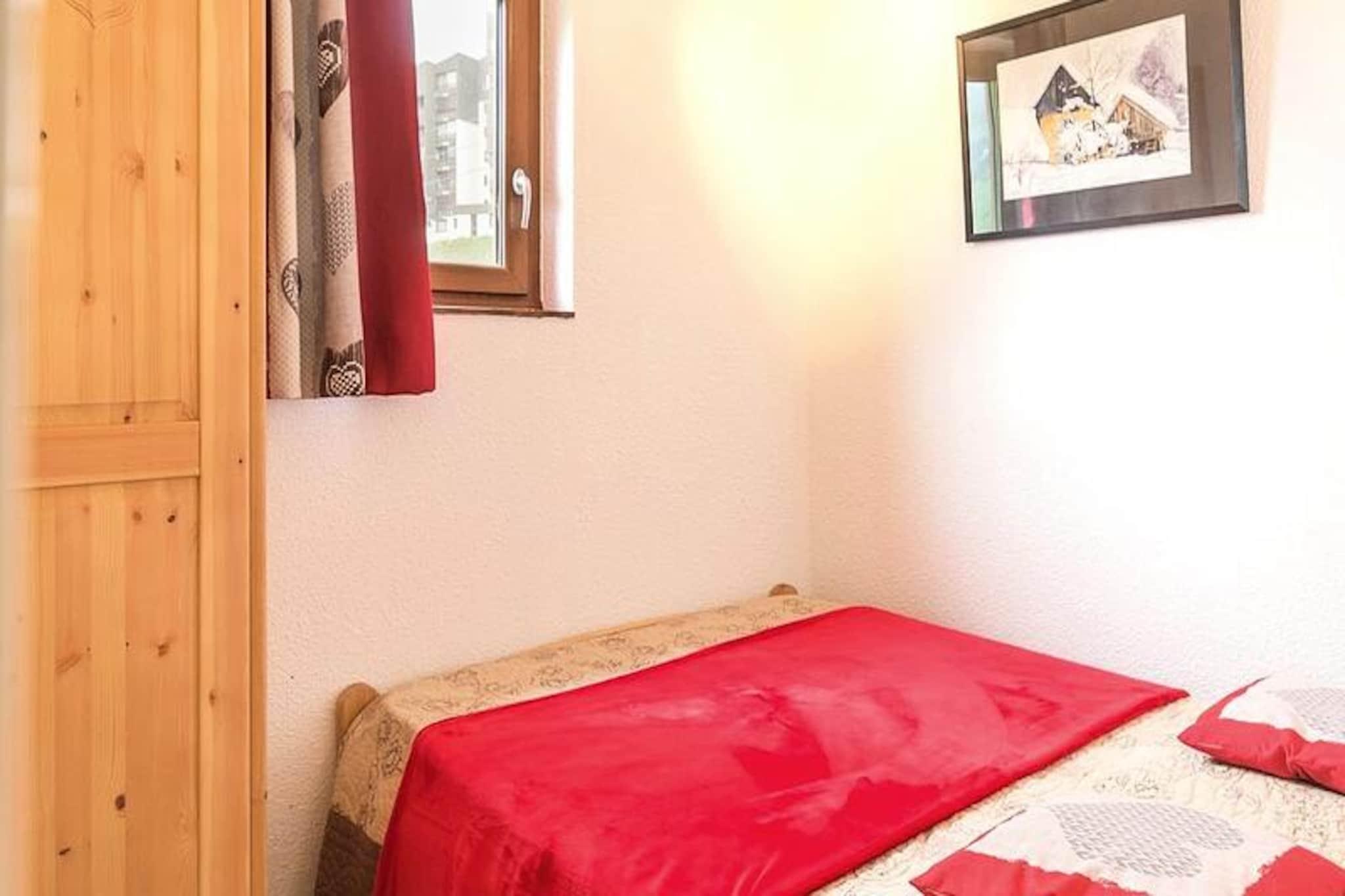 Högt ovanför den fantastiska Belleville-dalen erbjuder denna charmiga lägenhet i Bruyères-distriktet en mysig tillflyktsort för bergsälskare. Med sin balkong i norrläge kan du vakna upp till hisnande utsikt över snöklädda toppar och njuta av den fridfulla alpina atmosfären. Oavsett om du är här för vinterskidåkning eller sommarvandring, lovar denna plats oförglömliga stunder omgivna av naturens skönhet. Ski Soleil 1 och 2-bostäderna är sömlöst sammankopplade, vilket garanterar bekvämlighet och enkel tillgång till hjärtat av distriktet. Byggnad 1 öppnar sig direkt mot huvudtorget, där den pulserande energin av restauranger, butiker och lokala attraktioner väntar. \n\nInuti är lägenheten noggrant utformad för komfort och praktisk användning. Den är 30 m² stor och rymmer upp till sex gäster med en utdragbar bäddsoffa i vardagsrummet, en dubbelsäng i det första sovrummet och våningssängar i det andra. Köket med öppen planlösning är fullt utrustat med moderna apparater, inklusive keramikhäll, mikrovågsugn, miniugn, kylskåp, diskmaskin och nödvändigheter som kaffebryggare och vattenkokare. Laminatgolv, elvärme och trippelglasfönster säkerställer ett varmt och inbjudande utrymme, medan badrummet med badkar och separat toalett ökar komforten.\n\nStig ut och fördjupa dig i det livliga Bruyères-distriktet. Från en vattenpark och ett hälsocenter till en biograf, skidskola och rodelbana finns det något för alla. Familjer kommer att uppskatta lekplatsen, medan äventyrare kan utforska backarna bara några steg från boendet. På sommaren förvandlas området till en fristad för vandring, cykling och alpin utforskning.\n\nOavsett om du söker spännande skiddagar eller lugna kvällar med utsikt över bergen, är denna lägenhet din port till det bästa av de franska Alperna. Upplev charmen, komforten och bekvämligheten hos Ski Soleil under alla årstider.