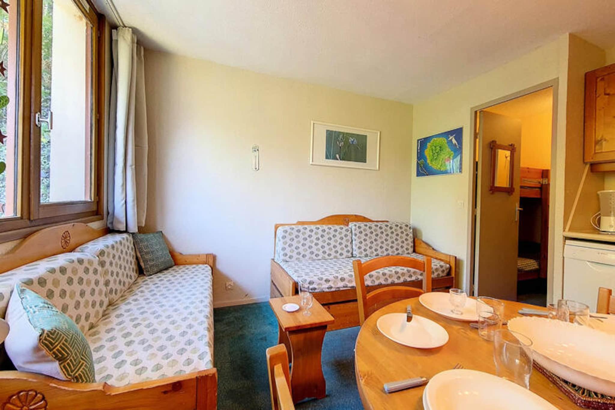 I hjärtat av det pittoreska Reberty 1850-distriktet erbjuder denna mysiga studiolägenhet en autentisk alpin tillflykt med bekvämligheten av ski-in/ski-out. Perfekt beläget för vintersportsentusiaster, placerar residenset dig precis vid backarna, vilket säkerställer att dina dagar börjar och slutar med spänningen i bergen. De charmiga omgivningarna och den friska bergsluften skapar en lugn atmosfär, perfekt för en föryngrande semester. Denna kompakta men välutrustade studio på 22 m² rymmer bekvämt upp till fyra gäster. Vardagsrummet har en bäddsoffa för en enkel och en utdragbar säng, medan en separat sovalkov erbjuder två våningssängar, vilket gör den till ett praktiskt val för familjer eller små grupper. Köket är omsorgsfullt utformat med moderna bekvämligheter, inklusive elektriska spishällar, miniugn, mikrovågsugn, kylskåp, diskmaskin, kaffebryggare och brödrost, så att du kan laga rejäla måltider efter en dag i backen. Lägenheten har också ett badrum med badkar, en separat toalett och en TV för din underhållning. Observera att den övre våningssängen inte är lämplig för barn under sex år. Denna lägenhet ligger på andra våningen i Boedette A-residenset och erbjuder enkel tillgång till närliggande små butiker och restauranger. Gratisbussar tar dig till det livliga Croisette-centret, medan Bruyères-distriktet ligger bara en kort promenad bort via en offentlig hiss och gångbro. För extra bekvämlighet är residenset utrustat med en säker hiss som är tillgänglig via nyckelkort. Oavsett om du är här för att ta dig fram genom färskt puder eller bara njuta av de franska Alpernas skönhet, erbjuder denna lägenhet en bekväm och praktisk bas för dina bergsäventyr. Upplev magin från Reberty 1850 och skapa minnen som varar livet ut.