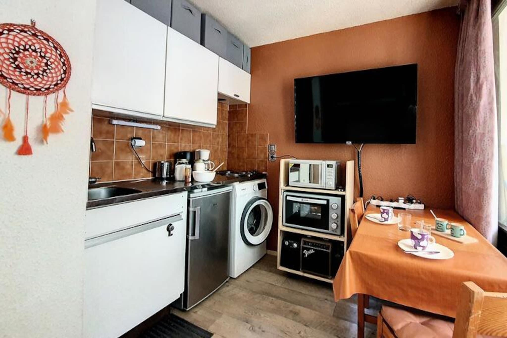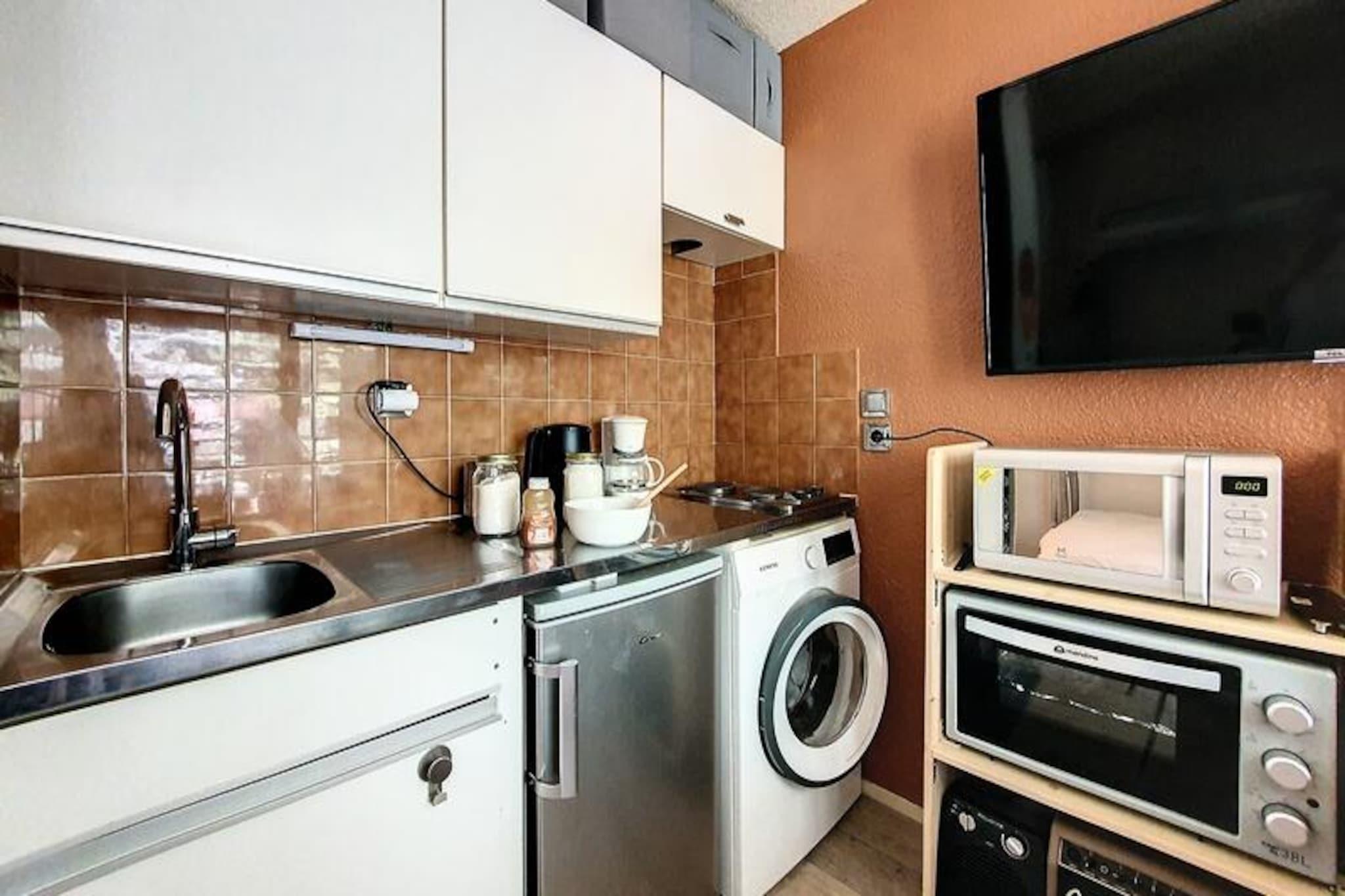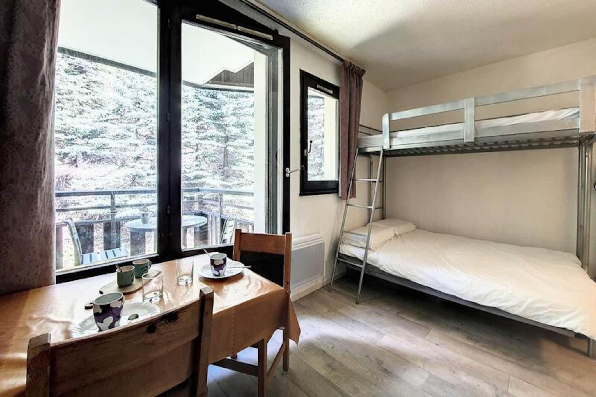 I hjärtat av de pittoreska franska Alperna erbjuder denna charmiga studiolägenhet en inbjudande tillflyktsort för par eller ensamresenärer som söker en mysig alpin semester. Belägen i Gentianes-residenset på Place des Bouquetins, bara 20 meter från backarna, vilket gör det till en drömdestination för skidentusiaster. Vakna upp till den friska bergsluften och njut av ditt morgonkaffe på den österläge balkongen, medan du njuter av den fridfulla utsikten över de omgivande topparna. Residenset kombinerar modern bekvämlighet med alpin charm, vilket garanterar en bekväm och minnesvärd vistelse. \n\nStudiolägenheten på 17 m² är omsorgsfullt utformad för att maximera utrymme och komfort. Den har ett mysigt vardagsrum med en dubbelsäng och en våningssäng, perfekt för en vilsam natt efter en dag av äventyr. Det fullt utrustade köket inkluderar en spishäll med 2 plattor, kylskåp, mikrovågsugn, ugn, kaffebryggare, vattenkokare och till och med en tvättmaskin, vilket gör det enkelt att laga mat och känna sig som hemma. Badrummet är utrustat med badkar och toalett, och lägenheten är utrustad med gratis Wi-Fi (beroende på nätverkstäckning), en TV och laminatgolv för extra komfort. Denna rökfria och husdjursfria anläggning garanterar en ren och välkomnande miljö för alla gäster.\n\nBortom residenset ger en gångbro enkel tillgång till det livliga distriktet Bruyères, där du hittar en mängd olika restauranger, butiker, en vattenpark och ett hälsocenter, en biograf, en rodelbana, en skidskola och en lekplats. För dig som gillar att utforska ligger Croisette-distriktet bara 15 minuters promenad bort via en naturskön gångstig. Oavsett om du är här för att åka skidor, koppla av i hälsocentret eller utforska den charmiga alpina omgivningen, erbjuder denna studiolägenhet den perfekta basen för din bergsresa. Med sitt oslagbara läge och genomtänkta bekvämligheter är det ett idealiskt val för en minnesvärd semester i de franska Alperna.