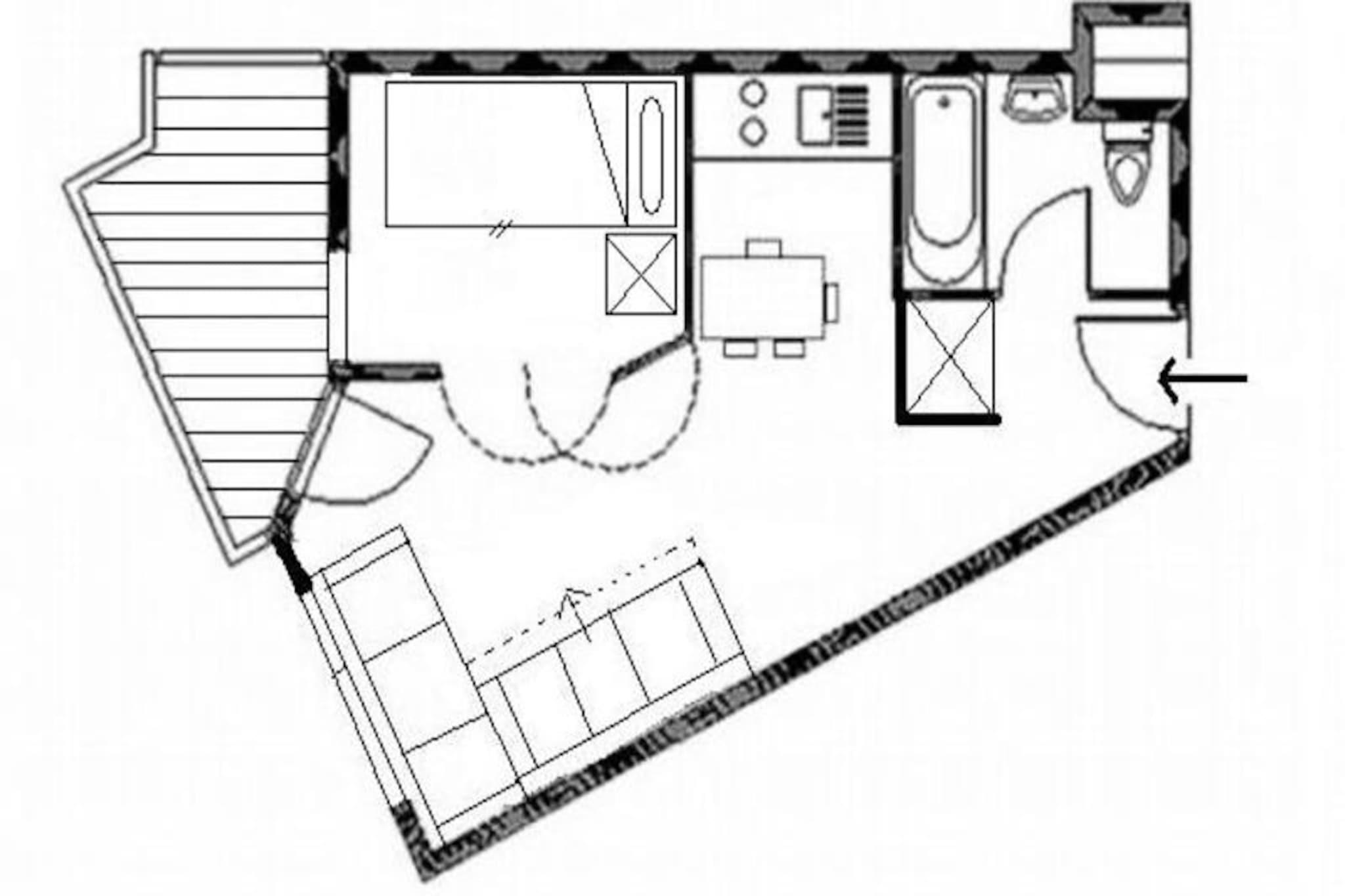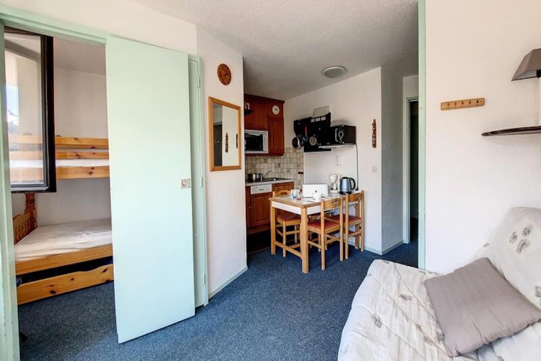 I det charmiga Reberty 1850-distriktet erbjuder denna mysiga lägenhet en härlig alpin tillflyktsort för dig som söker både komfort och bekvämlighet. Tänk dig att kliva ut på din sydvästvända balkong på andra våningen och njuta av den friska bergsluften och den fridfulla utsikten som omger dig. Oavsett om du planerar ett vinterskidaventyr eller en sommarsemester, erbjuder denna bostad den perfekta basen för din semester i de franska Alperna. \n\nInuti är lägenheten omsorgsfullt utformad för att rymma upp till fyra gäster på sina 26 kvadratmeter. Vardagsrummet har en bekväm bäddsoffa för två personer och en TV, vilket skapar ett välkomnande utrymme att koppla av efter en dags utforskande. Det separata sovrummet har två våningssängar, perfekt för familjer eller små grupper. Köket har nyligen renoverats och är fullt utrustat med moderna apparater, inklusive spishäll, mikrovågsugn, ugn, kylskåp, diskmaskin, brödrost, vattenkokare och kaffebryggare – allt du behöver för att laga rejäla måltider under din vistelse. Badrummet är utrustat med badkar och toalett, vilket garanterar bekvämlighet och avskildhet. \n\nLägenheten ligger bara 250 meter från backarna och är perfekt placerad för skidentusiaster. Gratis parkering finns vid foten av byggnaden, och i närheten hittar du butiker och en skidskola, vilket gör det enkelt att få tillgång till allt du behöver för en smidig semesterupplevelse. \n\nOavsett om du dras till spänningen med skidåkning, lugnet i alpina landskap eller charmen i Reberty 1850-distriktet, inbjuder denna lägenhet dig att skapa bestående minnen i en av Frankrikes mest pittoreska bergsmiljöer.