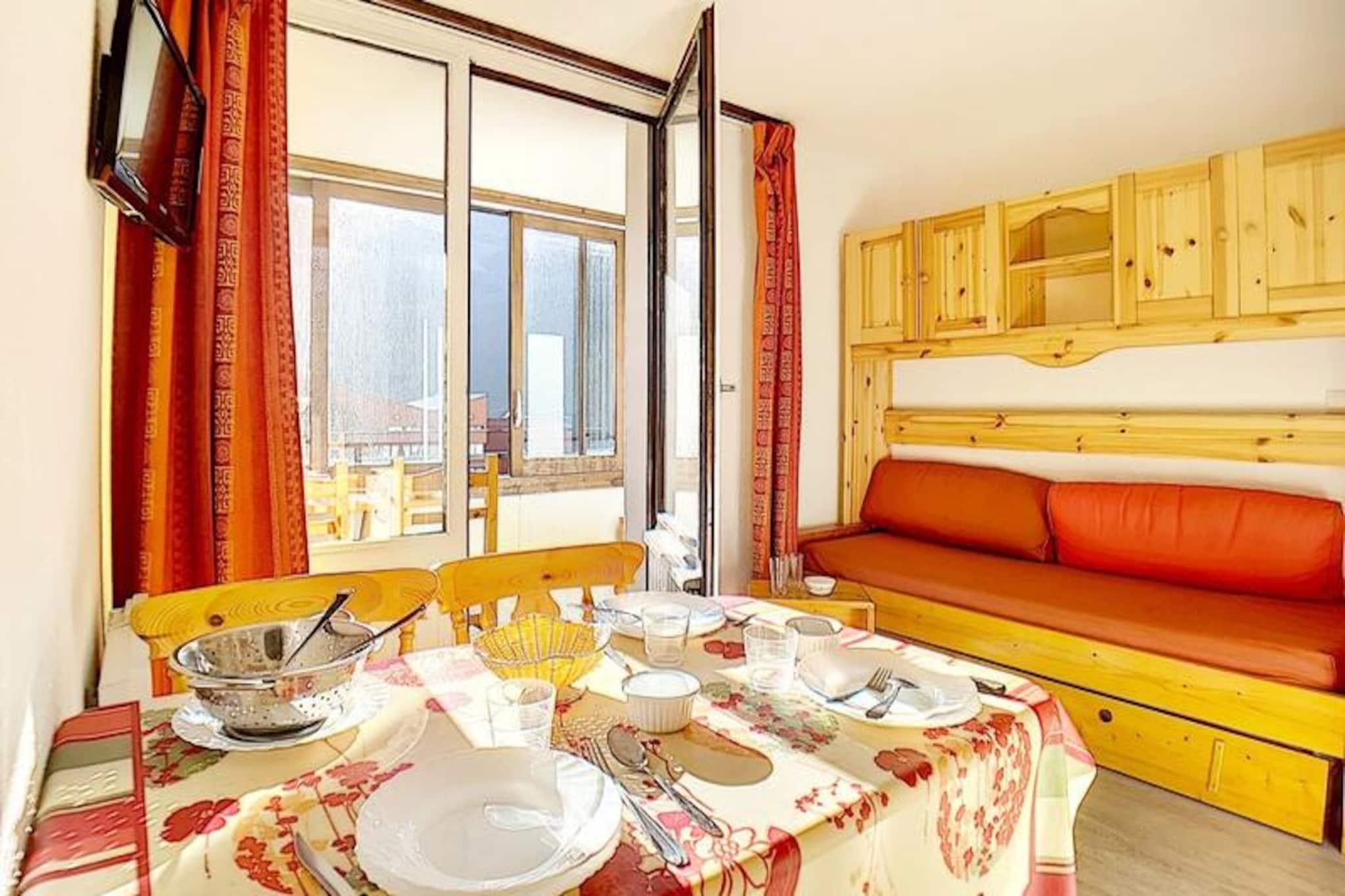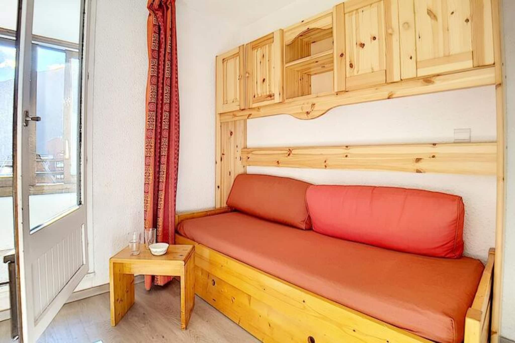 I hjärtat av Les Menuires, där de majestätiska Alperna skapar en hisnande bakgrund, erbjuder denna charmiga studiolägenhet en mysig tillflyktsort för dig som söker äventyr och avkoppling. Belägen i Sorbier-residensen på Place des Bouquetins, garanterar dess ski-in/ski-out-åtkomst att din alpina upplevelse börjar i samma ögonblick som du kliver ut. Oavsett om du är här för att karva dig genom orörda backar eller utforska den livliga atmosfären i Bruyères-distriktet, placerar denna fastighet dig i centrum av allt. Den slutna balkongen i sydvästläge inbjuder dig att njuta av eftermiddagssolen medan du njuter av utsikten över de omgivande topparna. \n\nLägenheten är designad för upp till fyra gäster och har en genomtänkt planlösning med ett vardagsrum utrustat med en bäddsoffa för en person och en utdragbar enkelsäng, samt en mysig stuga med två våningssängar för en person. Köket är fullt utrustat med moderna apparater, inklusive mikrovågsugn, diskmaskin, kaffebryggare och brödrost, vilket gör det enkelt att laga mat efter en dag av äventyr. Badrummet har ett badkar för avkopplande dopp, medan laminatgolv i hela huset ger en touch av värme och komfort. Gratis Wi-Fi säkerställer att du håller dig uppkopplad, och residensens hiss ger enkel åtkomst. Observera att husdjur inte är tillåtna och att den övre våningssängen inte är lämplig för barn under sex år. \n\nBara några steg bort ansluter gångbron dig till det livliga Bruyères-distriktet, där du hittar en mängd olika restauranger, butiker, en biograf, en vattenpark och ett hälsocenter. Familjer kommer att uppskatta den närliggande skidskolan, kälkbacken och lekplatsen, medan äventyrare kan utforska de omfattande backarna och lederna i Les Trois Vallées. Med sitt utmärkta läge och välkomnande atmosfär är denna lägenhet den perfekta basen för att skapa oförglömliga alpina minnen.
