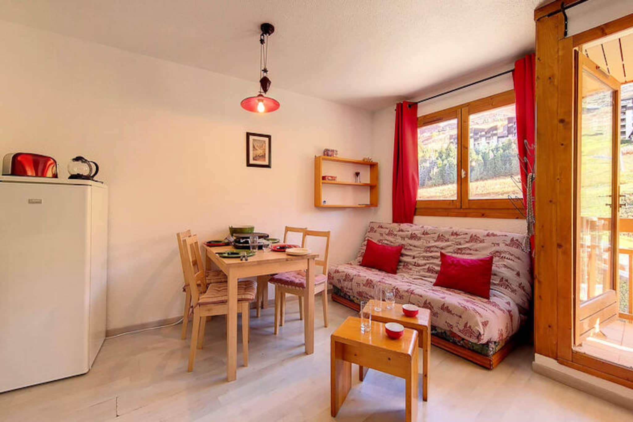 Högt ovanför det charmiga Bruyères-distriktet erbjuder denna mysiga alpina oas en plats på första parkett till de snötäckta underverken i Les Menuires. Tänk dig att vakna upp till den friska bergsluften och kliva direkt ut i backarna, tack vare dess oslagbara ski-in/ski-out-läge. Carlines II-residenset placerar dig i hjärtat av en pulserande byatmosfär, där magin i de franska Alperna vaknar till liv. Från din balkong på 5:e våningen i österläge kan du njuta av morgonljuset när det dansar över de snötäckta topparna och sätter den perfekta tonen för en dag av äventyr. Denna omsorgsfullt designade tvårumslägenhet på 30 m² rymmer bekvämt upp till fem gäster. Vardagsrummet är en mysig oas att varva ner, komplett med en TV för lugna kvällar. Sovrummet har en dubbelsäng och en våningssäng för en person, medan en extra alkov vid ingången erbjuder ytterligare två våningssängar, vilket gör den idealisk för familjer eller små grupper. Det fullt utrustade köket har en spishäll med 3 brännare, kylskåp, kombinerad ugn/mikrovågsugn, diskmaskin och allt du behöver för att laga rejäla alpina måltider. Ett badrum med badkar och en separat toalett bidrar till bekvämligheten och garanterar en bekväm vistelse. Observera att detta är en rökfri, husdjursfri lägenhet utrustad med täcken för extra värme. Kliv ut och du kommer att befinna dig mitt i det livliga Bruyères-distriktet, hem till en mängd olika restauranger, butiker och nöjesalternativ. Oavsett om det är ett avkopplande besök på hälsocentret, en spännande åktur nerför kälkbacken eller en familjeutflykt till lekplatsen, finns det något för alla. Den närliggande skidskolan och vattenparken gör det till ett perfekt resmål för både nybörjare och erfarna äventyrare. Efter en dag i backarna kan du njuta av en film på bio eller njuta av lokal savoyardsk mat på en av de närliggande restaurangerna. Med sitt utmärkta läge, moderna bekvämligheter och lockelsen i skidområdet Les Trois Vallées precis utanför dörren, är denna lägenhet din port till en oförglömlig alpin flykt. Oavsett om du är här för spänningen med skidåkning eller charmen i bergsbylivet, lovar Carlines II en vistelse fylld av komfort, bekvämlighet och hisnande utsikt.