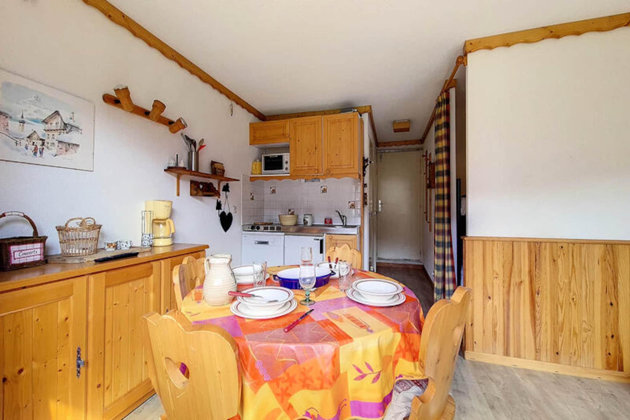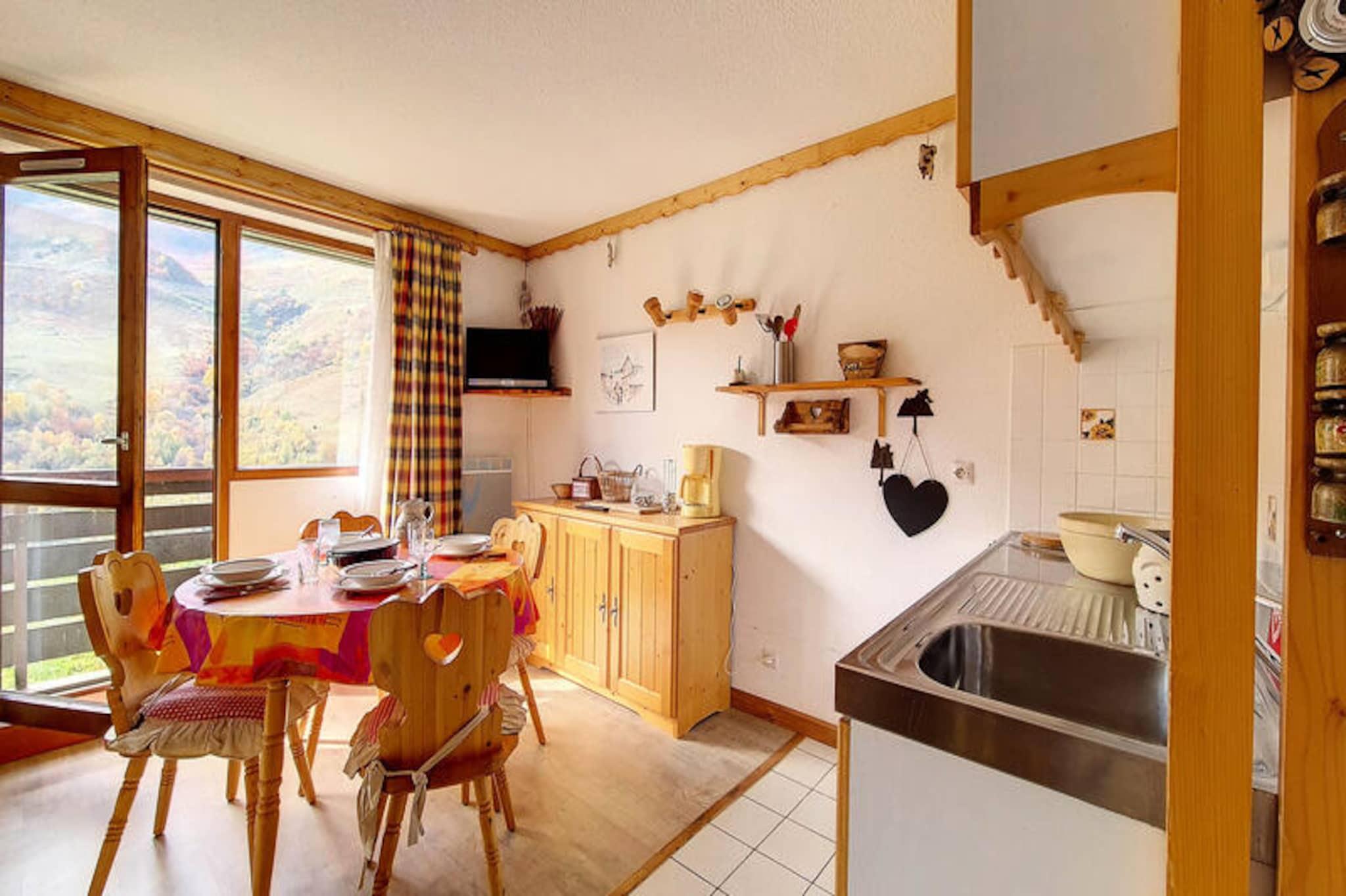 Där Les Menuires orörda sluttningar möter charmen av ett alpint liv, erbjuder denna mysiga studiolägenhet en perfekt tillflyktsort för både skidentusiaster och naturälskare. Beläget i Sarvan-residenset i Preyerand-distriktet, har fastigheten direkt ski-in/ski-out-åtkomst från sin västvända balkong, vilket gör att du kan kliva rakt ut i snön och omfamna bergens magi. Med den kostnadsfria Preyerand-linbanan som går dagligen fram till sent på kvällen är det enkelt att nå det centrala La Croisette-området, vilket säkerställer att du alltid är ansluten till händelsernas centrum. \n\nInuti är den 25 m² stora studion omsorgsfullt utformad för att rymma upp till fyra gäster. Vardagsrummet har en bekväm bäddsoffa för två, medan en separat sovalkov med våningssängar erbjuder extra avskildhet. Lägenheten är utrustad med moderna bekvämligheter, inklusive en TV, ett fullt utrustat kök med miniugn, diskmaskin, kaffebryggare och brödrost, samt ett badrum med badkar och separat toalett. Skidförvaringsskåp med kodad åtkomst ger bekvämlighet, och lägenheten är rökfri för en fräsch och välkomnande miljö. Bortom backarna erbjuder Les Menuires en livlig blandning av afterski-aktiviteter, matställen och lokala butiker, allt inom gångavstånd. Oavsett om du utforskar det vidsträckta skidområdet Les Trois Vallées eller njuter av en lugn kväll på din balkong, lovar den hisnande alpina utsikten och den friska bergsluften en oförglömlig vistelse. Välj denna charmiga studio för dess oslagbara läge, mysiga atmosfär och smidiga tillgång till en av världens mest kända skiddestinationer. Perfekt för par eller små familjer som söker en blandning av äventyr och avkoppling i de franska Alperna.