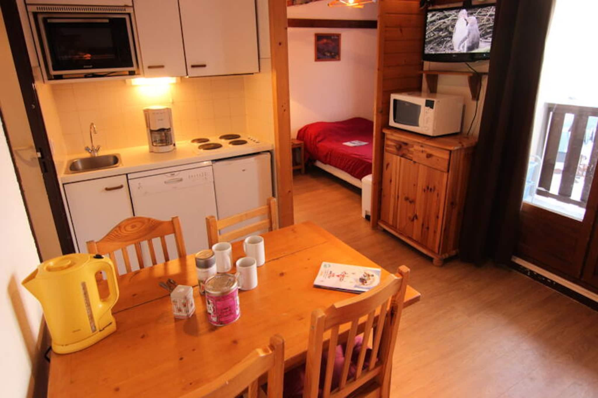 Belägen vid ingången till den berömda skidorten Val Thorens i det lugna distriktet Arolles, erbjuder denna charmiga stuglägenhet med två rum en mysig tillflyktsort för upp till fyra gäster. Med sin balkong i sydvästläge kan du njuta av soliga eftermiddagar och hisnande alpina vyer, perfekt för att varva ner efter en dag av äventyr. De fridfulla omgivningarna ger en fridfull tillflyktsort samtidigt som du är nära all action i denna världsberömda skiddestination. \n\nLägenheten har en noggrant utformad planlösning, inklusive ett bekvämt vardagsrum med soffa och TV, ett fullt utrustat pentry med moderna apparater som ugn, mikrovågsugn, spishäll, kylskåp, diskmaskin och köksfläkt. Sovrummet har en mysig dubbelsäng, medan stugområdet erbjuder mysiga våningssängar, vilket gör det idealiskt för familjer eller små grupper. Ett badrum med badkar och handfat, tillsammans med en separat toalett, garanterar bekvämlighet och avskildhet under din vistelse. \n\nBara 200 meter bort hittar du köpcentret Caron, som erbjuder en mängd olika lokala butiker, och Val Thorens sportcenter, komplett med pool och hälsoavdelning. För skidentuella ligger även uthyrningsbutiken SKISET/GOITSCHEL SPORT GS4 inom en kort promenad, och boendet erbjuder direkt tillgång till backarna, vilket gör att du enkelt kan ge dig ut i pisterna. \n\nOavsett om du är här för att snubbla genom den orörda snön, koppla av i wellnesscentret eller bara njuta av det fantastiska bergslandskapet, är den här lägenheten din port till en oförglömlig alpin semester. Upplev den perfekta balansen mellan komfort, bekvämlighet och äventyr i hjärtat av de franska Alperna.