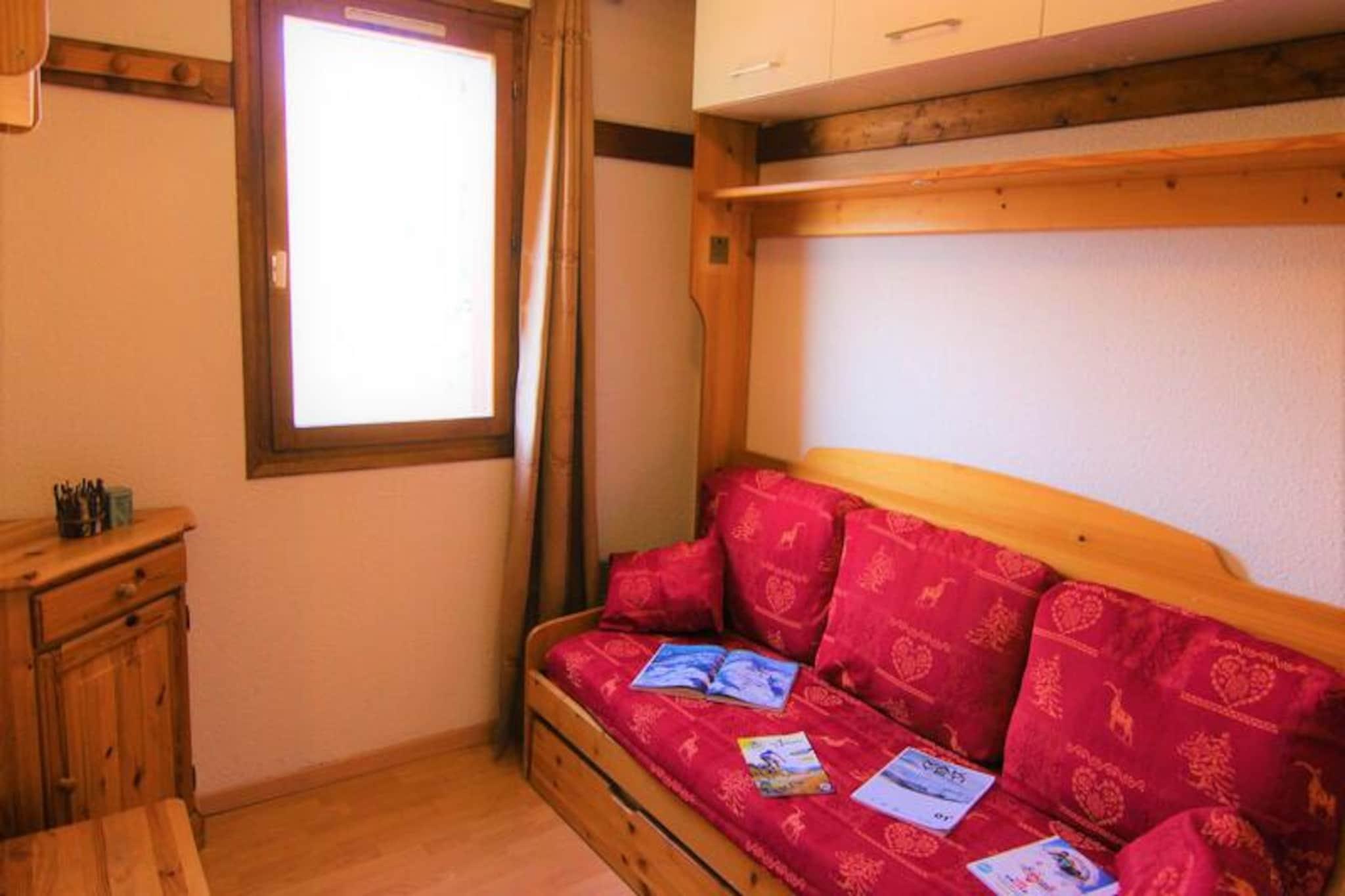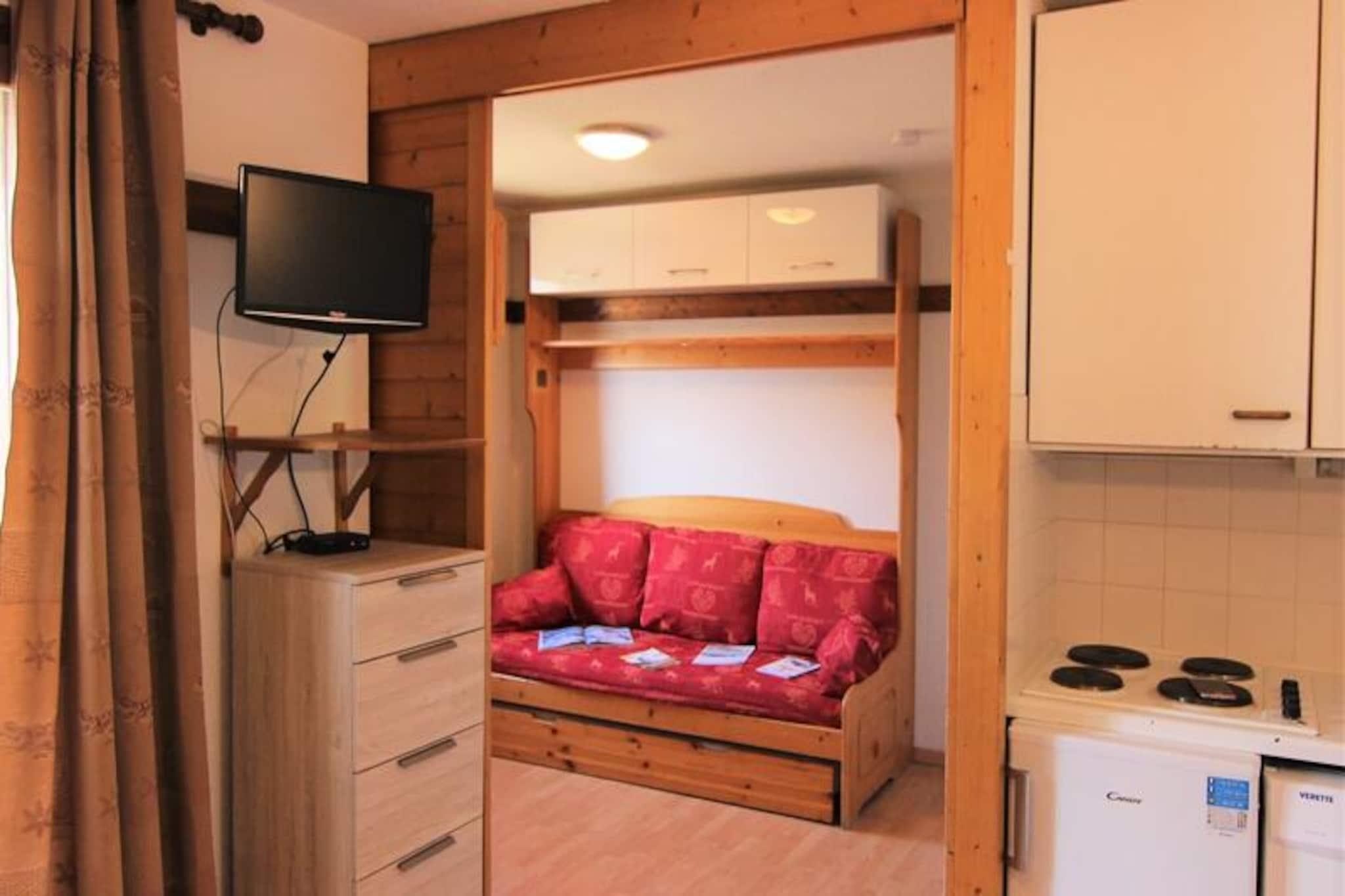 Vid porten till den världsberömda skidorten Val Thorens erbjuder denna charmiga studiostuga en mysig alpin tillflyktsort med direkt tillgång till backarna. Beläget i det lugna Arolles-distriktet är La Reine Blanche en favorit bland familjer tack vare sitt lugna läge och exceptionella söderläge som badar fastigheten i solljus hela dagen. Oavsett om du är här för spännande skidäventyr eller en lugn bergsflykt, är denna oas på bottenvåningen din perfekta bas. \n\nStudioen på 26 m² rymmer bekvämt upp till fyra gäster, med en väl utformad planlösning som inkluderar ett vardagsrum med en utdragbar bäddsoffa, ett separat sovrum med ytterligare en utdragbar bäddsoffa och en balkong i söderläge som inbjuder dig att njuta av den fantastiska alpina utsikten. Pentryt är fullt utrustat med keramikhäll, ugn, kylskåp, diskmaskin och köksfläkt, vilket gör det enkelt att laga rejäla måltider efter en dag i backarna. Ett modernt badrum med badkar och separat toalett garanterar bekvämlighet och komfort under din vistelse.\n\nBara 200 meter bort hittar du köpcentret Caron, som erbjuder en mängd olika lokala butiker, och sportcentret Val Thorens, komplett med pool och wellnessavdelning. För skidentusiaster ligger uthyrningsbutiken SKISET/GOITSCHEL SPORT GS4 bekvämt belägen i närheten, vilket säkerställer att du alltid är redo för backarna. Förutom sitt utmärkta läge erbjuder residenset enkel tillgång till det pulserande hjärtat av orten, där afterski-aktiviteter, restauranger och underhållning väntar.\n\nOavsett om du söker en actionfylld skidsemester eller en avkopplande alpin semester, kombinerar La Reine Blanche komfort, bekvämlighet och hisnande omgivningar för att skapa oförglömliga minnen i de franska Alperna.