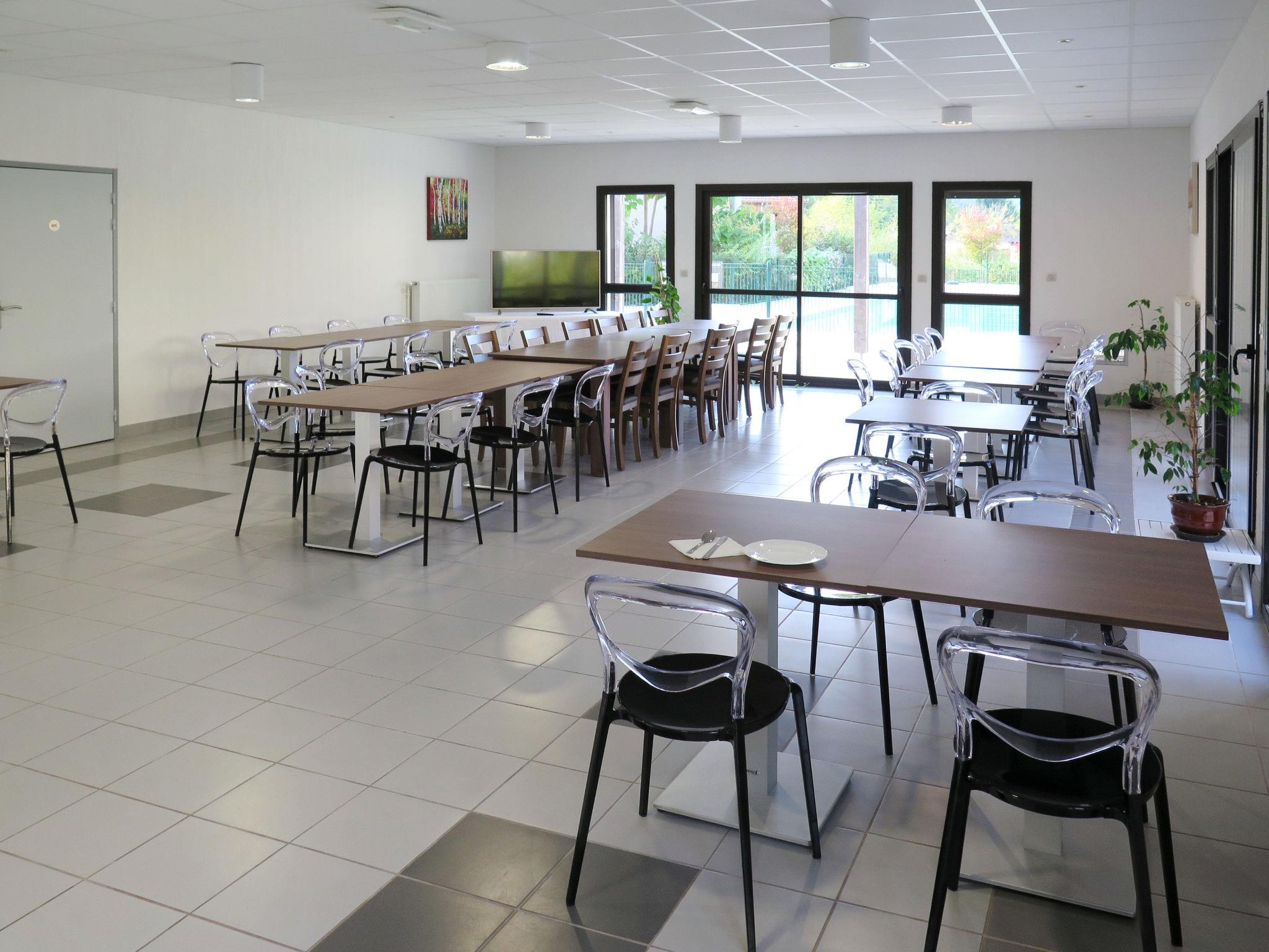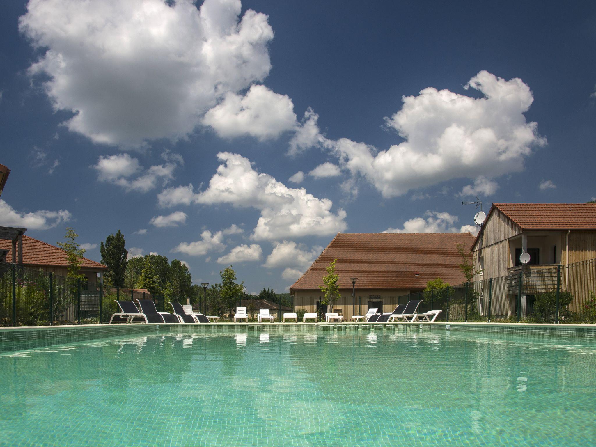 Resort "Les Clos du Rocher", 3 storeys. 8 houses in the resort. 116 apartments in the residence. 300 m from the centre of Les Eyzies de Tayac, 45 km from the centre of Périgueux, 22 km from the centre of Sarlat-la-Canéda. For shared use: property (fenced) with plants and trees, swimming pool heated, fenced (15 x 7 m, depth 80 - 150 cm, seasonal availability: 15.May. - 30.Sep.). Children's pool, outdoor shower, boccia. In the complex: reception, fitness room, washing machine, tumble dryer (for shared use, extra). Bread roll service. Parking (limited number of spaces) on the premises, public parking on the road. Shop, supermarket 300 m. Nearby attractions: Grotte de Lascaux 25 km. Please note: the photograph shows a typical example. The holiday properties may differ in living space, floorplan, equipment and furnishing.