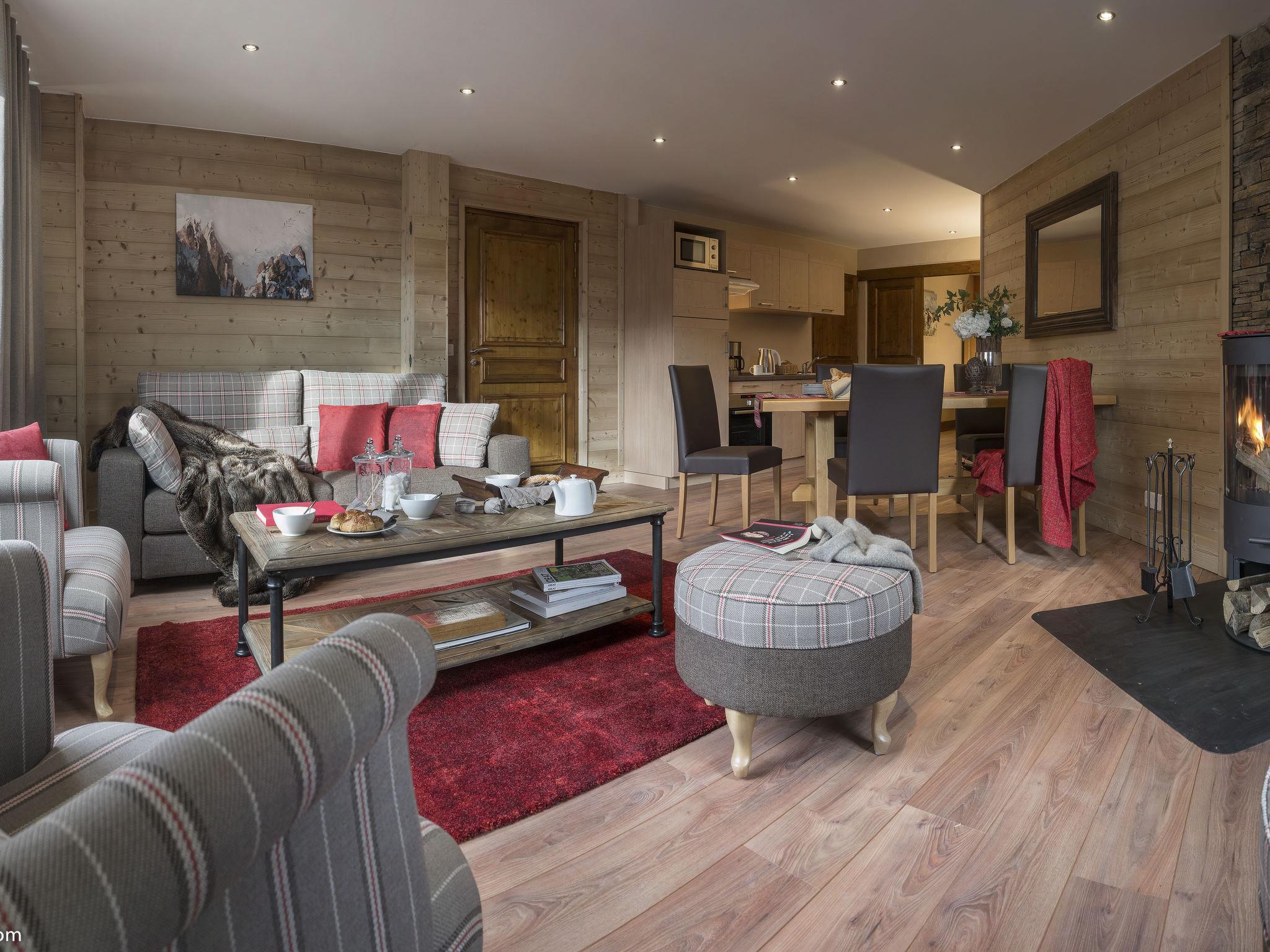 "Le Hameau de la Sapinière", 3-room apartment 72 m2. Tasteful and cosy furnishings: living/dining room with open-hearth fireplace, dining table and TV. Exit to the balcony. 1 room with 1 french bed (160 cm). 1 room with 2 beds. Alcove with 1 x 2 bunk beds. Kitchenette (oven, dishwasher, 3 ceramic glass hob hotplates, toaster, kettle, microwave, electric coffee machine). 2 baths or showers/WC. Heating. Balcony, south facing position. Beautiful view of the mountains. Facilities: safe, hair dryer. Internet (WiFi, free). Please note: non-smokers only. Maximum 1 pet/ dog allowed. The property is one of a type of property or apartment. Instead of an enclosed bedroom, some sleeping areas are located in an open-plan area (gallery, alcove, etc.).