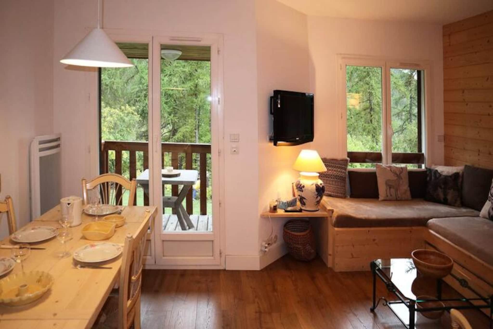Mitt i den förtrollande lärkskogen i Les Orres 1650 erbjuder denna charmiga duplexlägenhet en fridfull alpin tillflyktsort med hisnande utsikt över bergen. Bara 800 meter från ortens centrum, tillgängligt via en gratis vinterbuss, kombinerar den lugn och ro med bekvämlighet, vilket gör den till en perfekt tillflyktsort för familjer och små grupper som söker en minnesvärd semester i de franska Alperna. Tänk dig att vakna upp till den friska bergsluften och skogens gyllene nyanser, redo att utforska den omgivande skönheten. Lägenheten rymmer bekvämt upp till sju gäster i sina omsorgsfullt utformade utrymmen. På bottenvåningen hittar du en inbjudande entréhall med två våningssängar, ett modernt duschrum och en separat toalett. Det mysiga vardagsrummet har en hörnbäddsoffa med två utdragbara enkelsängar, sömlöst ansluten till ett fullt utrustat kök med öppen planlösning, perfekt för att laga rejäla måltider efter en dag av äventyr. Gå ut på den sydvästvända balkongen för att njuta av den fantastiska utsikten över det alpina landskapet. På övervåningen väntar ett rymligt sovrum på vinden, komplett med en dubbelsäng, en enkelsäng och ett eget badrum med toalett. Ytterligare bekvämligheter inkluderar en tvättmaskin och ett praktiskt skidskåp. Läget är idealiskt för att utforska det pulserande centrumet, som erbjuder butiker, restauranger och afterski-aktiviteter, allt bara en kort bussresa bort. På vintern kan du njuta av enkel tillgång till backarna och skidanläggningarna, medan sommaren förvandlar området till en fristad för vandring, mountainbike och naturutforskning. Oavsett om du söker spännande utomhusäventyr eller lugn avkoppling, erbjuder denna duplexlägenhet den perfekta basen för din alpina flykt. Skapa oförglömliga minnen omgivna av den majestätiska skönheten i Les Orres 1650.