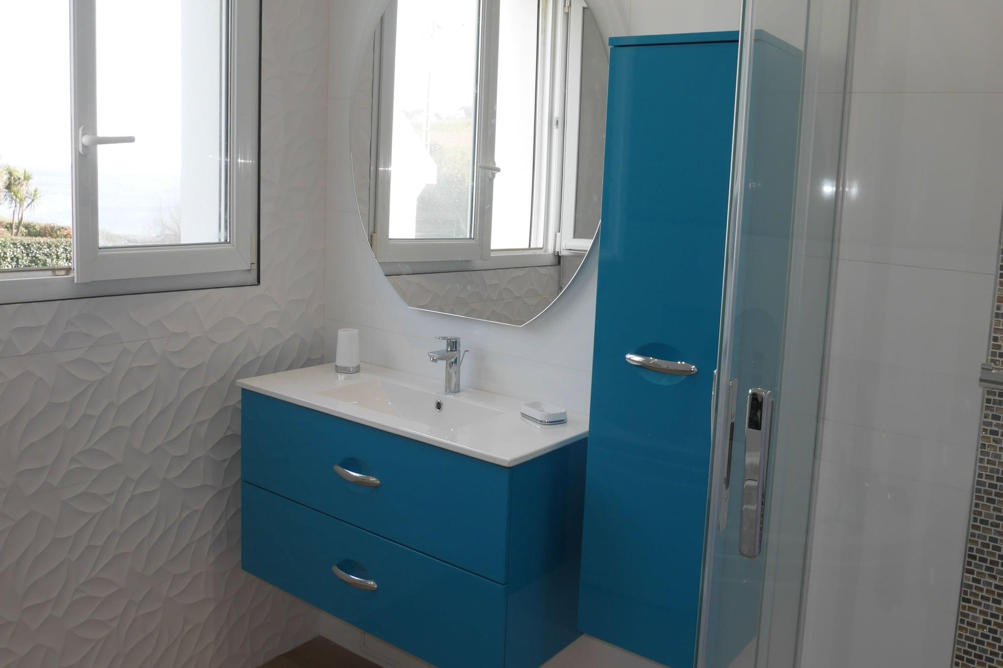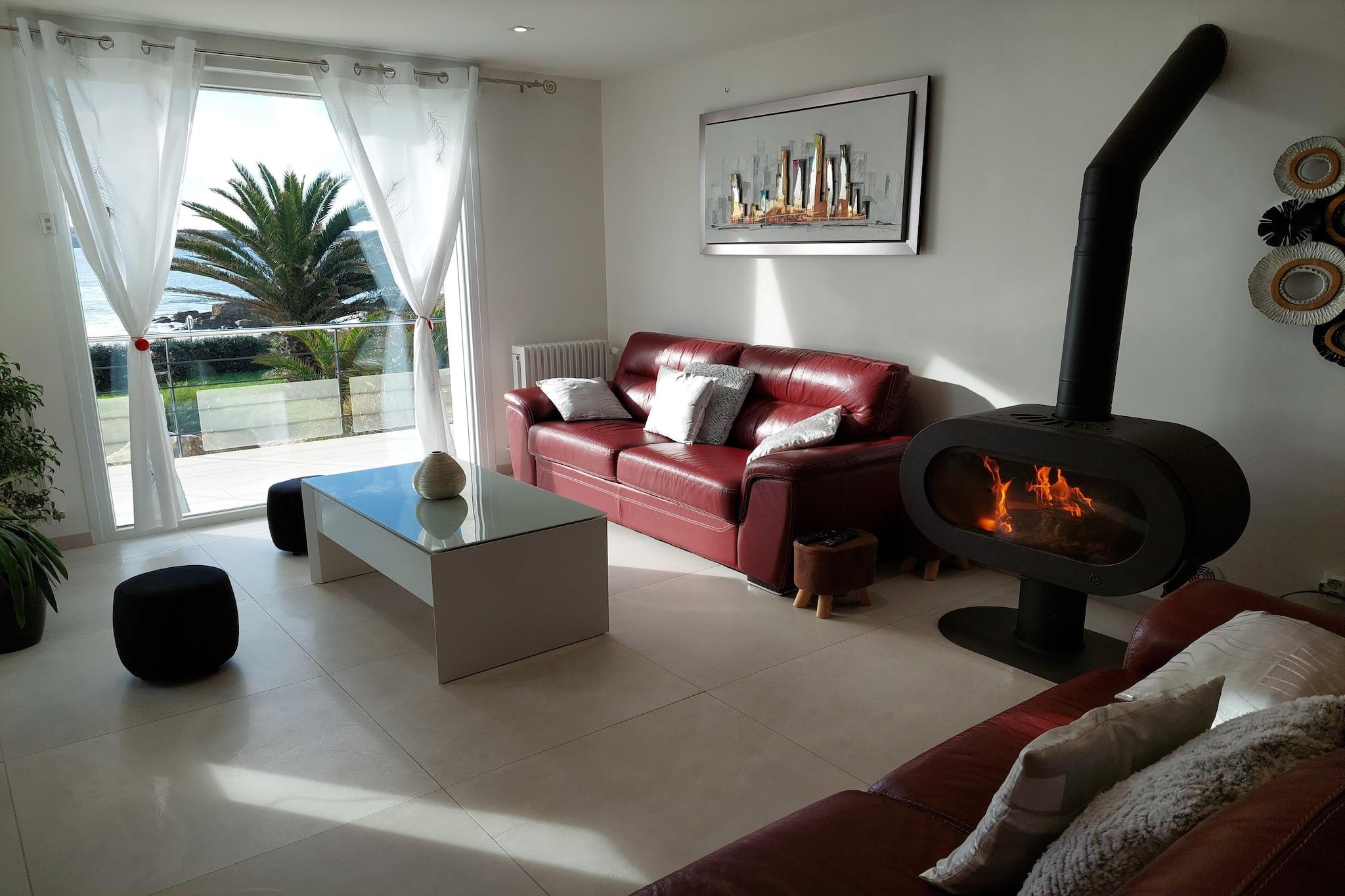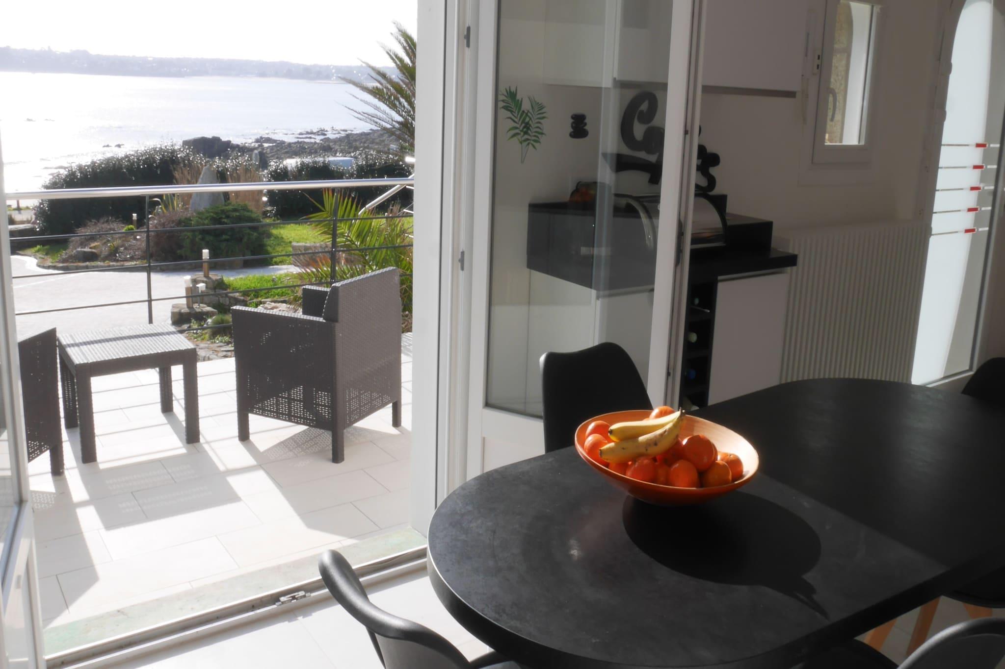 Havet så långt ögat når! Detta moderna, renoverade semesterhus erbjuder ett toppläge och en fantastisk panoramautsikt över havet och sandstranden framför det. Perfekt för en oförglömlig strandsemester i Bretagne. Fritidshuset, som är klassiskt från utsidan, totalrenoverades 2021 och erbjuder med sina fem sovrum utmärkt komfort och mycket avskildhet. Från det rymliga vardagsrummet och nästan alla rum i det moderna huset kan du njuta av en underbar 180° panoramautsikt över havet, sandstranden och Fort de Bertheaume. När vädret är klart sträcker sig utsikten till halvön Crozon med dess klippformationer, Tas de Pois. Först på morgonen kan du korsa kustvägen med en handduk över axeln och ta ett uppfriskande bad, vid lågvatten lockar lerbottnen. Långdistansvandringsleden GR 34, precis utanför dörren, följer hela Finistères kustlinje. Trégana och Plougonvelin är familjebadorter i spetsen av Finistère, kända bland annat för den spektakulära utsiktsplatsen vid Pointe St. Mathieu. Från ruinerna av det gamla klostret och den lättillgängliga fyren kan du njuta av en magnifik utsikt över hela det omgivande kustområdet. En del av platsen är också Fort de Bertheaume, en fästning från 1500-talet, som är öppen för besökare idag. I fortet finns en friluftsteater och en klätterpark, till kommunen hör också flera vackra sandstränder.