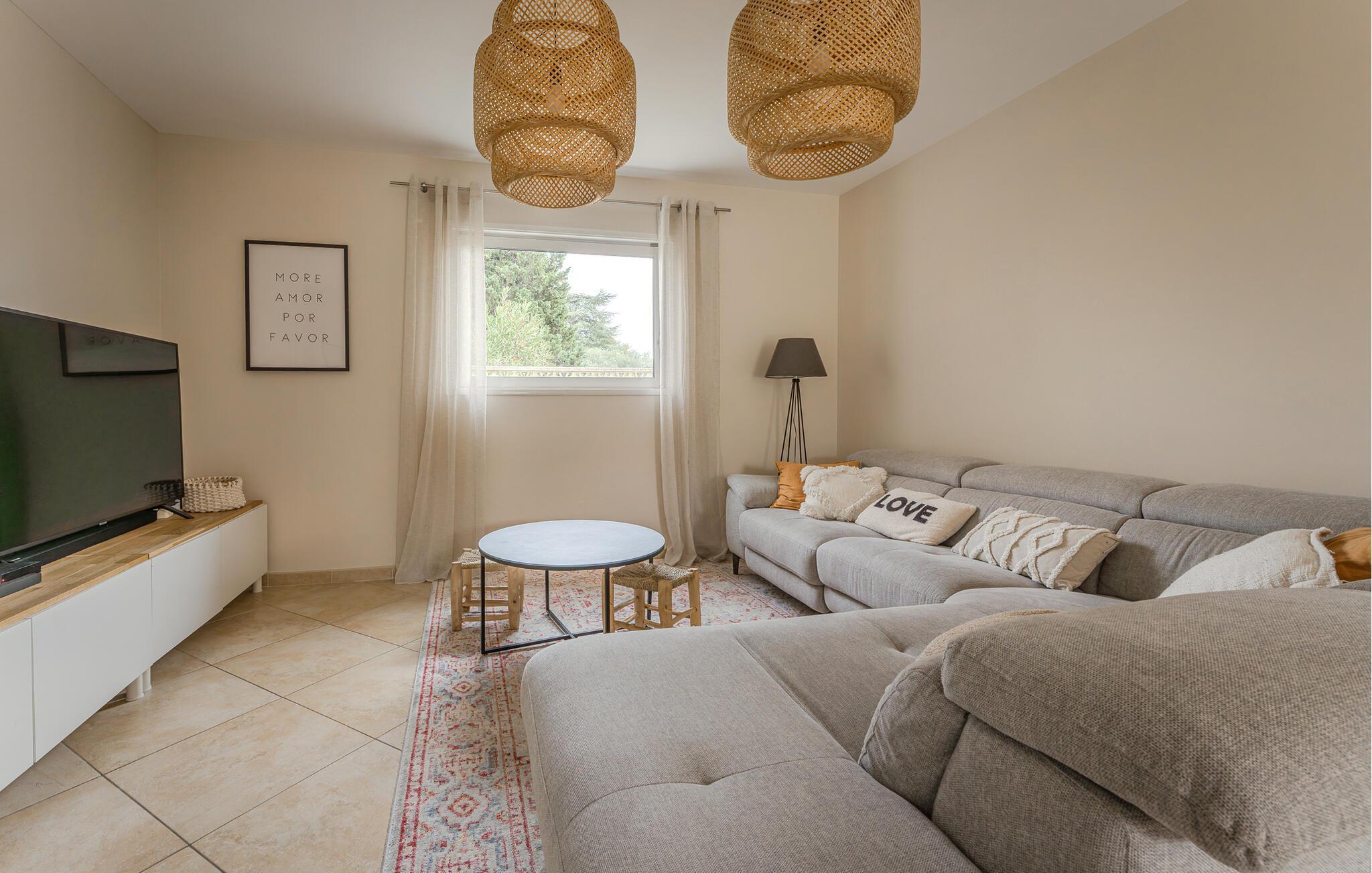 Koppla av i det moderna semesterhuset med pool och stor trädgård.